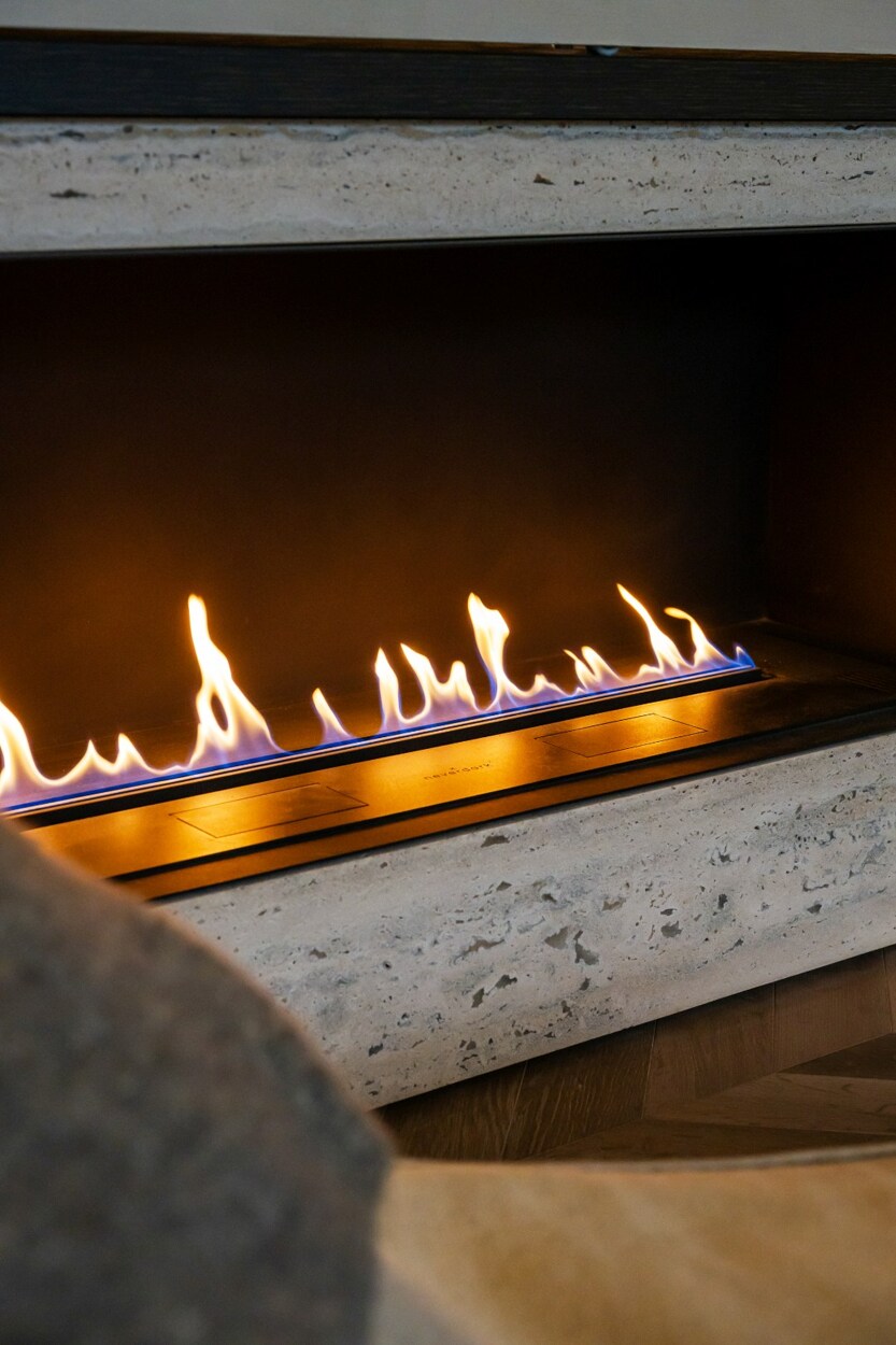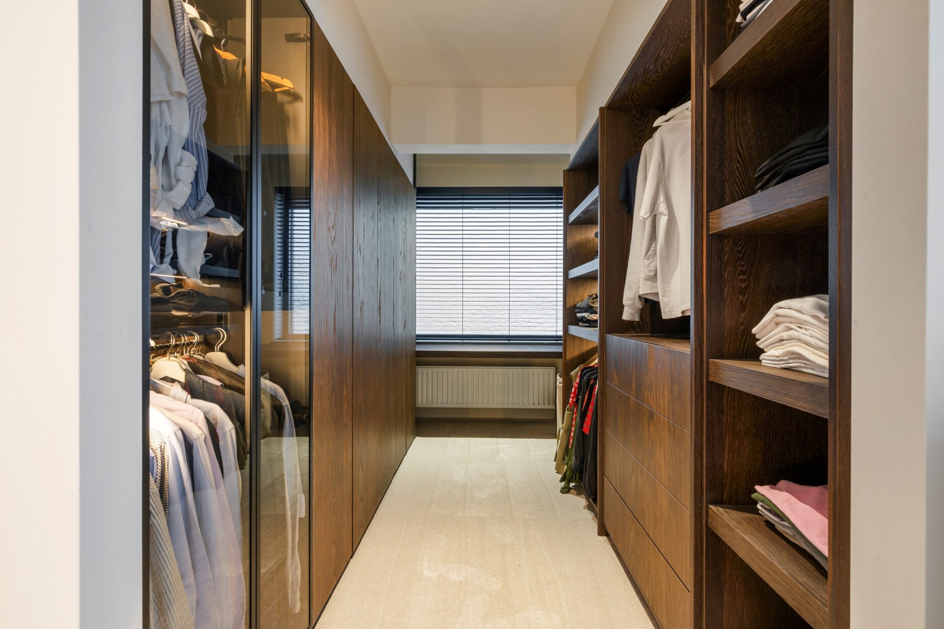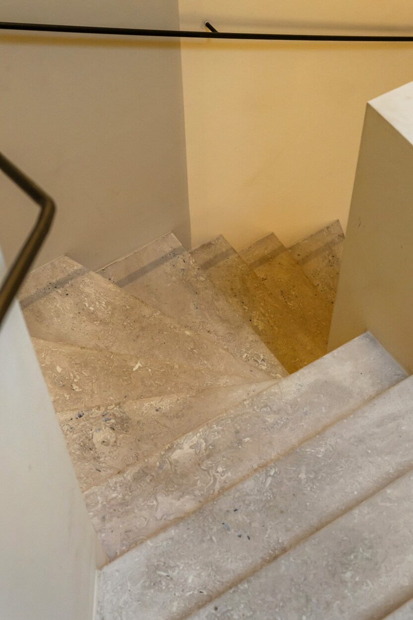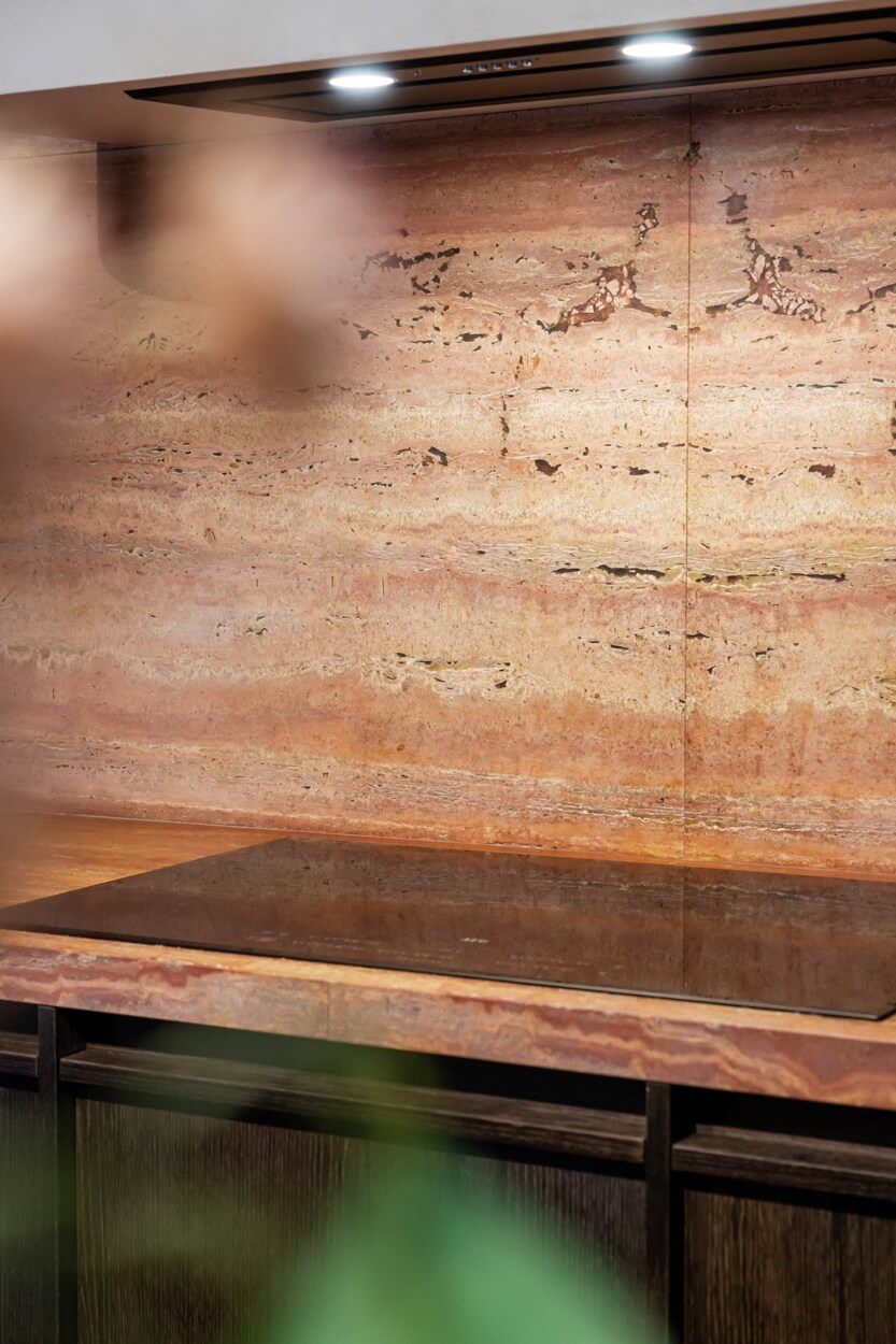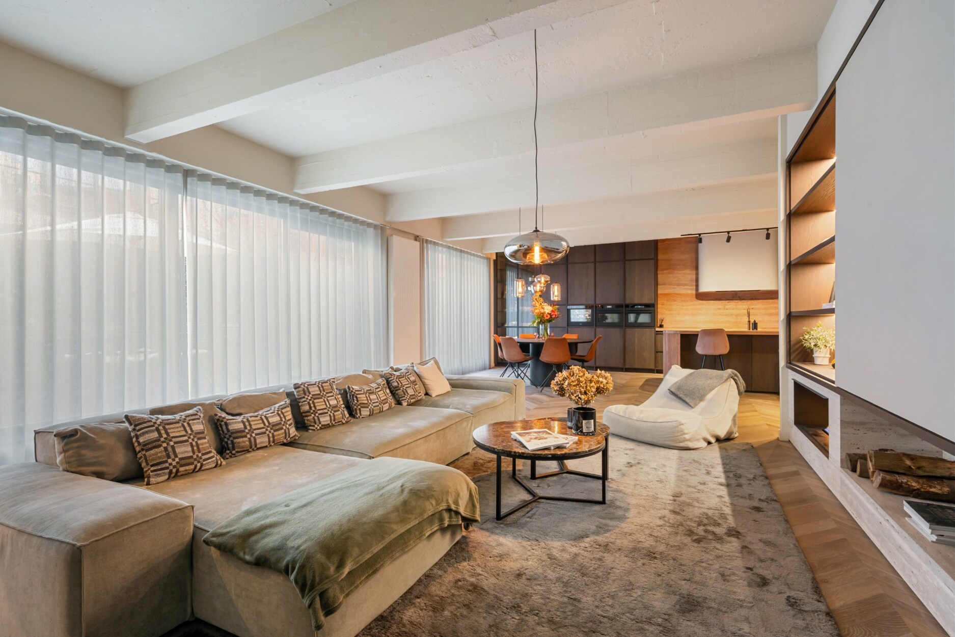 Binnen verwelkomt de inkomhal u met een trap en rechtstreekse toegang tot de kelderverdieping met ondergrondse parkeerplaats. De leefruimte met open keuken werd ingericht met een bijzonder verfijnde smaak: een elegante bio-ethanolhaard, warme fineer houten kasten en luxueuze roze travertin die het geheel een zachte, moderne luxe geeft. De keuken is volledig uitgerust met hoogwaardige toestellen (Quooker, combi-oven, koelkast, diepvries, wijnkoeler en vaatwasser) en beschikt aansluitend over een praktische berging en een knusse koer.