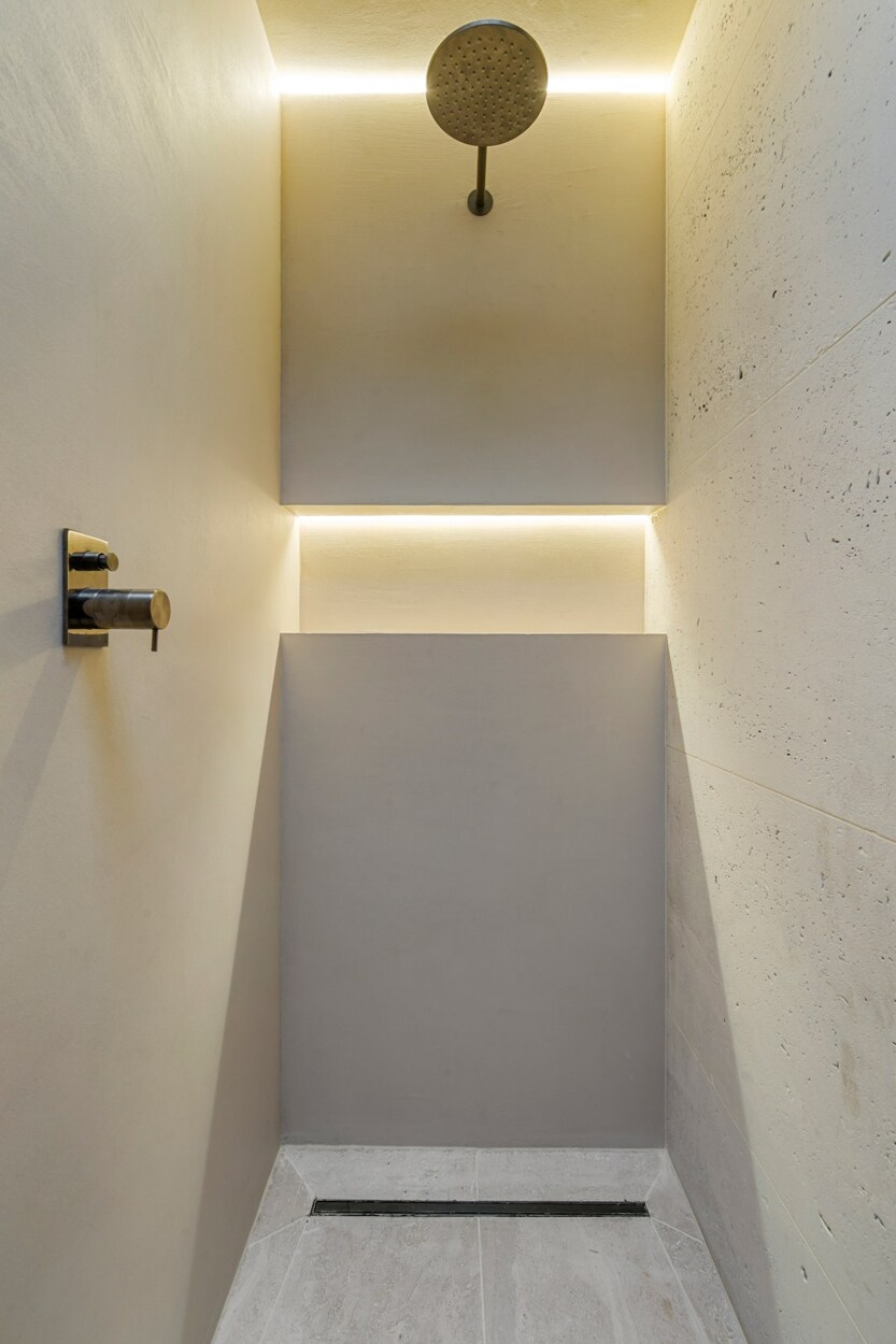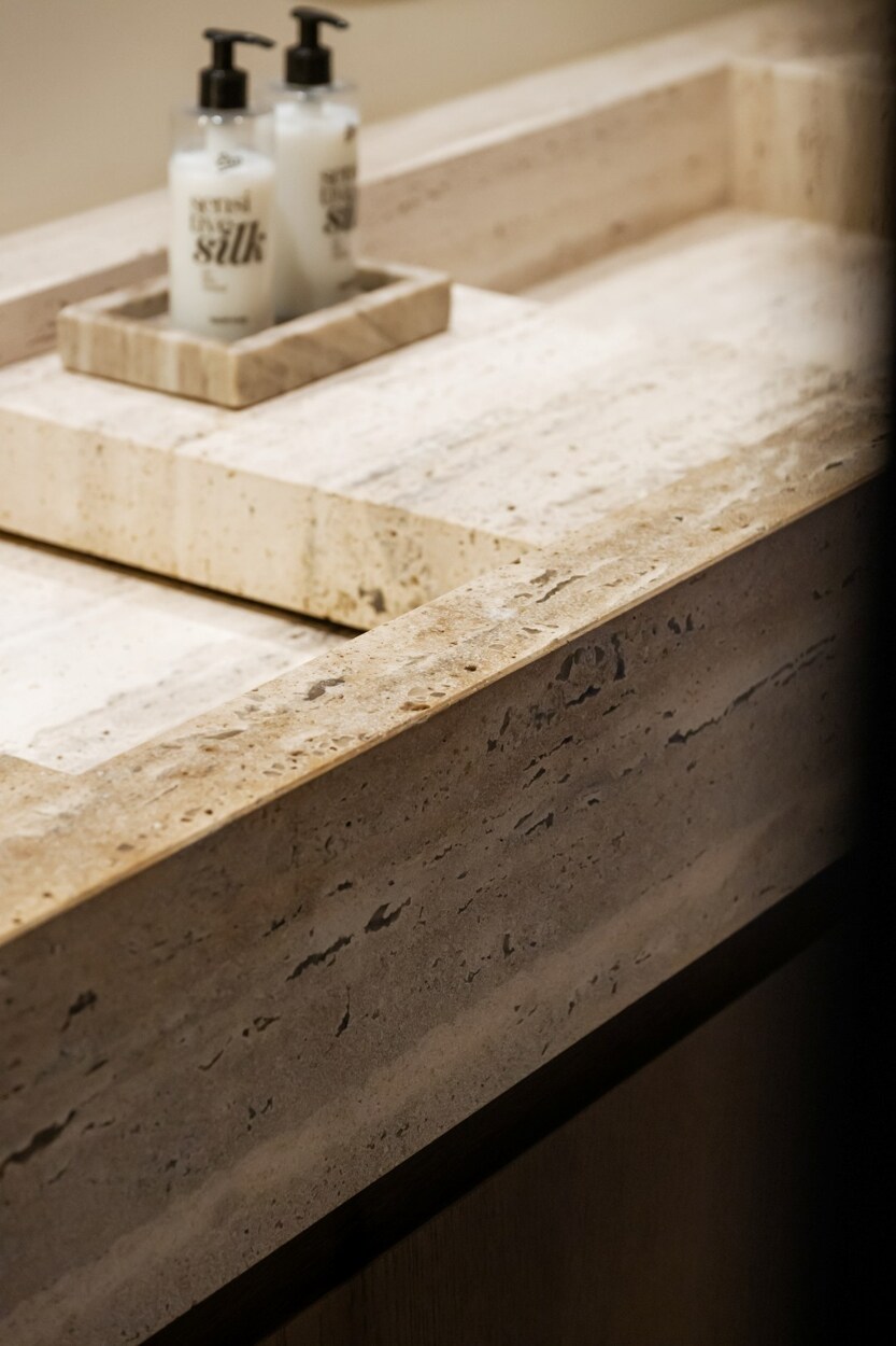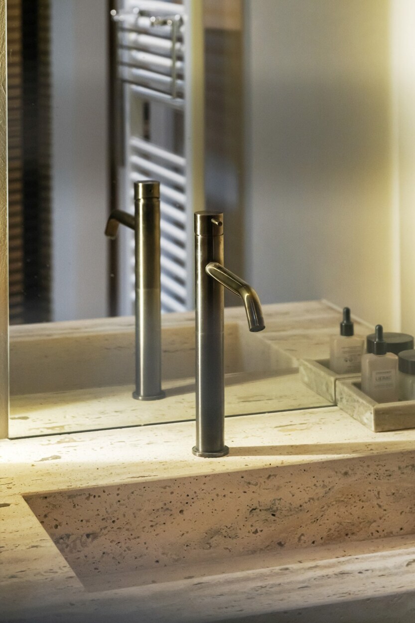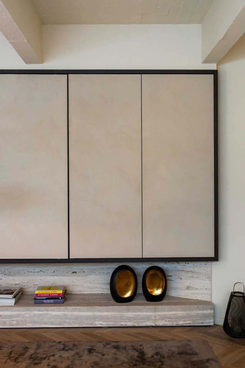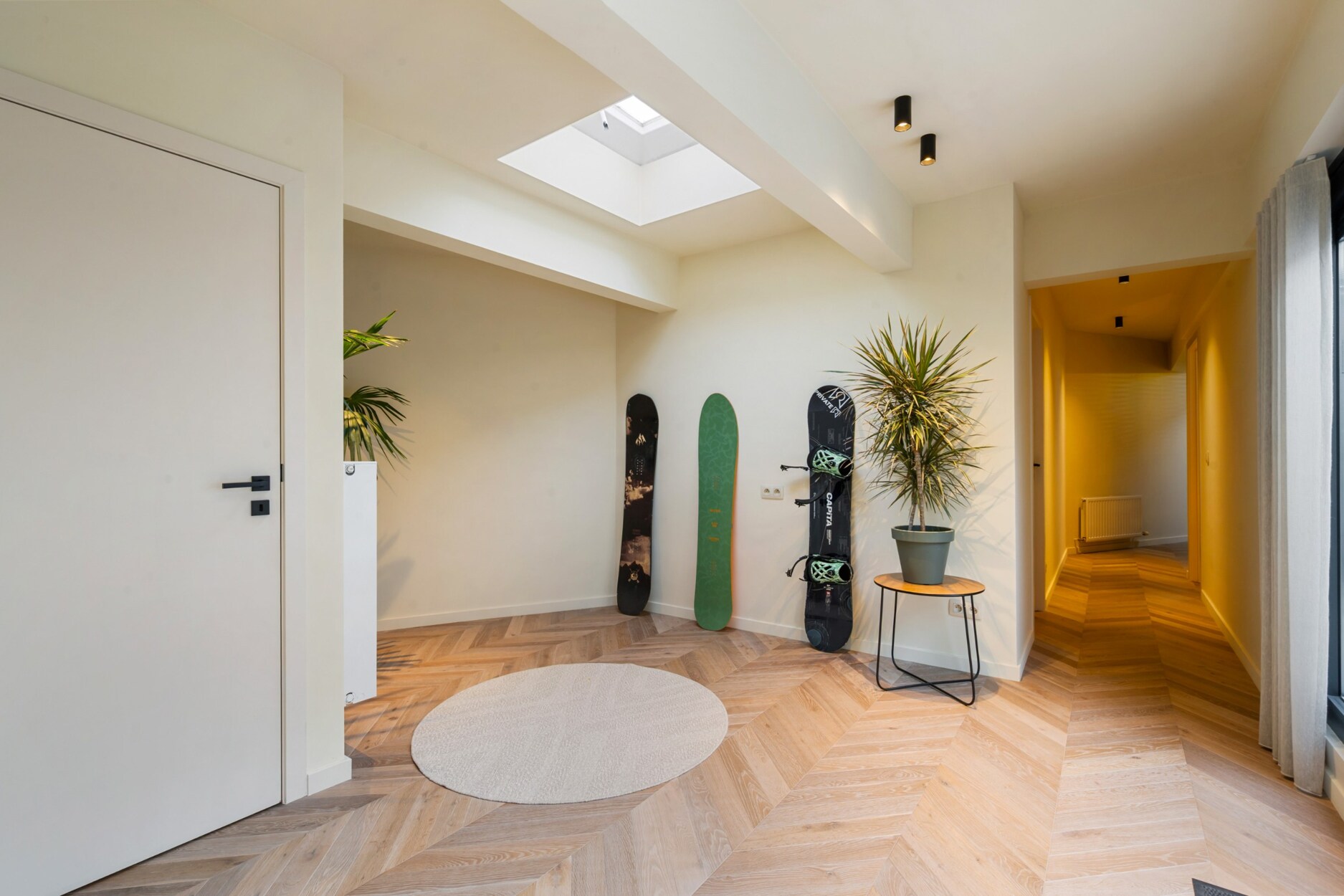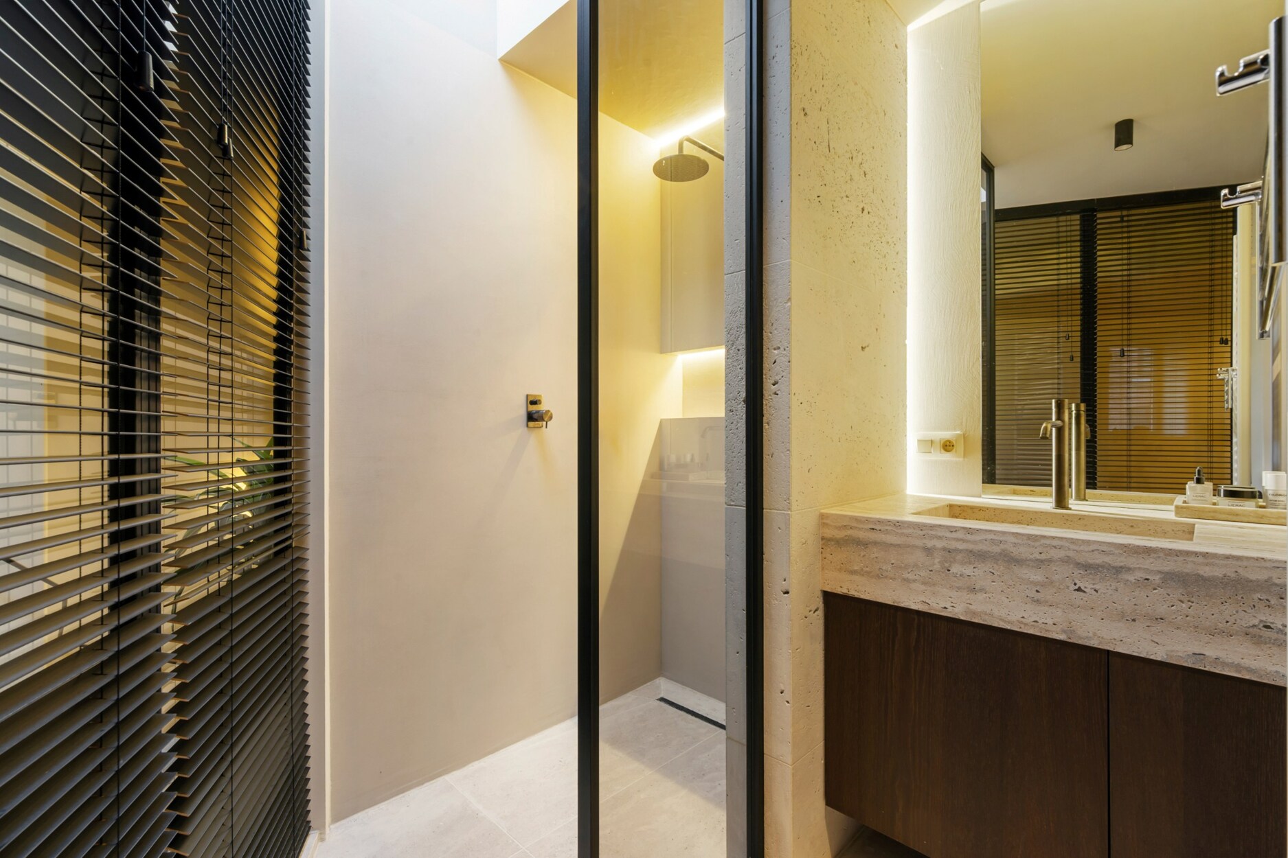 Binnen verwelkomt de inkomhal u met een trap en rechtstreekse toegang tot de kelderverdieping met ondergrondse parkeerplaats. De leefruimte met open keuken werd ingericht met een bijzonder verfijnde smaak: een elegante bio-ethanolhaard, warme fineer houten kasten en luxueuze roze travertin die het geheel een zachte, moderne luxe geeft. De keuken is volledig uitgerust met hoogwaardige toestellen (Quooker, combi-oven, koelkast, diepvries, wijnkoeler en vaatwasser) en beschikt aansluitend over een praktische berging en een knusse koer.
