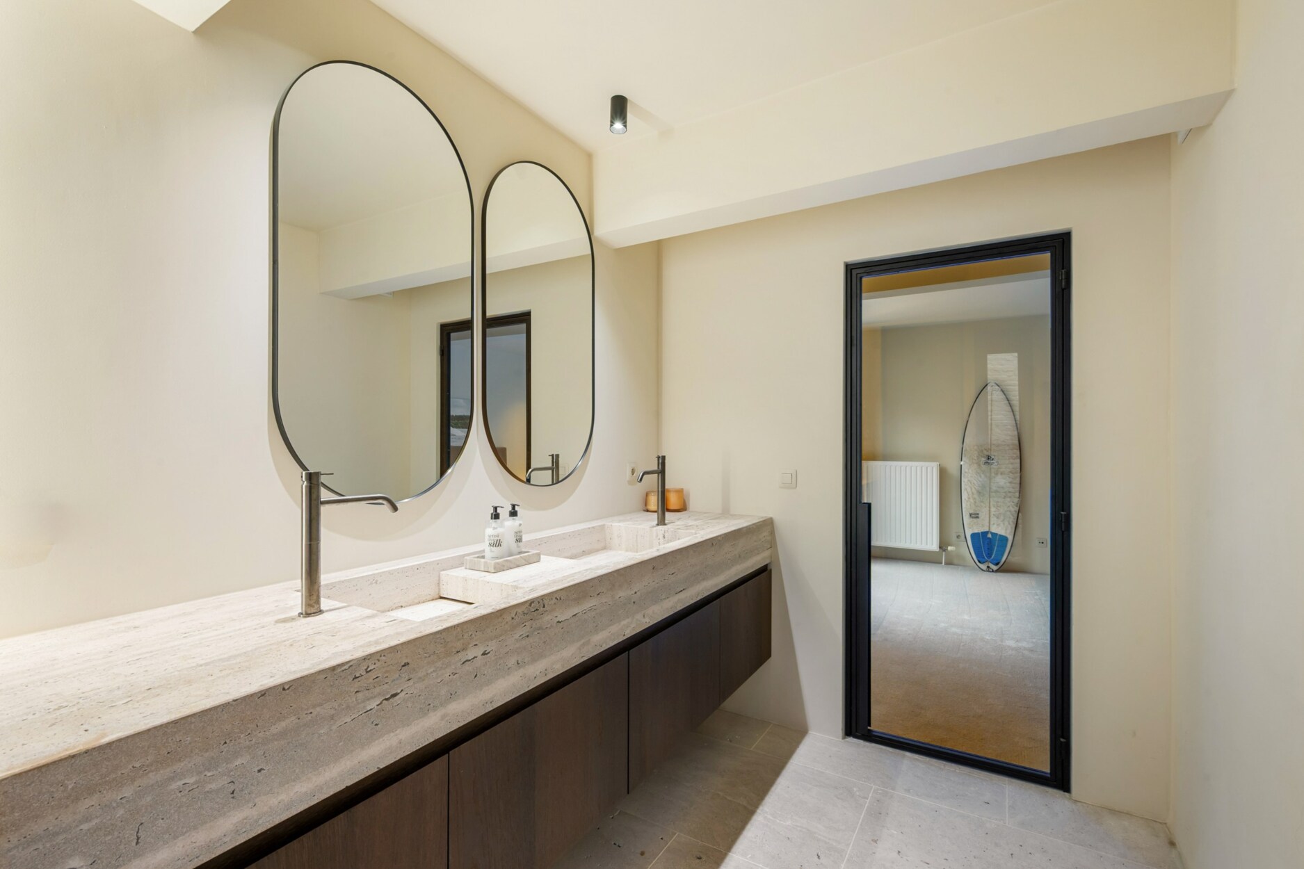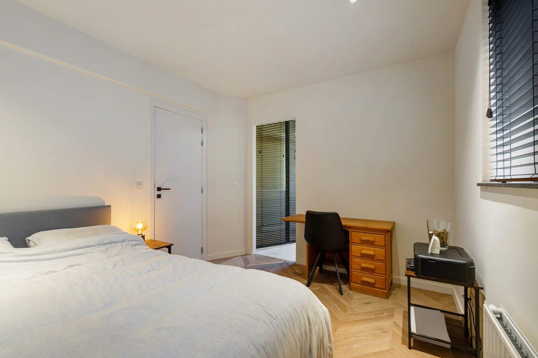 De 1e verdieping herbergt 2 volwaardige slaapkamers, elk met toegang tot het zonovergoten terras én een en-suite badkamer met douche. De hoofdslaapkamer beschikt bovendien over een elegante inloopdressing. Op dit niveau bevindt zich eveneens een extra berging / wasplaats, apart toilet en een open ruimte die zich perfect leent als bureau of eventuele 3e slaapkamer.
