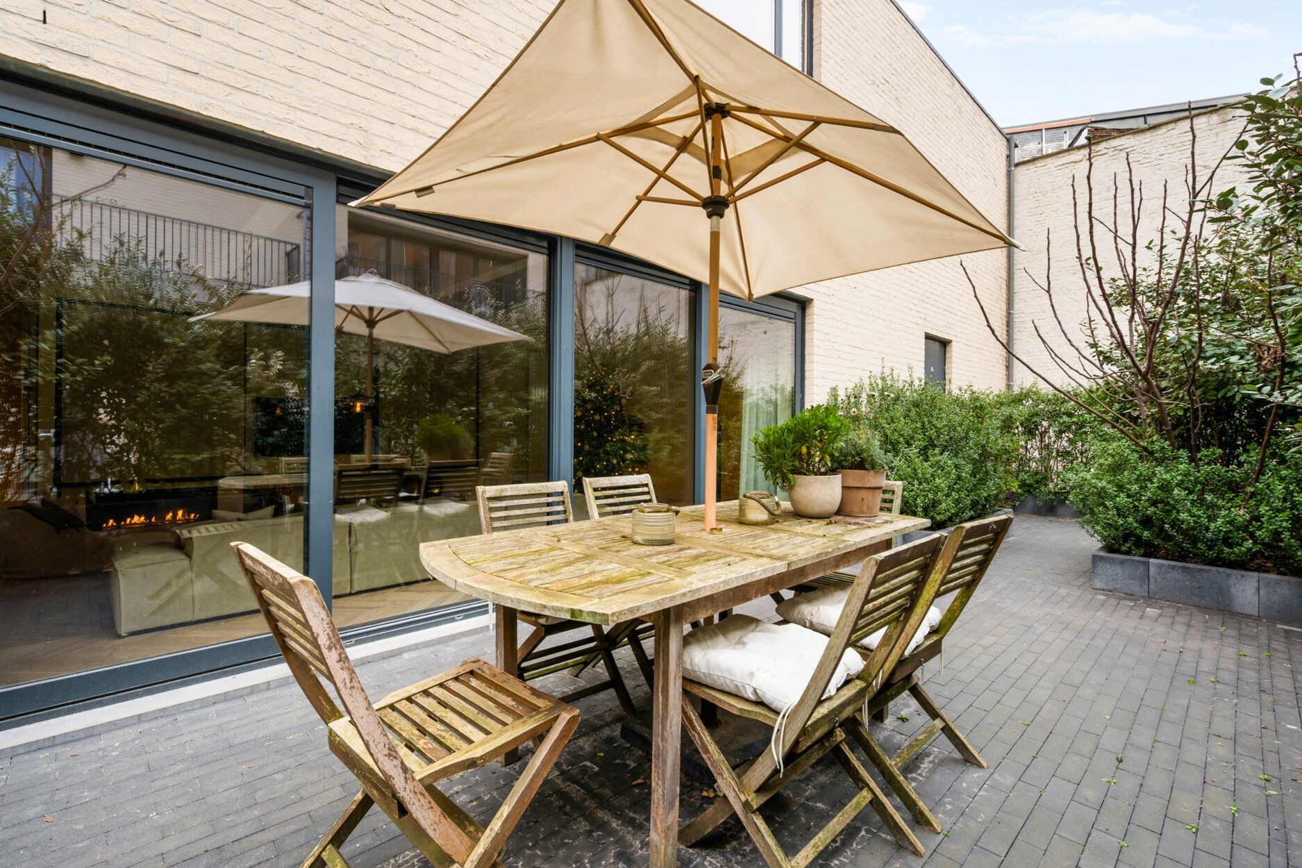 Via de Lambermontstraat betreedt men het eigendom, discreet gelegen achter een voorliggend appartementsgebouw. Het eerste terras aan de voorzijde vormt meteen een sfeervolle buitenkamer — ideaal voor een ontbijt in de ochtendzon of gezellige diners met vrienden.