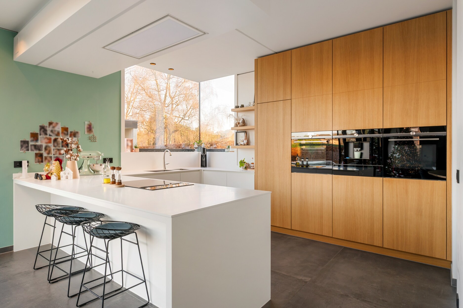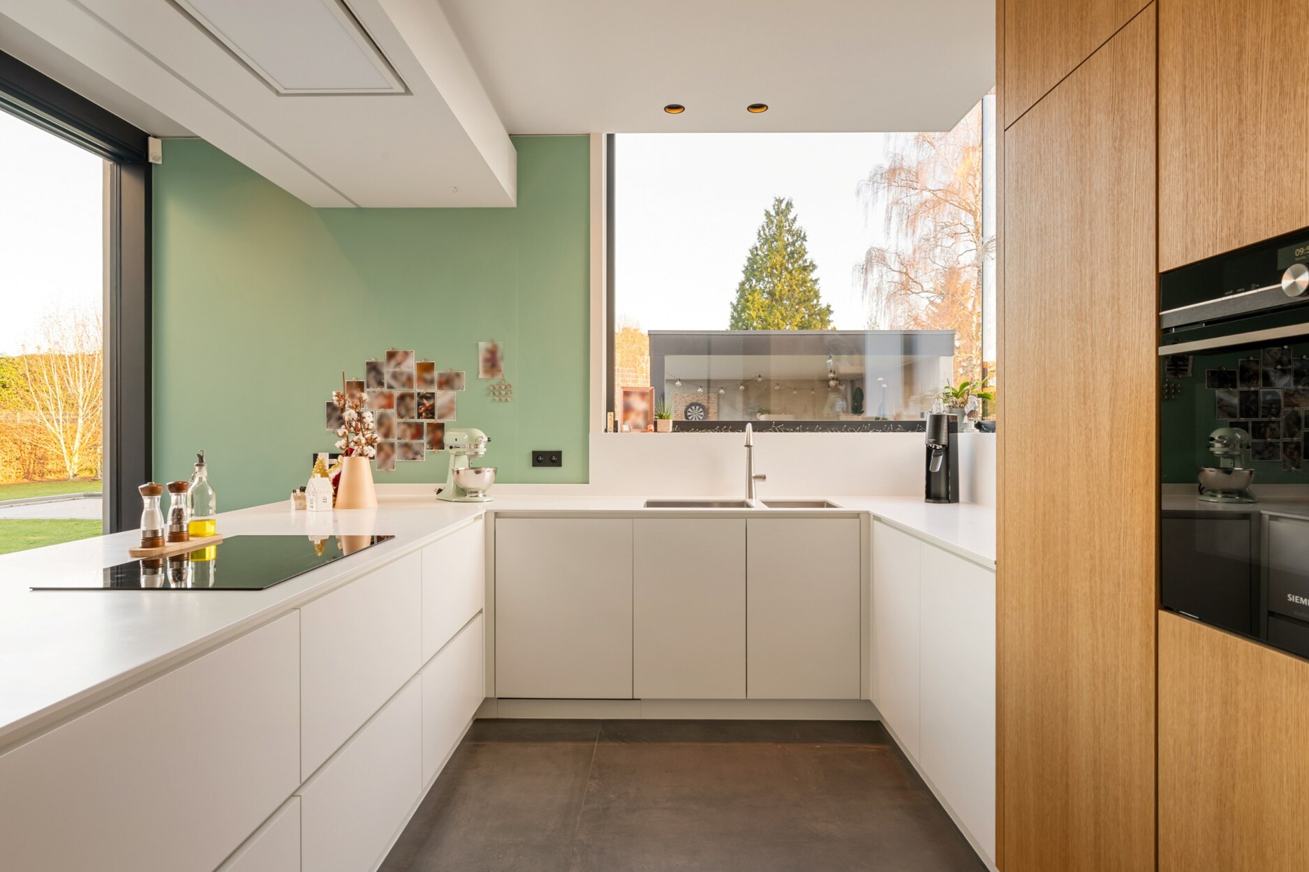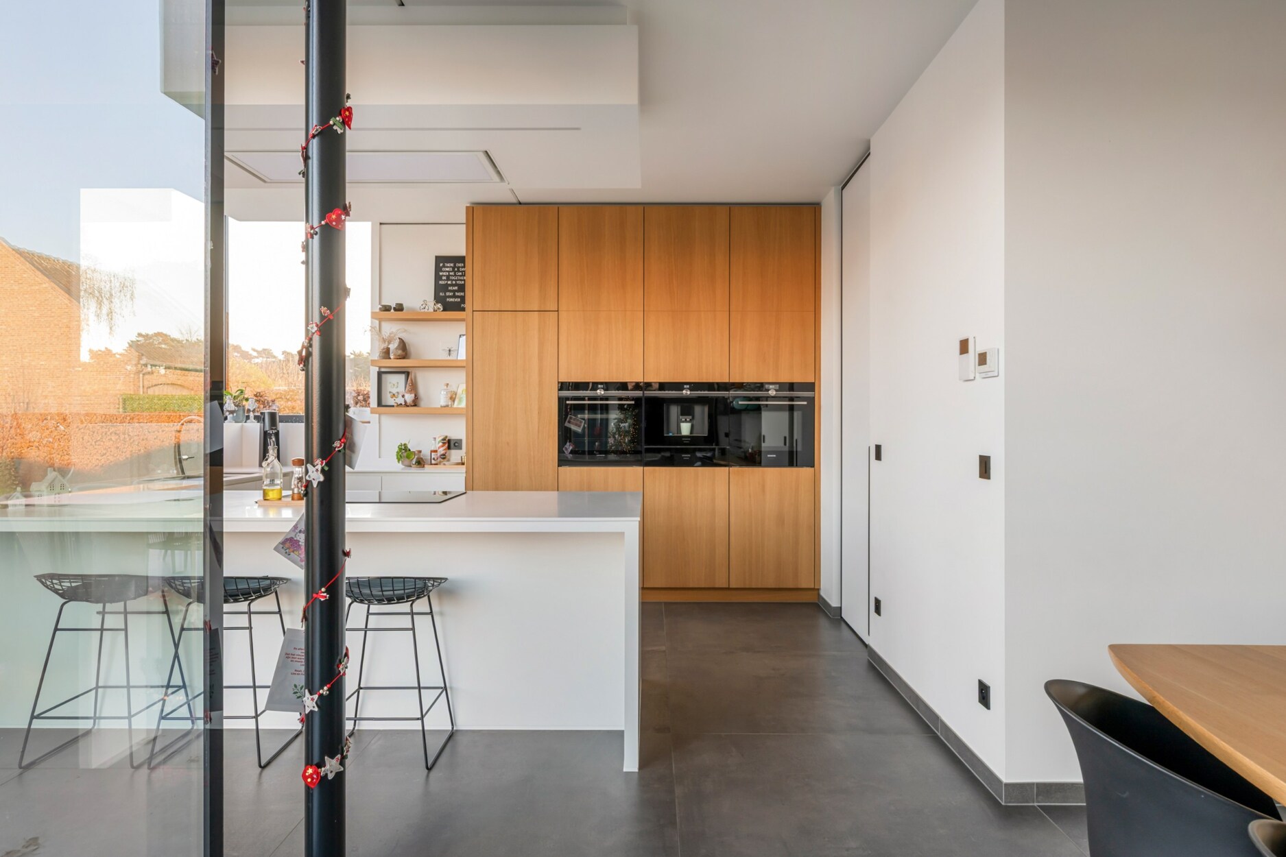De open keuken is een paradijs voor elke chef-kok, uitgerust met een ruim composiet werkblad, een ontbijtbar en hoogwaardige inbouwapparatuur: inductiekookplaat, dubbele spoeltafel, koel/vriescombinatie, microgolfoven, heteluchtoven, koffiemaker en vaatwasser. Van hieruit bereikt u de praktische wasplaats en de trap naar de ruime kelder. Deze functionele onderverdieping herbergt een heuse wijnkelder voor de liefhebber, een bergkelder met maatwerkkasten en een technische ruimte waar domotica, de drinkwaterput, de zwembadinstallatie, batterijen en de omvormer van de zonnepanelen centraal geregeld worden.