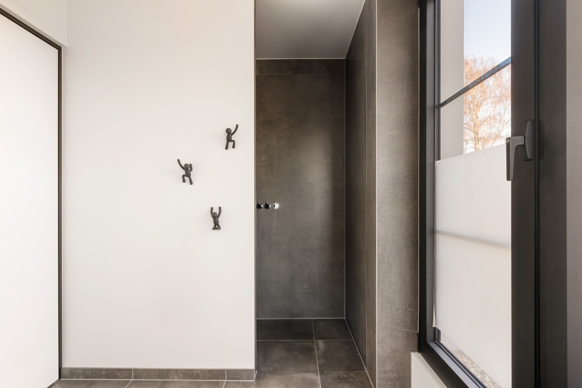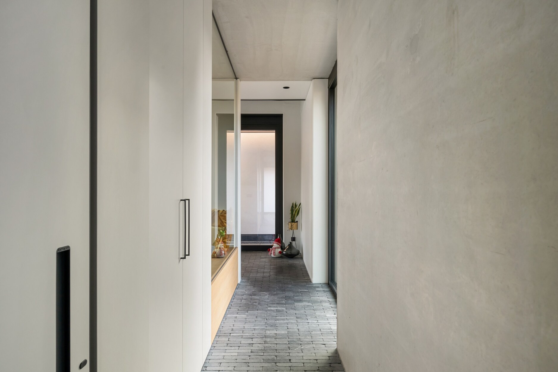 Bij aankomst leidt de glazen voordeur u naar een lichte inkomhal met een discrete vestiairekast, een gastentoilet en een gang die slim verbinding maakt met een afgesloten praktijkruimte, compleet met een aparte toegang – perfect voor de moderne professional.