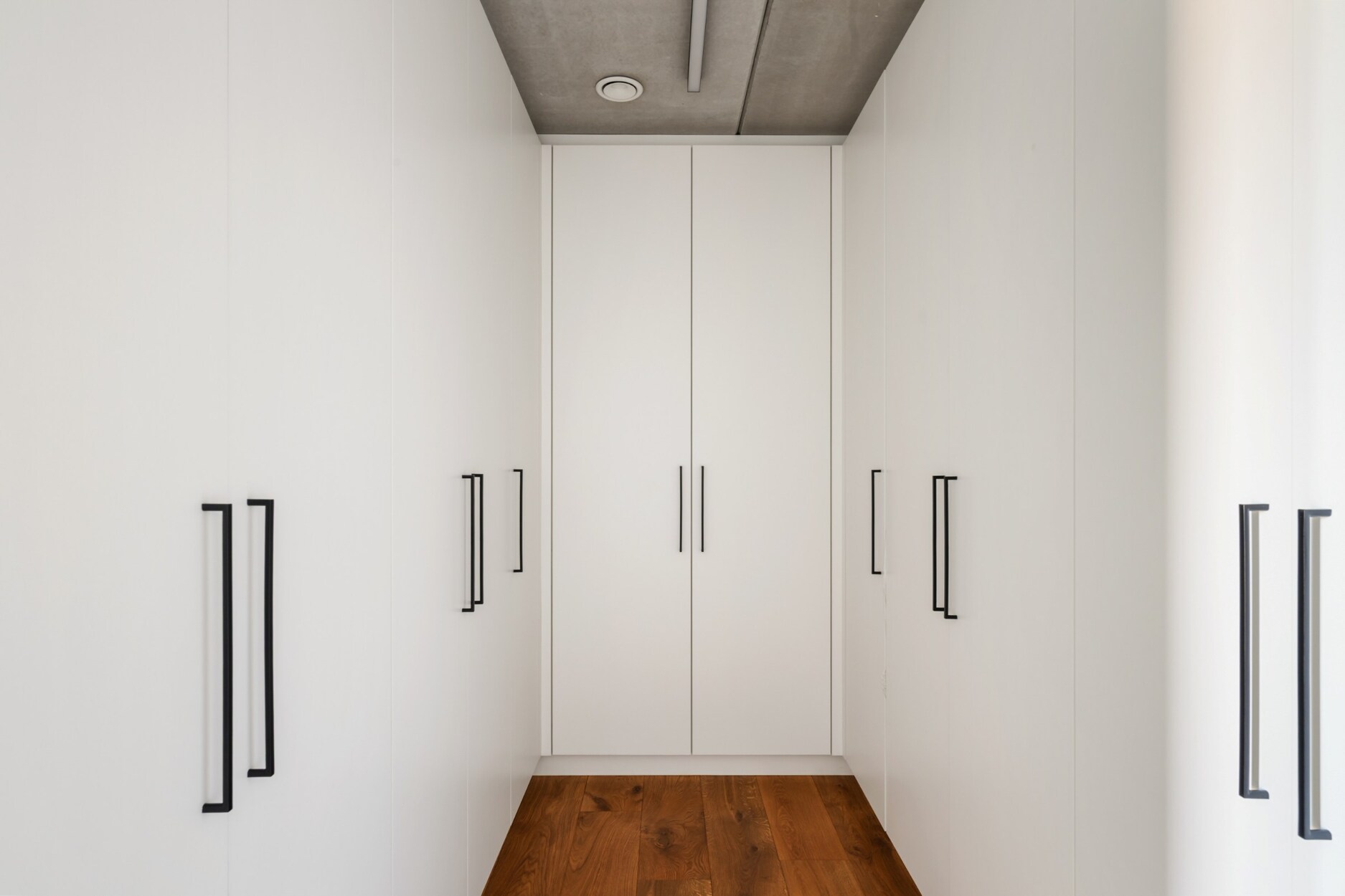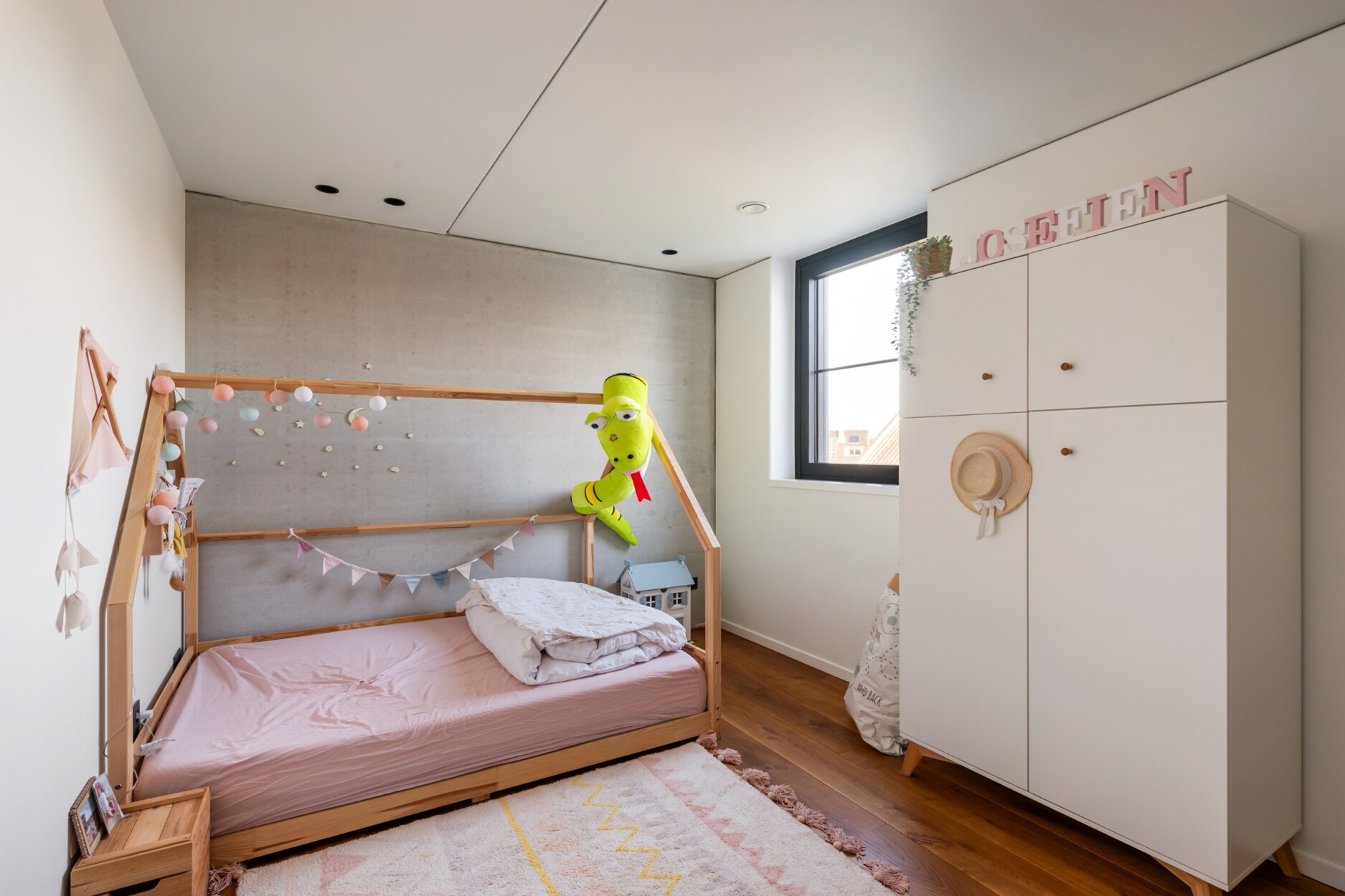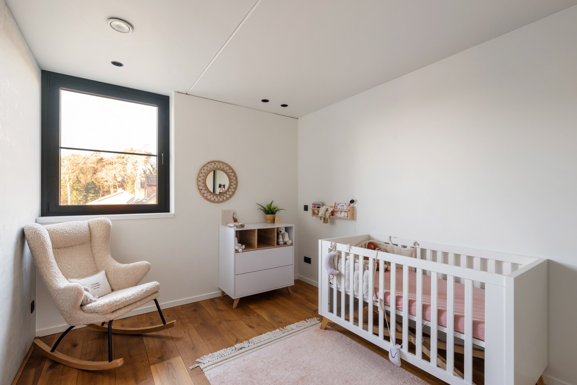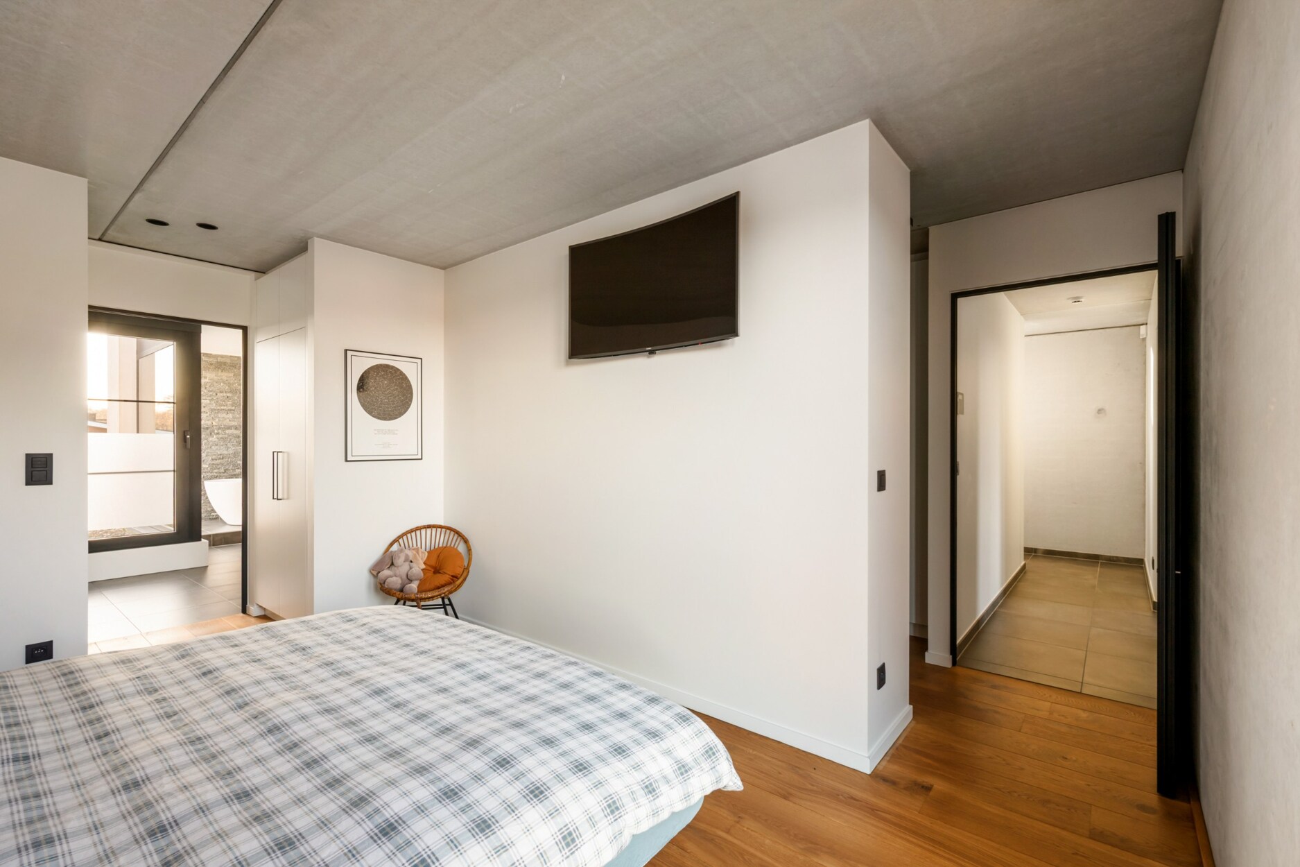 De zwevende trap begeleidt u naar de bovenverdieping. De overloop geeft toegang tot de luxueuze master suite, voorzien van een royale dressing en een ensuite badkamer die uitnodigt tot ontspanning. Geniet van een ovaal vrijstaand ligbad, een ruime inloopdouche en dubbele wastafels. De tweede en derde slaapkamer, beide met elegante parketvloeren en verduisteringsmogelijkheden, bieden comfort en privacy.