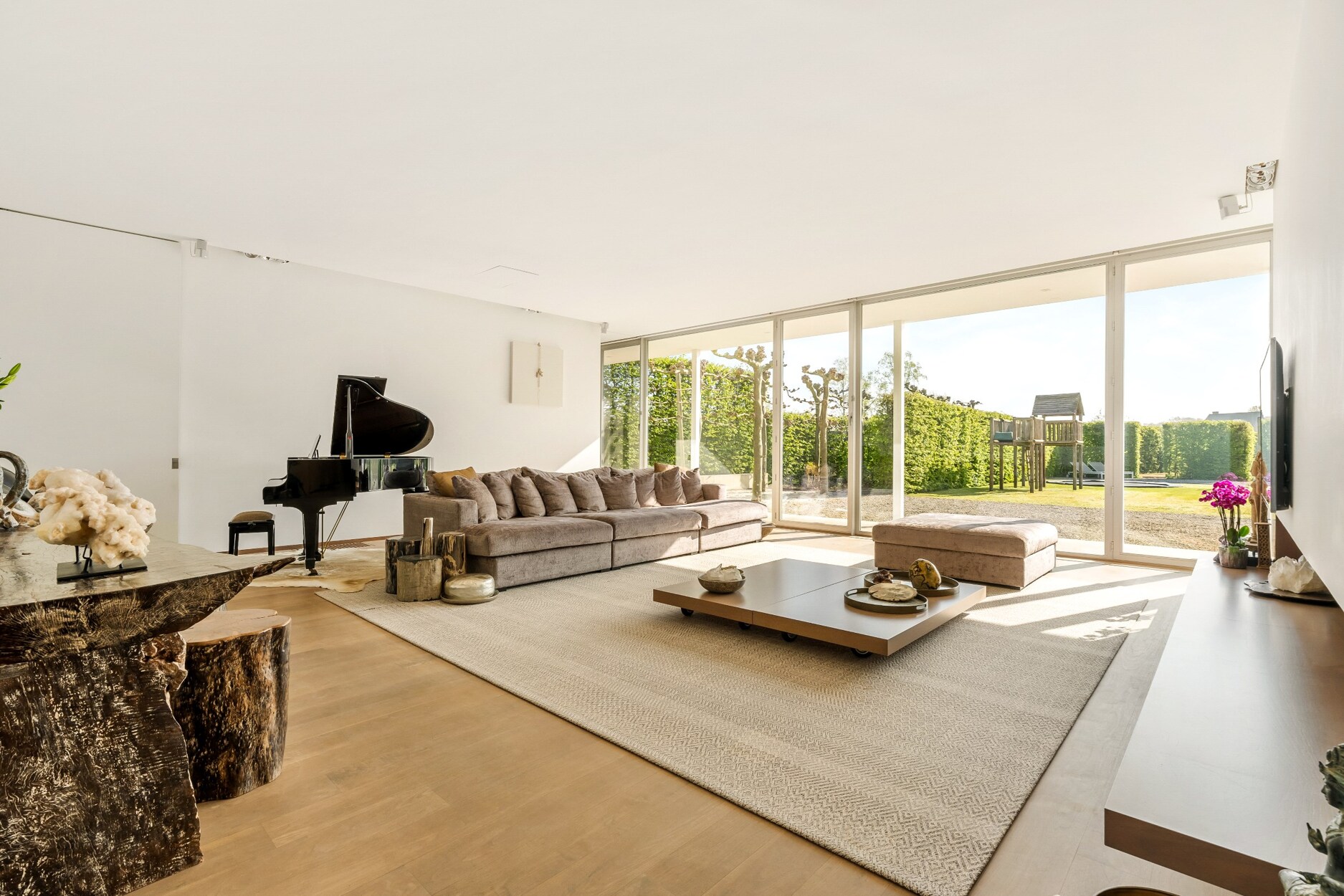 Via een stijlvolle inkomhal met vestiaire en gastentoilet bereikt u de villa. De grote pivot deuren brengen u naar de imposante woonkamer met hoge plafonds (3m) en een gezellige doorkijkhaard tussen de eetkamer en de zithoek. De moderne leefkeuken met minimalistisch design en natuurstenen werkblad is voorzien van alle comfort met oa een AGA kookfornuis voorzien van 4 ovens. De keuken staat in rechtstreeks contact met de overige leefruimte. Zo treft u hier nog een sfeervolle zithoek met aanpalend kantoor op parket, dewelke volledig kan worden afgesloten van de woonkamer. De grote raampartijen aan de volledige achterzijde van deze villa zorgen voor enorm veel daglicht. U geniet van een rechtstreekse toegang van de leefruimtes naar het overdekte terras aan de achterzijde. Van hieruit kunt u heerlijk genieten met zicht op uw schitterend aangelegde tuin.
