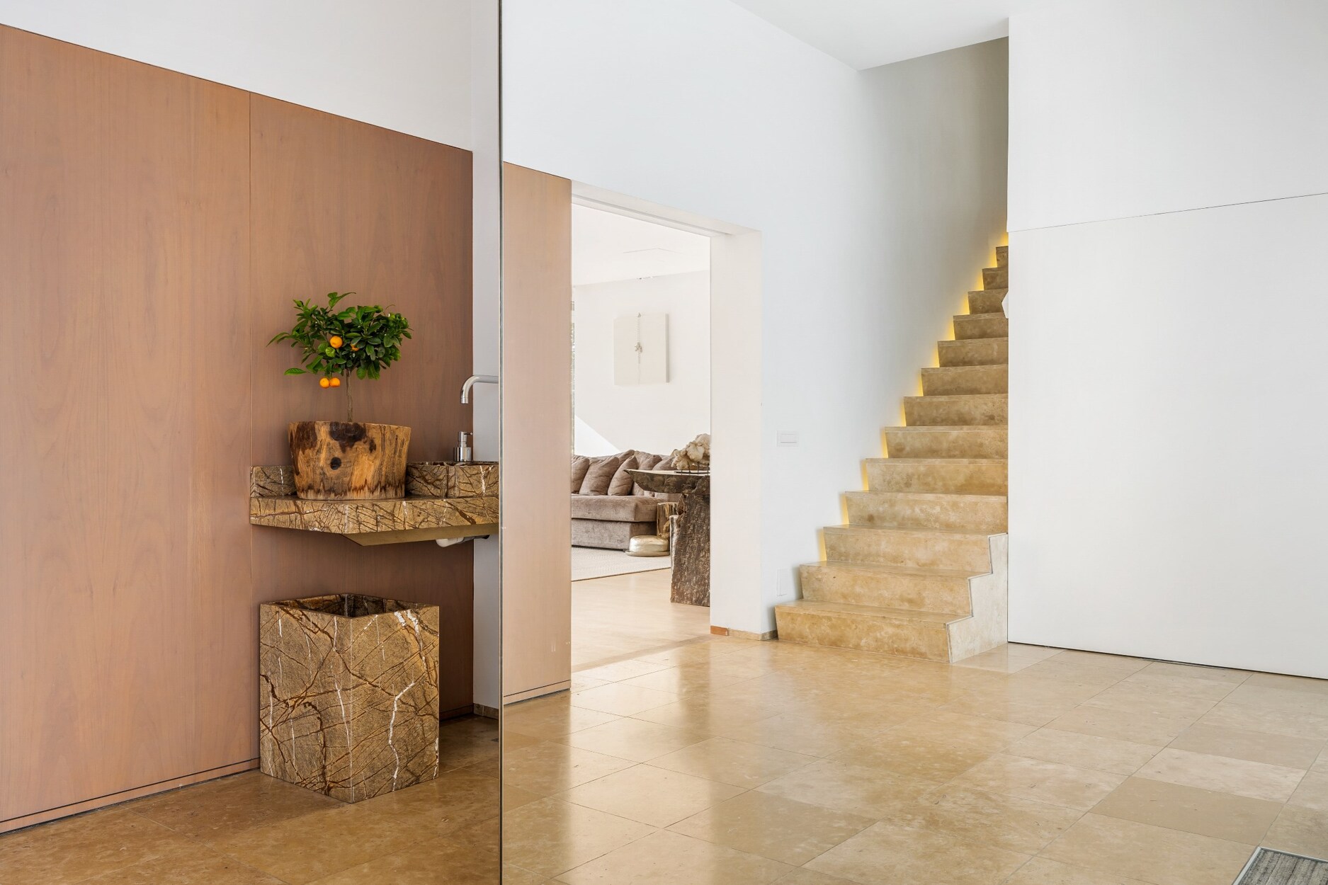 De zij-inkom biedt toegang tot het praktisch gedeelte van de villa. Hier treft u een volledig ingebouwde kastenwand, een badkamer met ruime inloopdouche en toilet. Via de hal bereikt u de dubbele garage met elektrische poort.