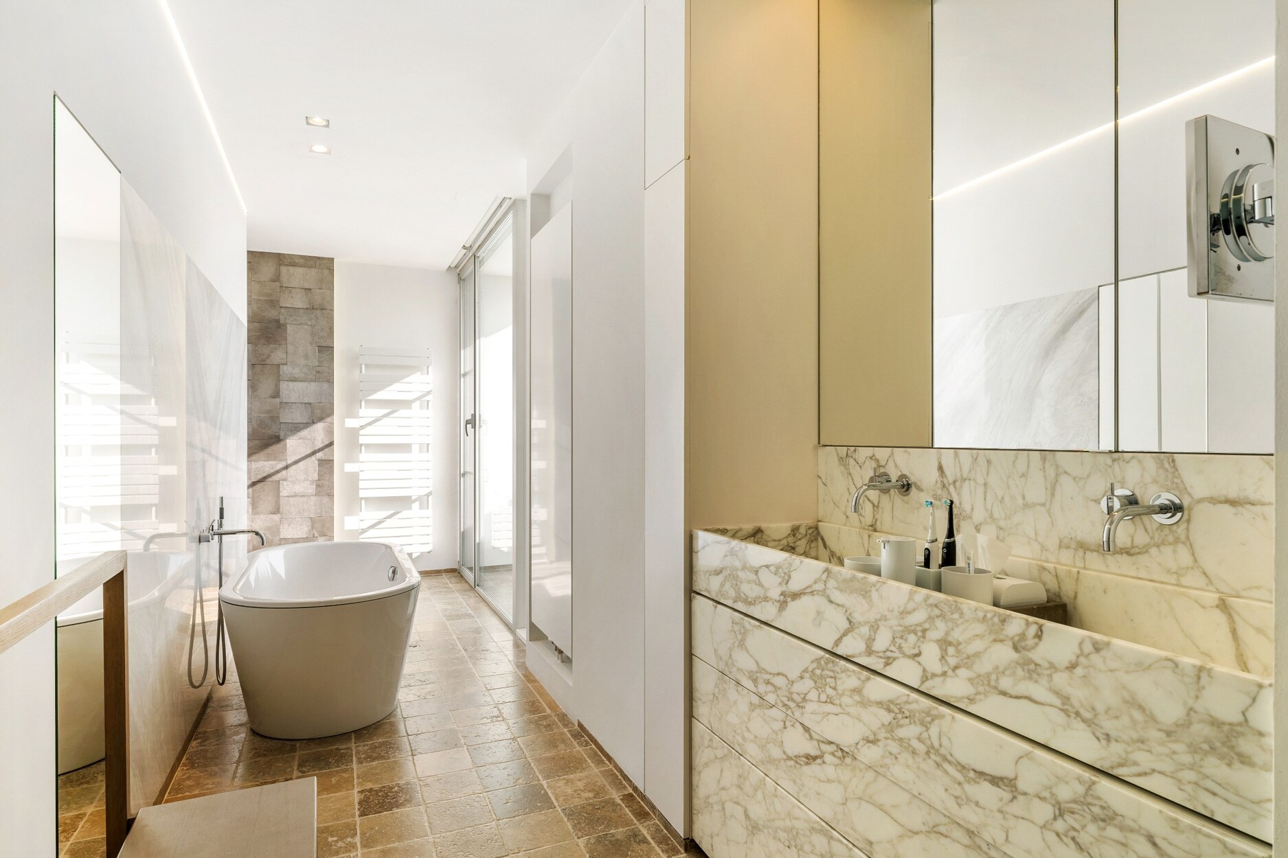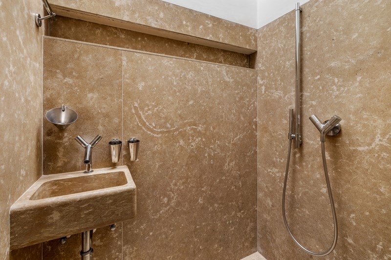 marmer, een Philippe Starck-ligbad en Vola-kranen. De inloopdouche werd recent nog gerenoveerd.