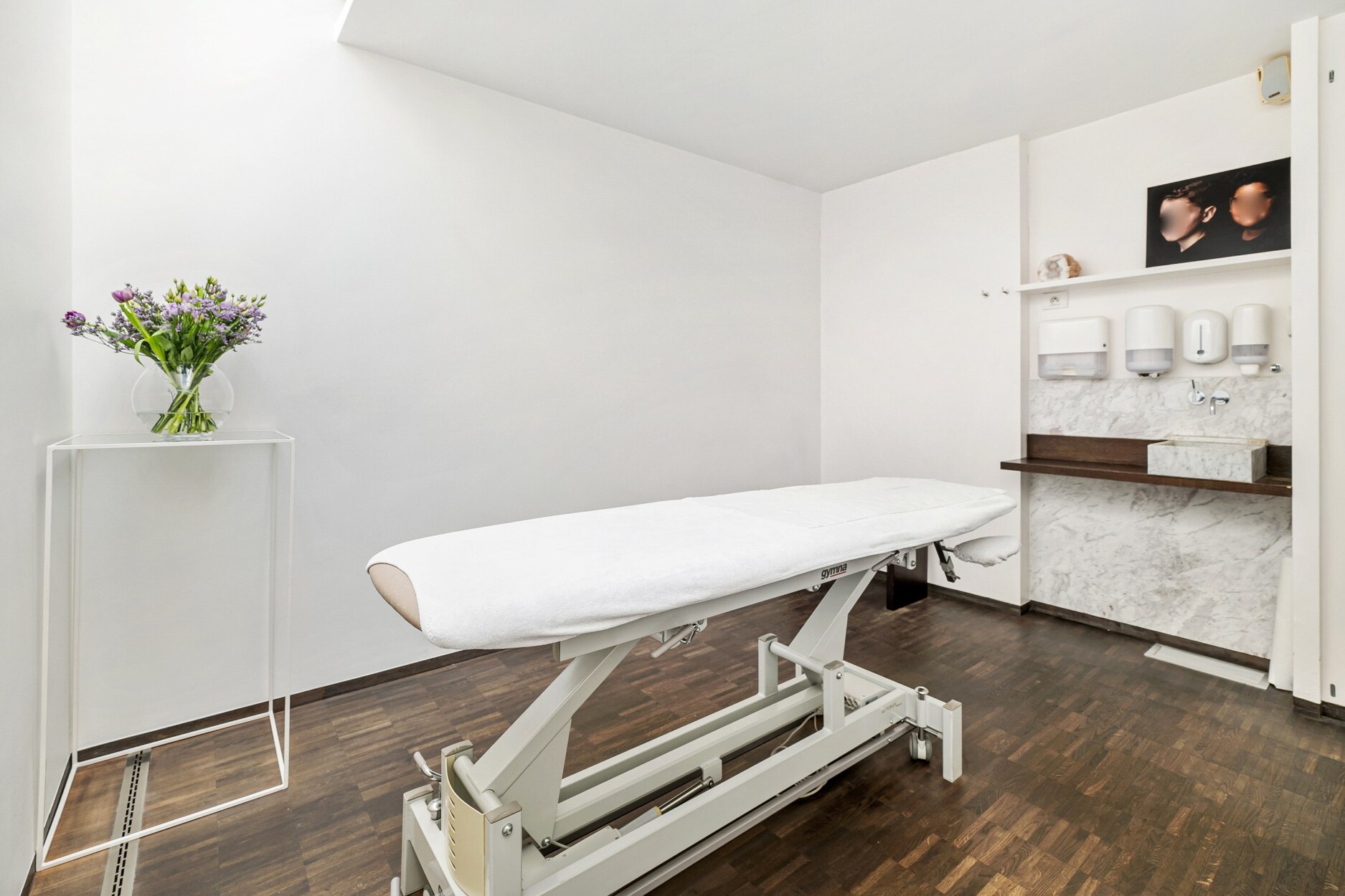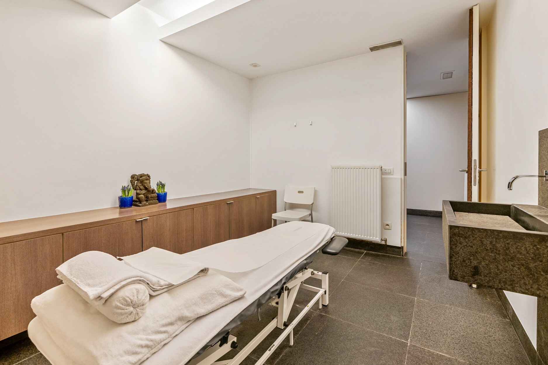Het praktijkgedeelte beschikt over een separate inkomhal met een wachtkamer en onthaalruimte. Hier bevinden zich 3 volledig uitgeruste behandelkamers/kantoren en een royale fitnessruimte/polyvalente ruimte.
