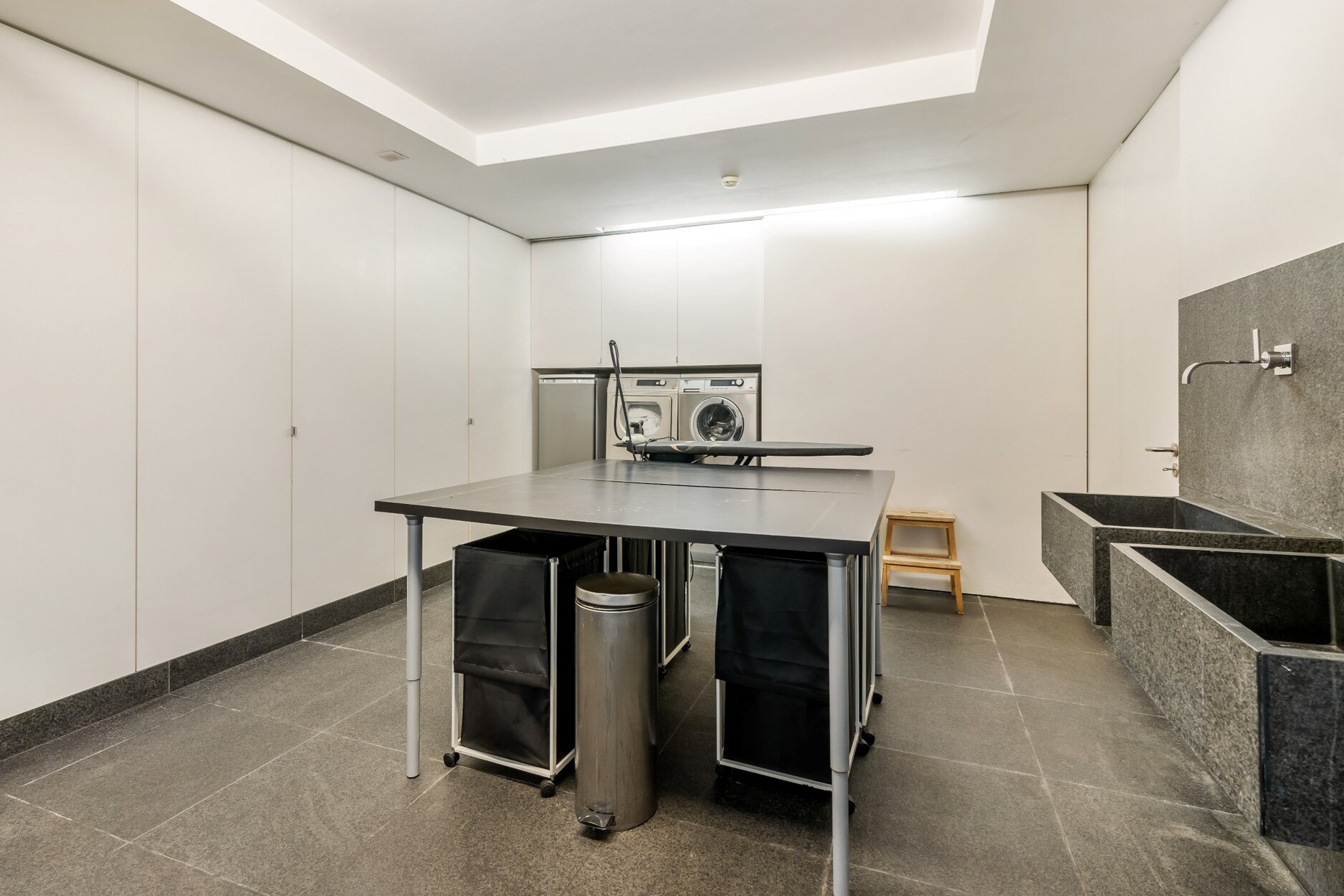 kelderverdieping, inclusief de wasplaats, is afgewerkt met een granieten natuurstenen vloer. Er werd geopteerd voor kraanwerk van het exclusieve merk Dornbracht. Naast de wellness bevinden zicht 3 extra kamers die multifunctioneel gebruikt kunnen worden, alsook een aparteruimte met infraroodcabine en douche. De wellness kreeg een nominatie voor de “Mooiste Privésauna van Vlaanderen” door Knack-Wellness.
