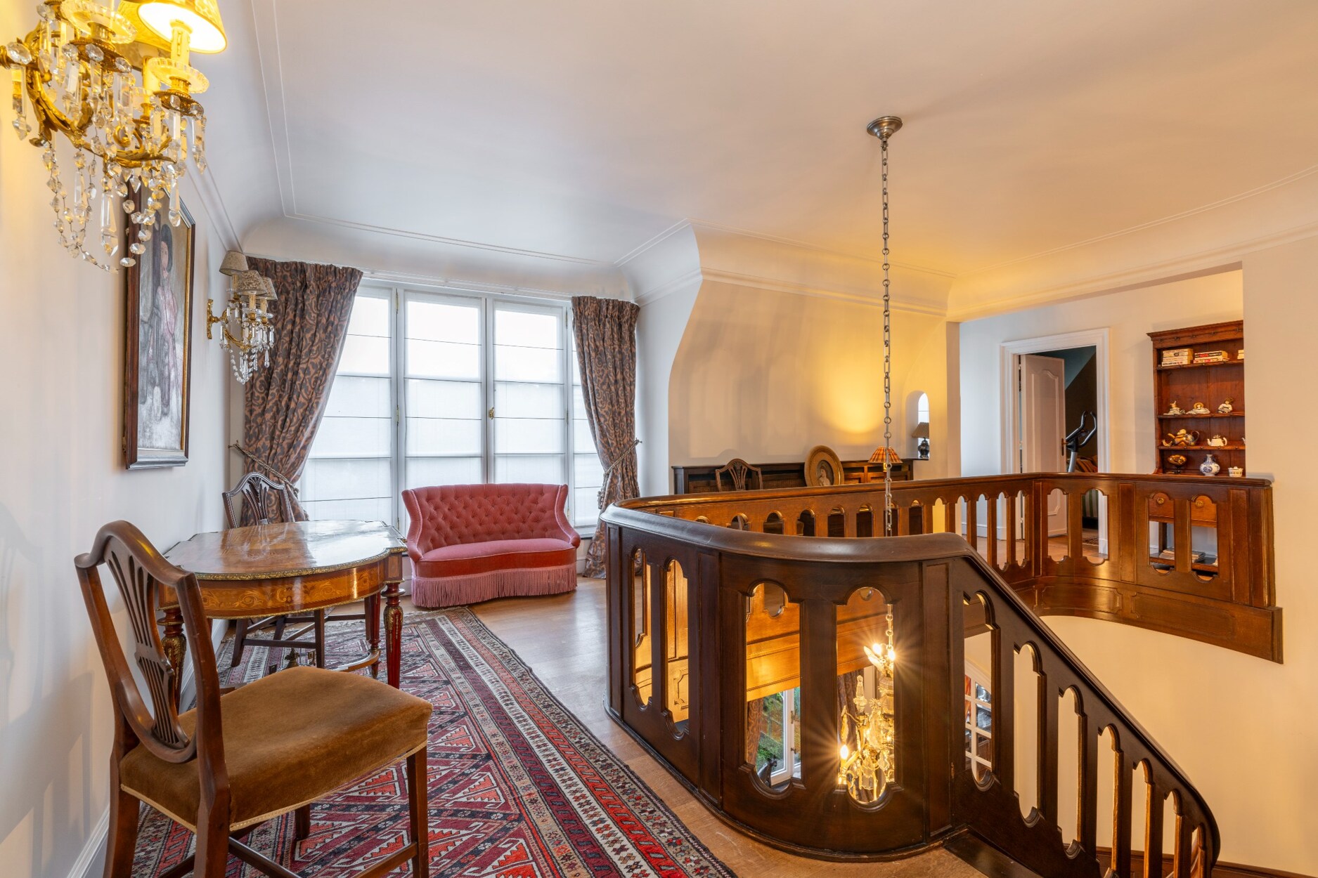 De brede eiken trap vertrekkend vanuit de inkomhal leidt ons naar de eerste verdieping.