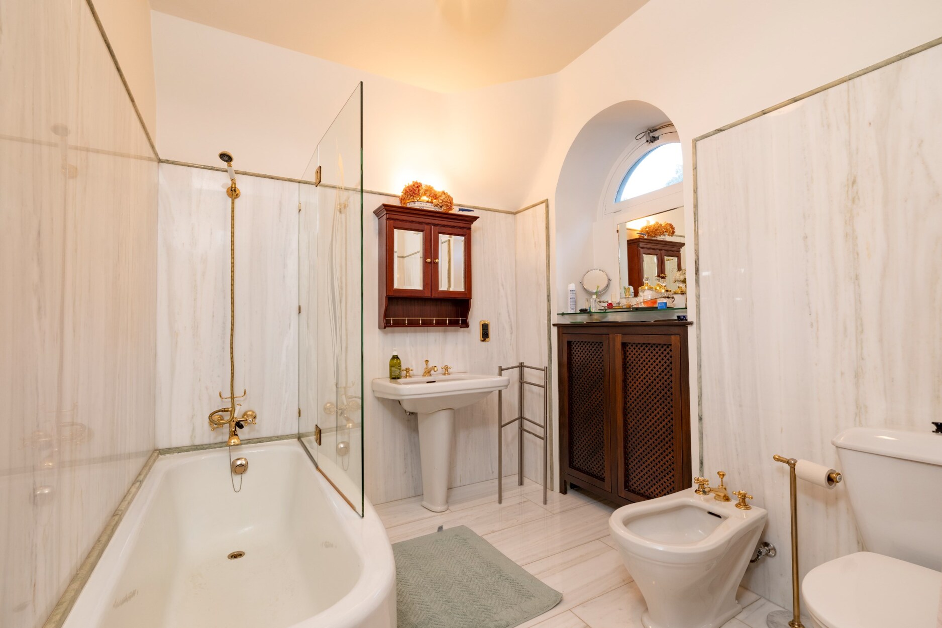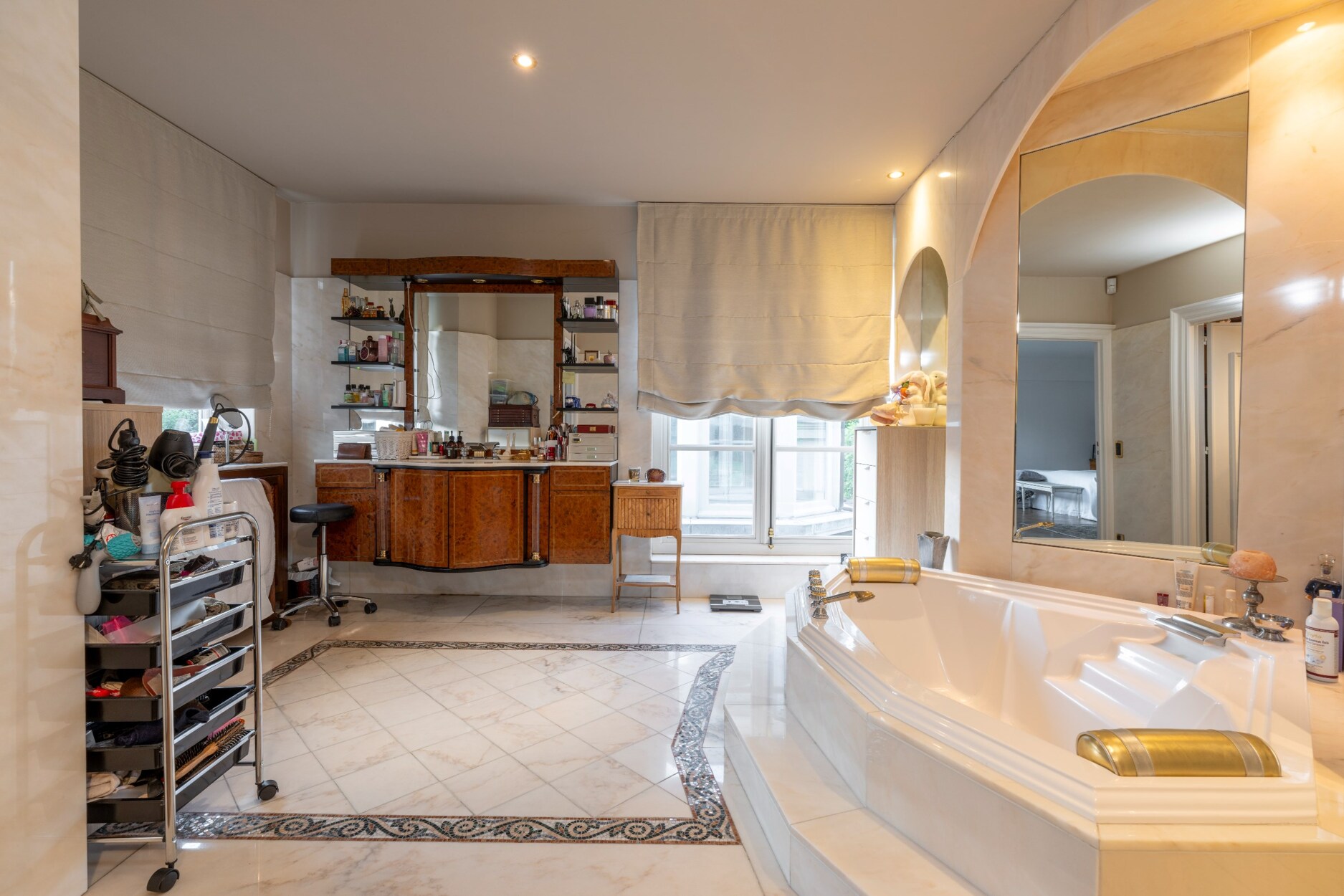 Nachthal op marmeren vloer en voorzien van een separaat toilet.