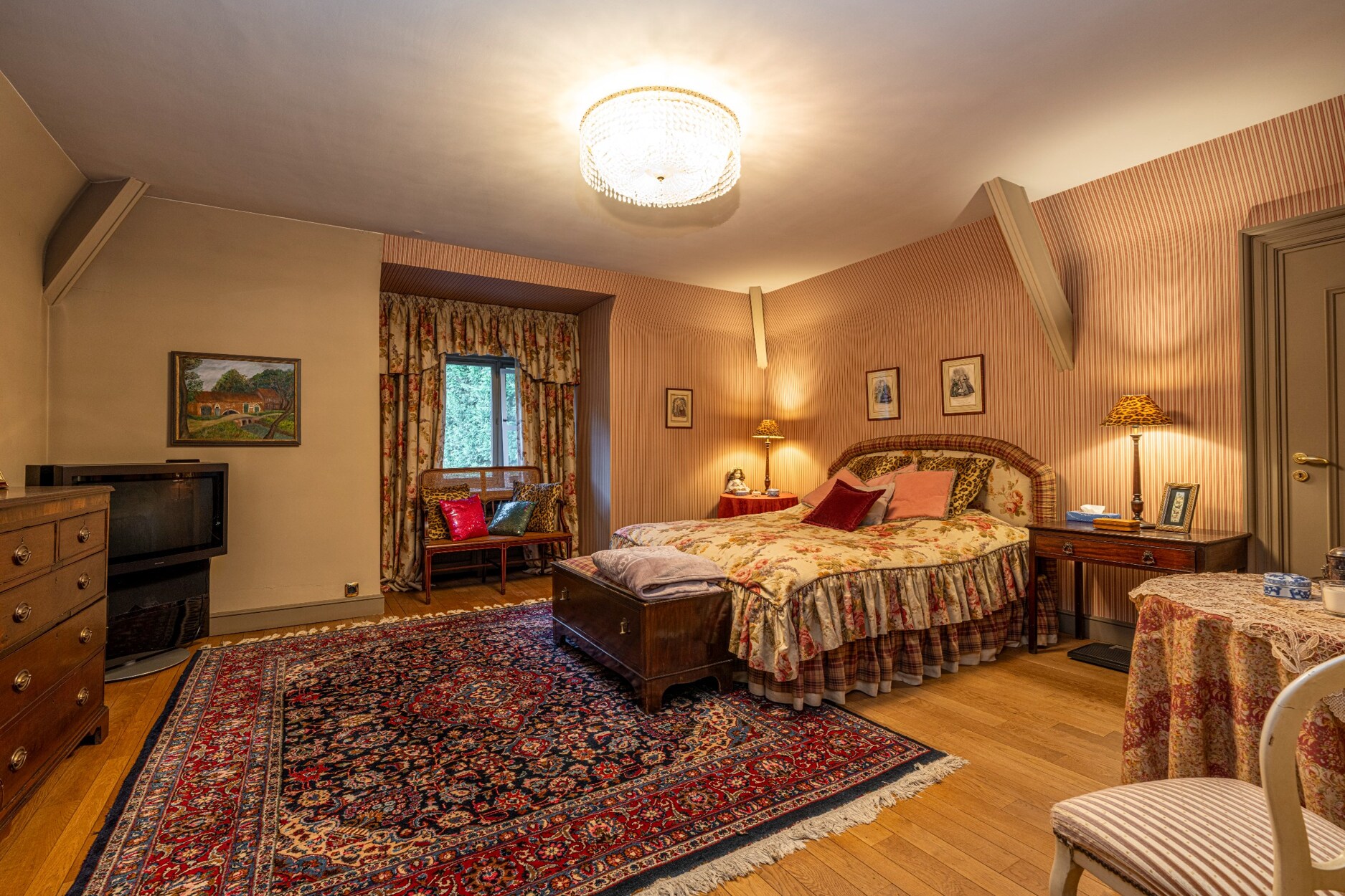Aan de linkervleugel van de trapzaal, bevindt zich een gezellige duplex-kamer met eiken trap naar de mezzanine, waar eveneens een bibliotheek is ingericht en een bergruimte.
