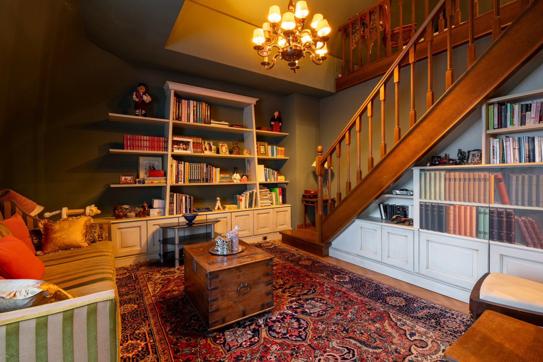Gekoppeld aan de inkomhal treffen we een afsluitbaar kantoor met ingewerkte boekenwand.