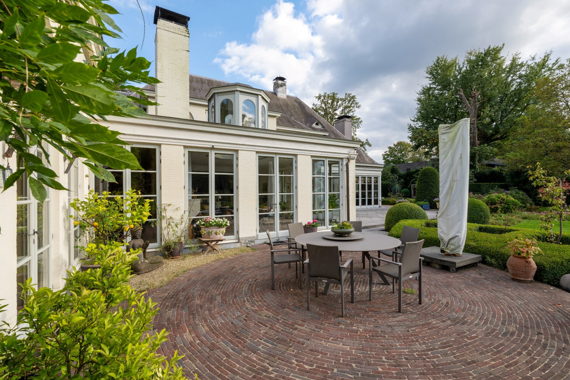 Een royale oprijlaan in hollandse klinkers leidt ons tot aan de parkeerzone voor ca. 10 wagens in de parkeerzone in de voortuin van de villa.