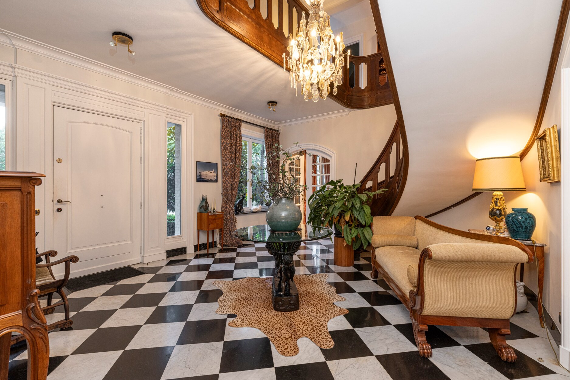 We betreden de woning en genieten van de open groene omgeving. de riante inkomhal straalt elegantie en rust uit.
