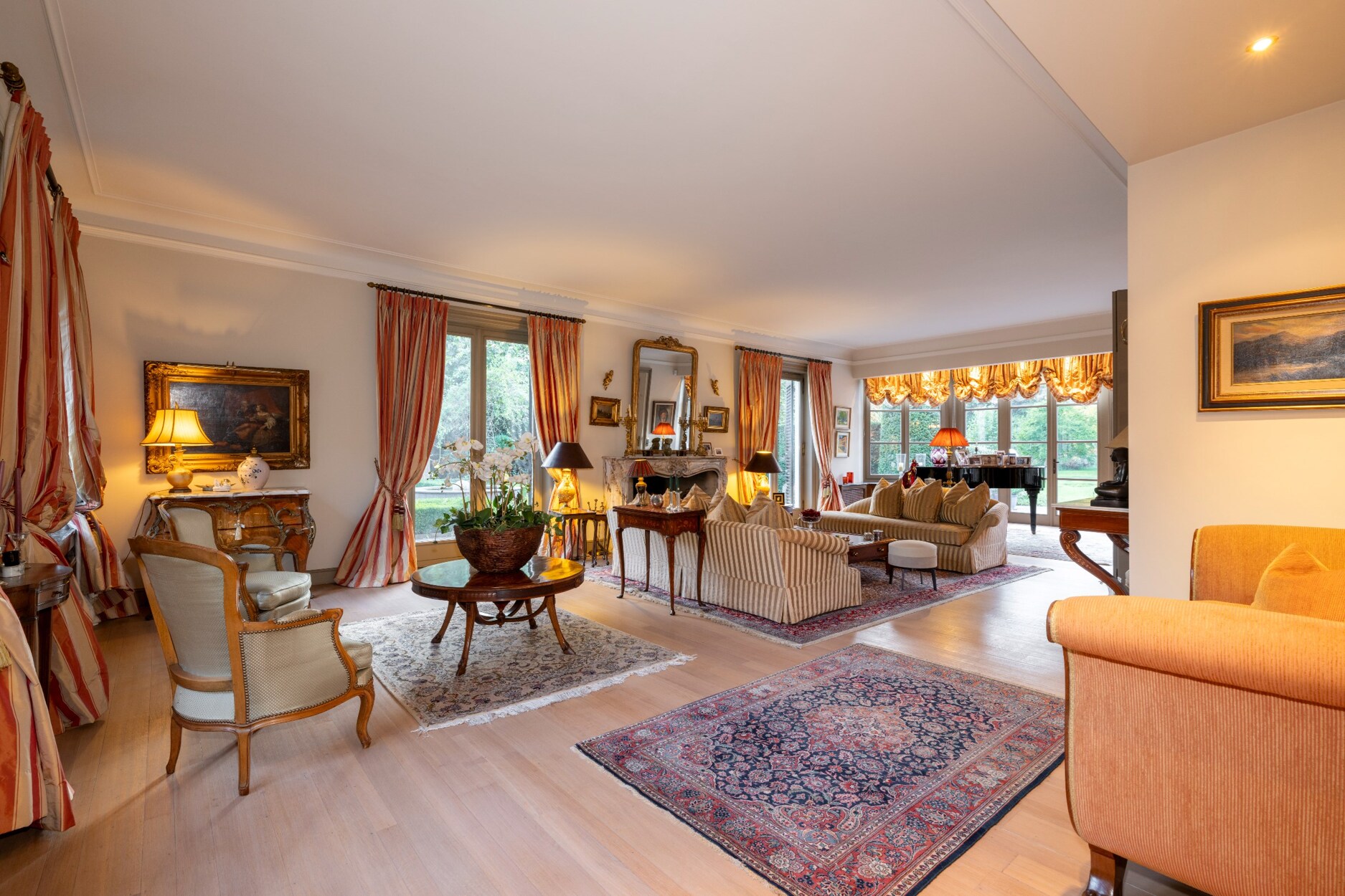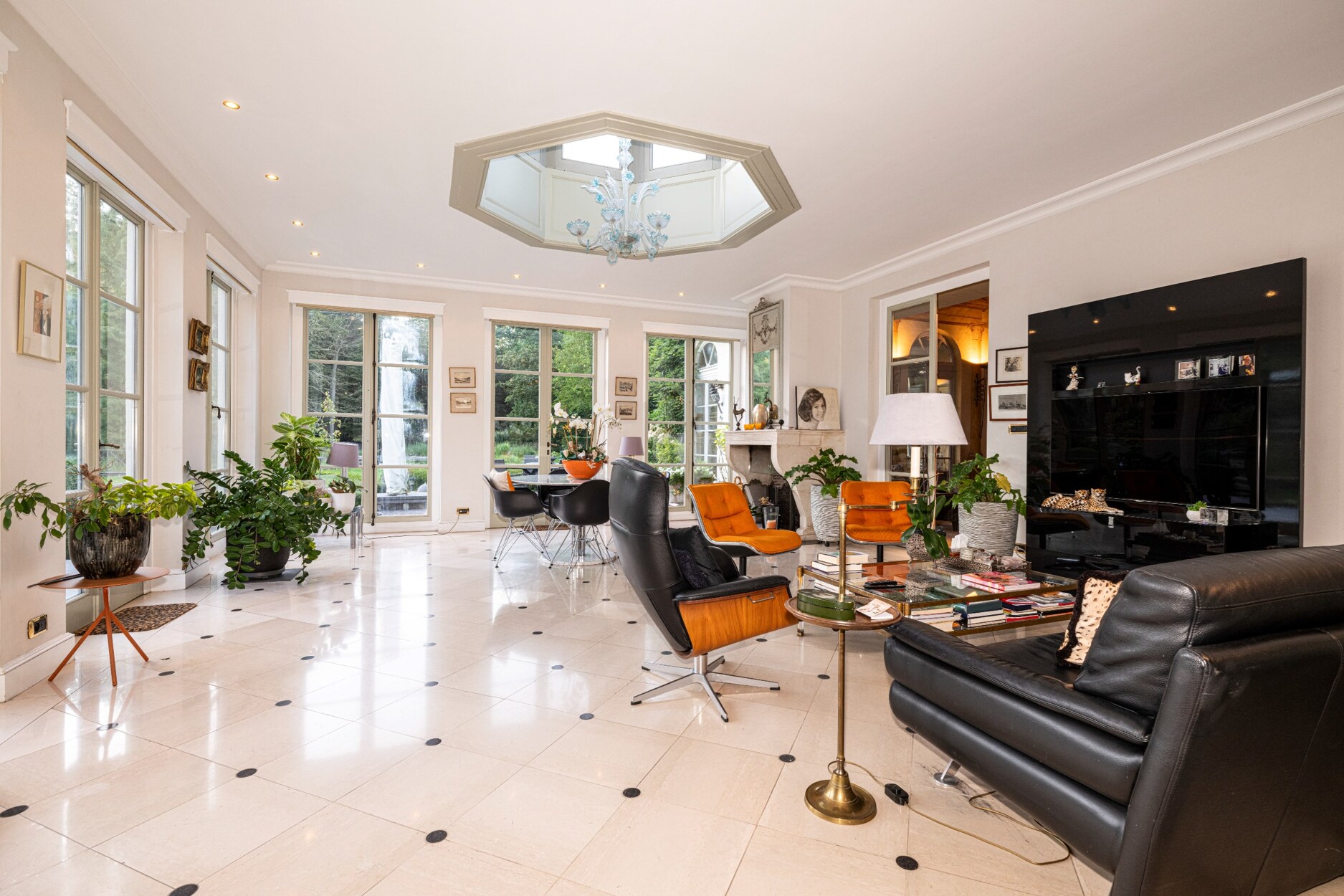 De L-vormige leefomgeving, bestaande uit het ontvangstsalon, eetruimte met een verbinding naar de uitgeruste leefkeuken, biedt een connectie met de parktuin dankzij de verschillende raampartijen die gericht zijn naar de prachtige aangelegde parktuin.