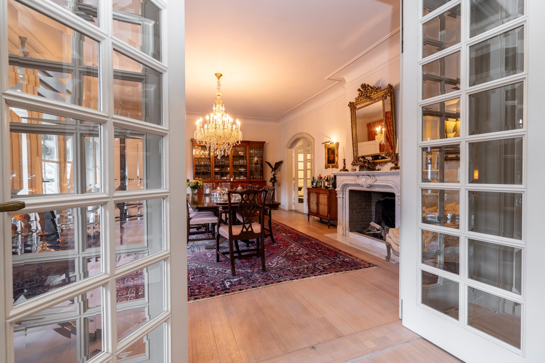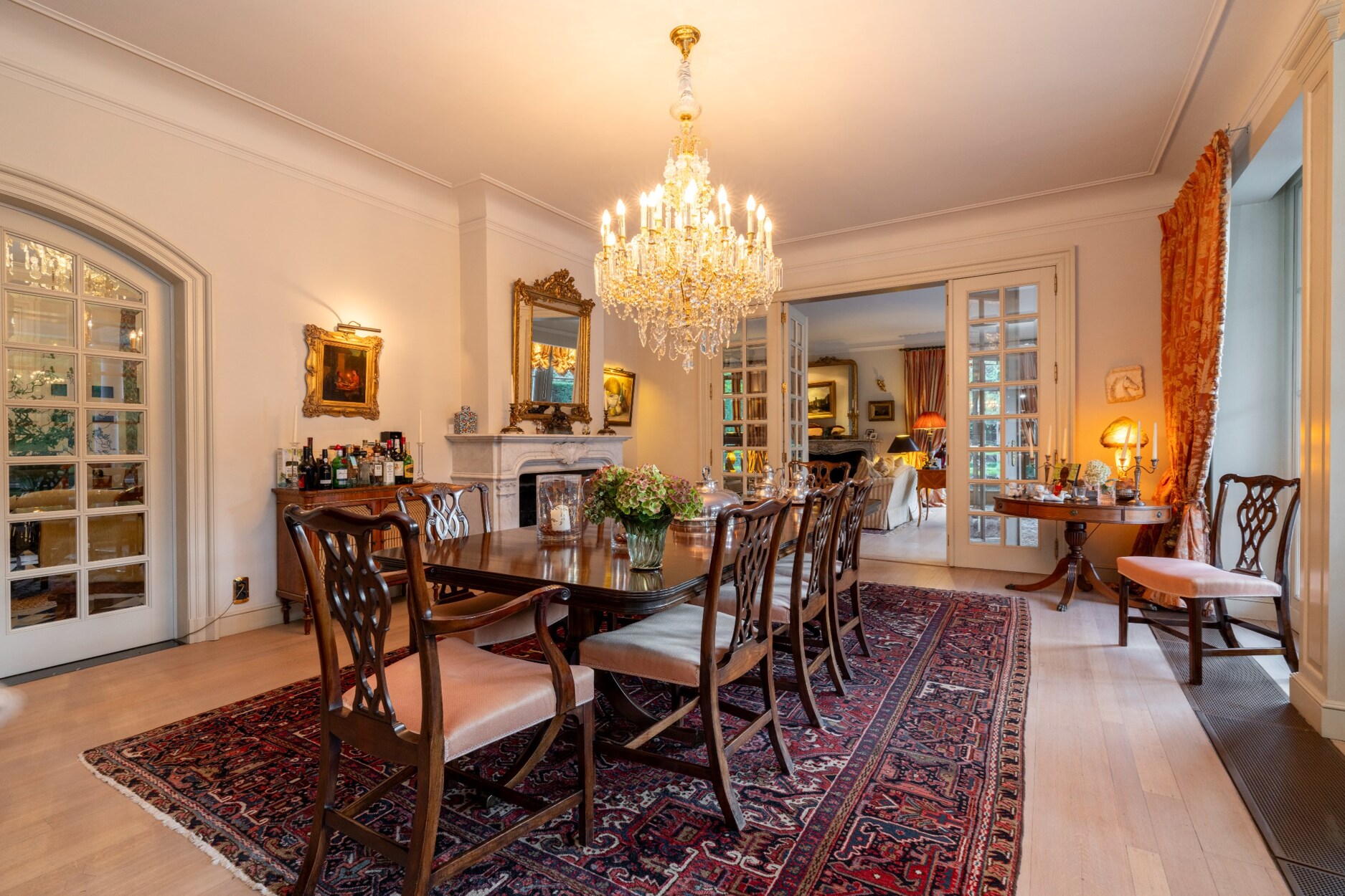 We nemen de dubbel openslaande deur met glasinleg en bereiken zo de leefomgeving van ca. 140m² dewelke bestaat uit een gezellig ontvangstsalon met open haard en een eetruimte en geniet een toegang naar een ruim, zonnig terras op blauwe hardsteen.