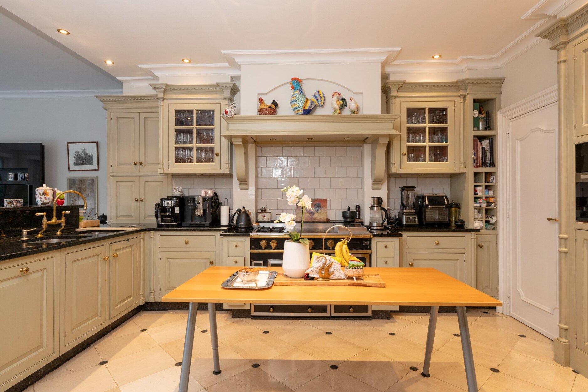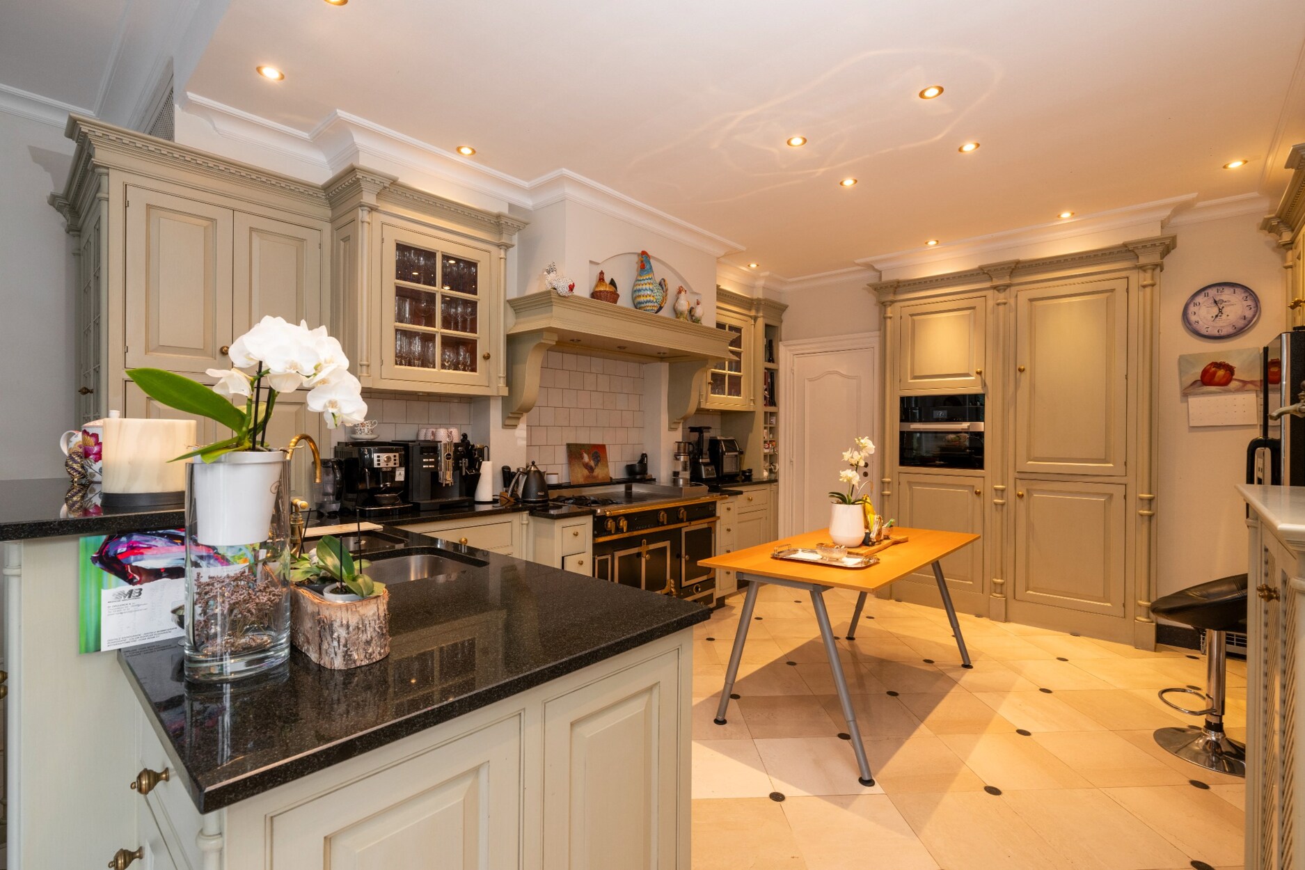 De stijvolle, landelijke woon-leefkeuken van ca 90m² op beige marmeren vloer is volledig ingericht met maatkasten, gasfornuis, merktoestellen, een granieten werkblad en inbouwspots.