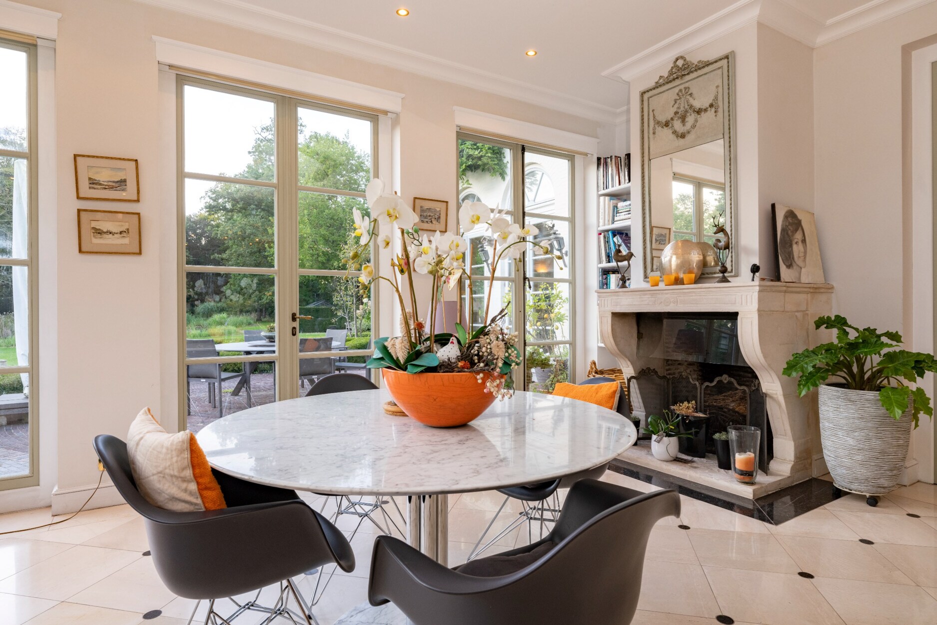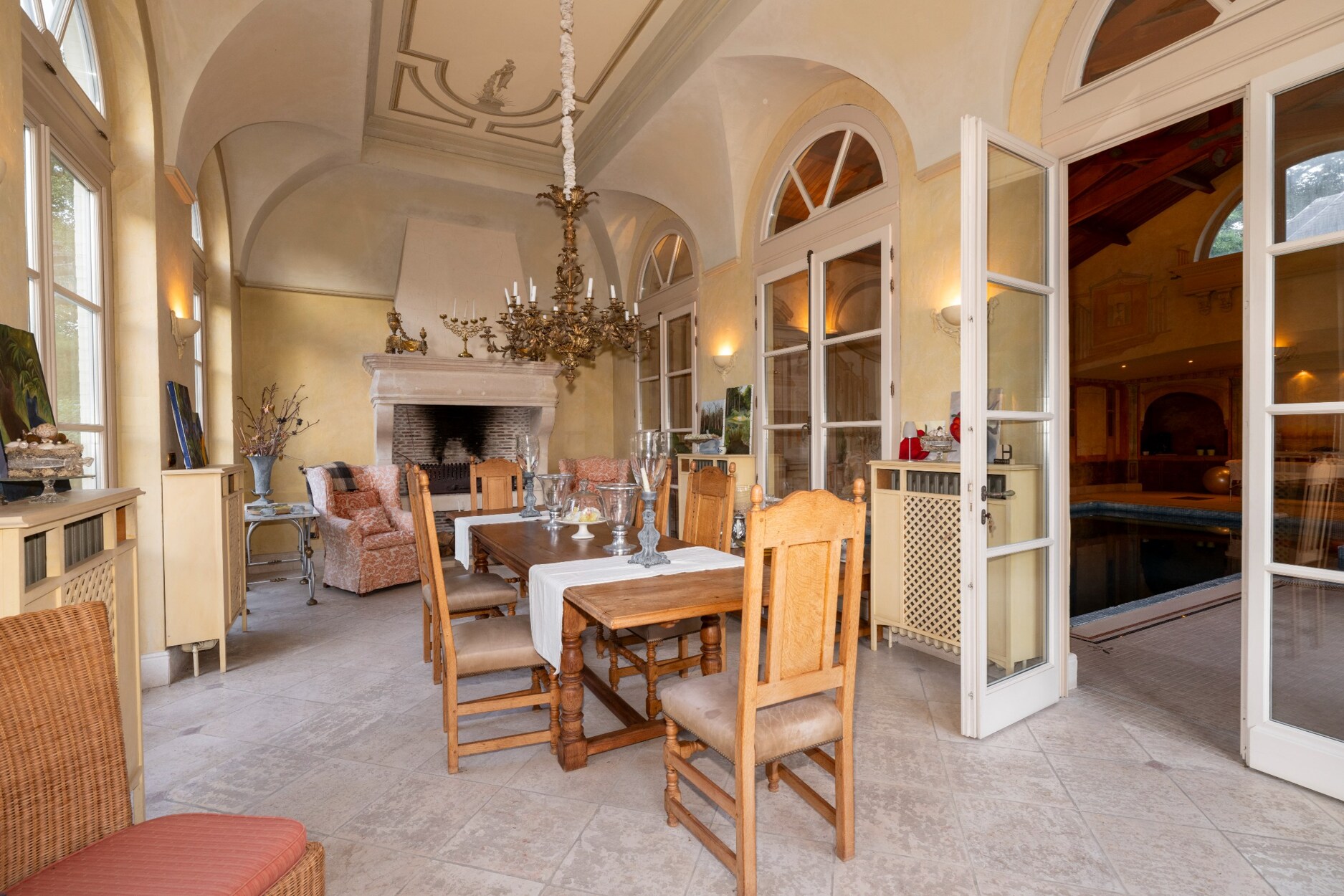 Feeërieke orangerie van ca 50m² met open haard, Spaanse naatuurstenen vloer en prachtige muurschilderingen.