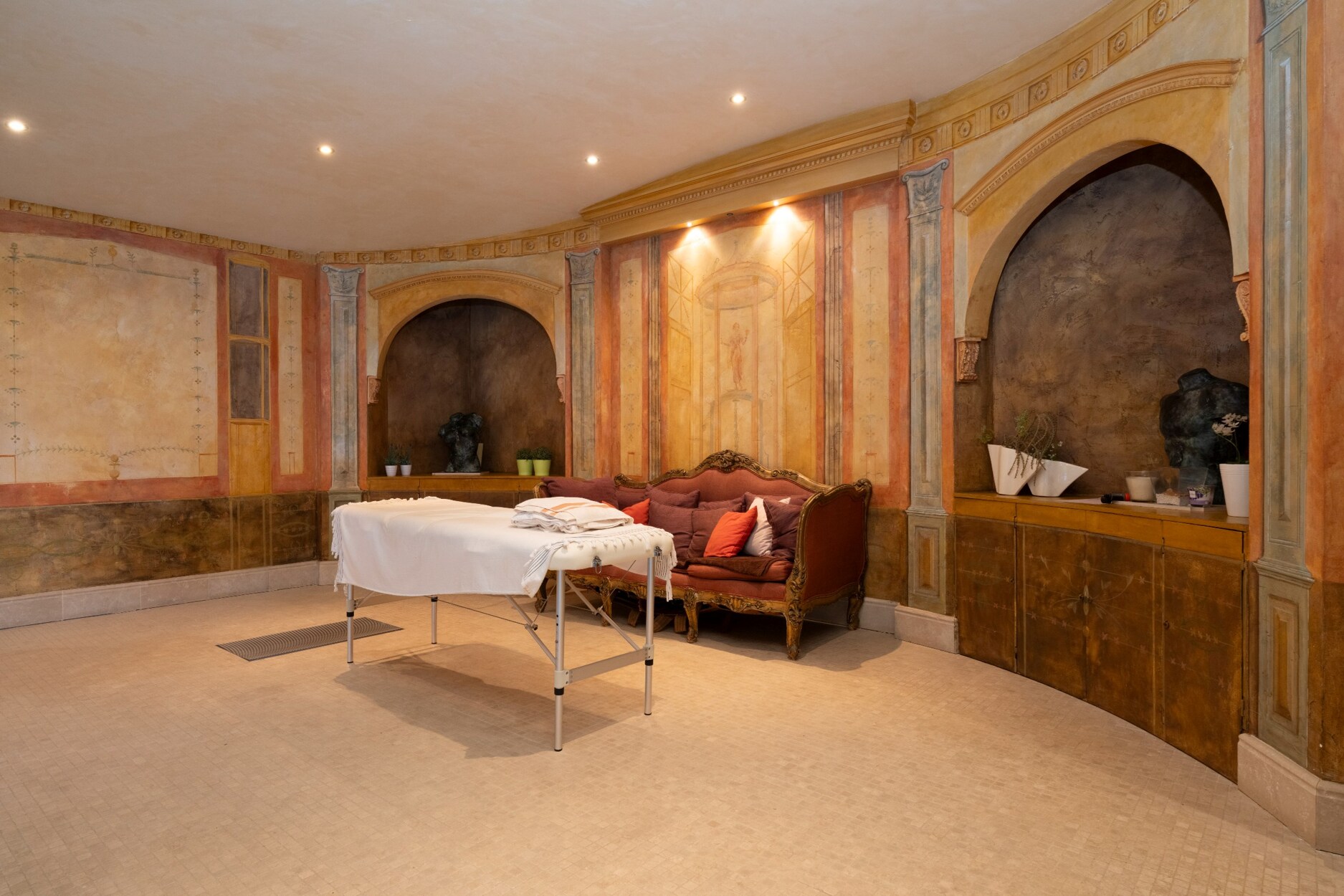 Vanuit de leefkeuken is er toegang tot het Spa - gedeelte met uiterst luxueus jetstream - binnenzwembad, met trompeoeuil muurschilderingen en hoge kwalitatieve cederhouten kathedraalzoldering. De vloeren zijn ingelegd met Italiaanse, marmeren mozaïeksteentjes. In deze prachtige ontspanningsruimte bevinden zich eveneens een geïtegreerde jacuzzi, een douchekamer, een Turks bad, een toilet, een storage room en een trap naar de slaapvertrekken.