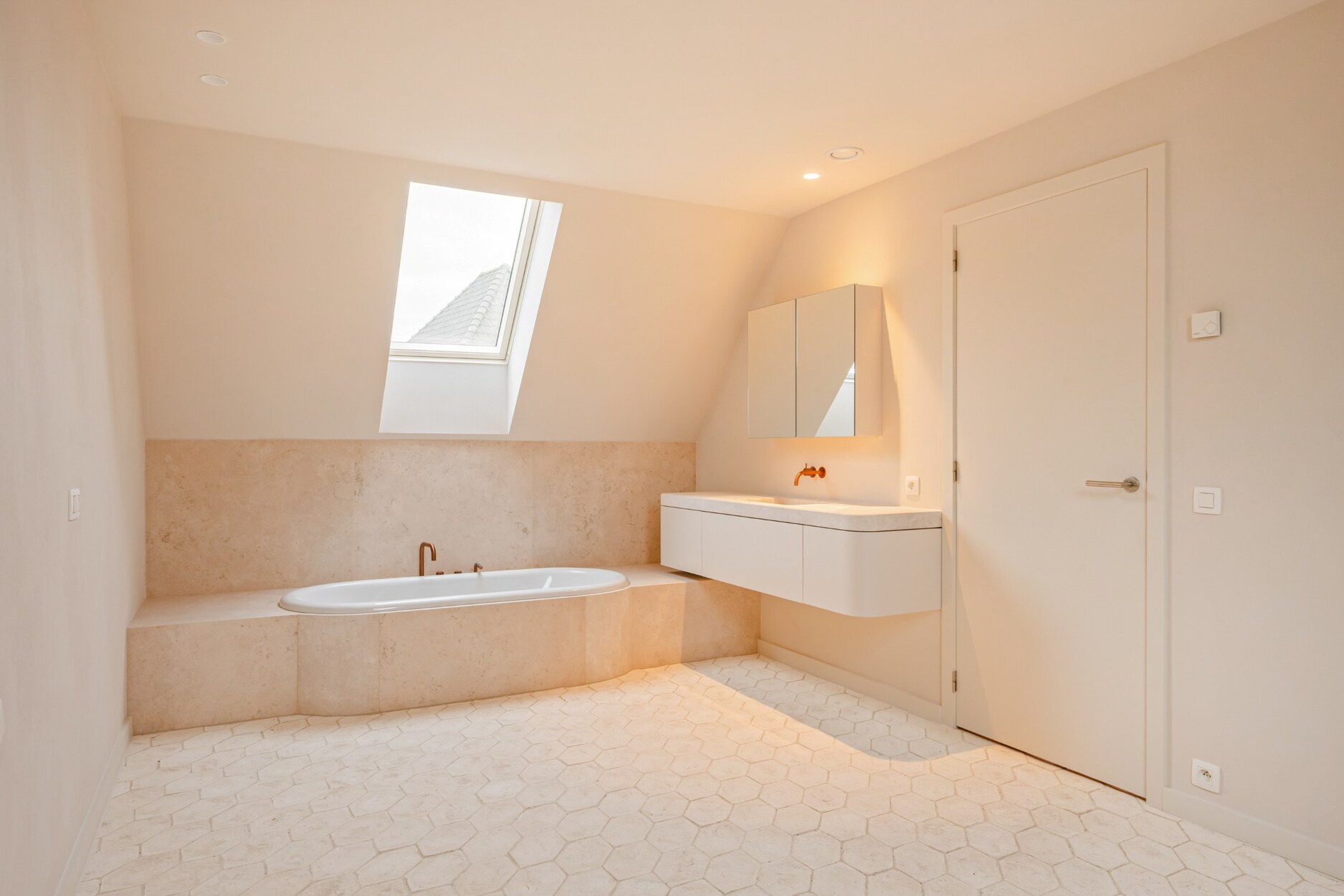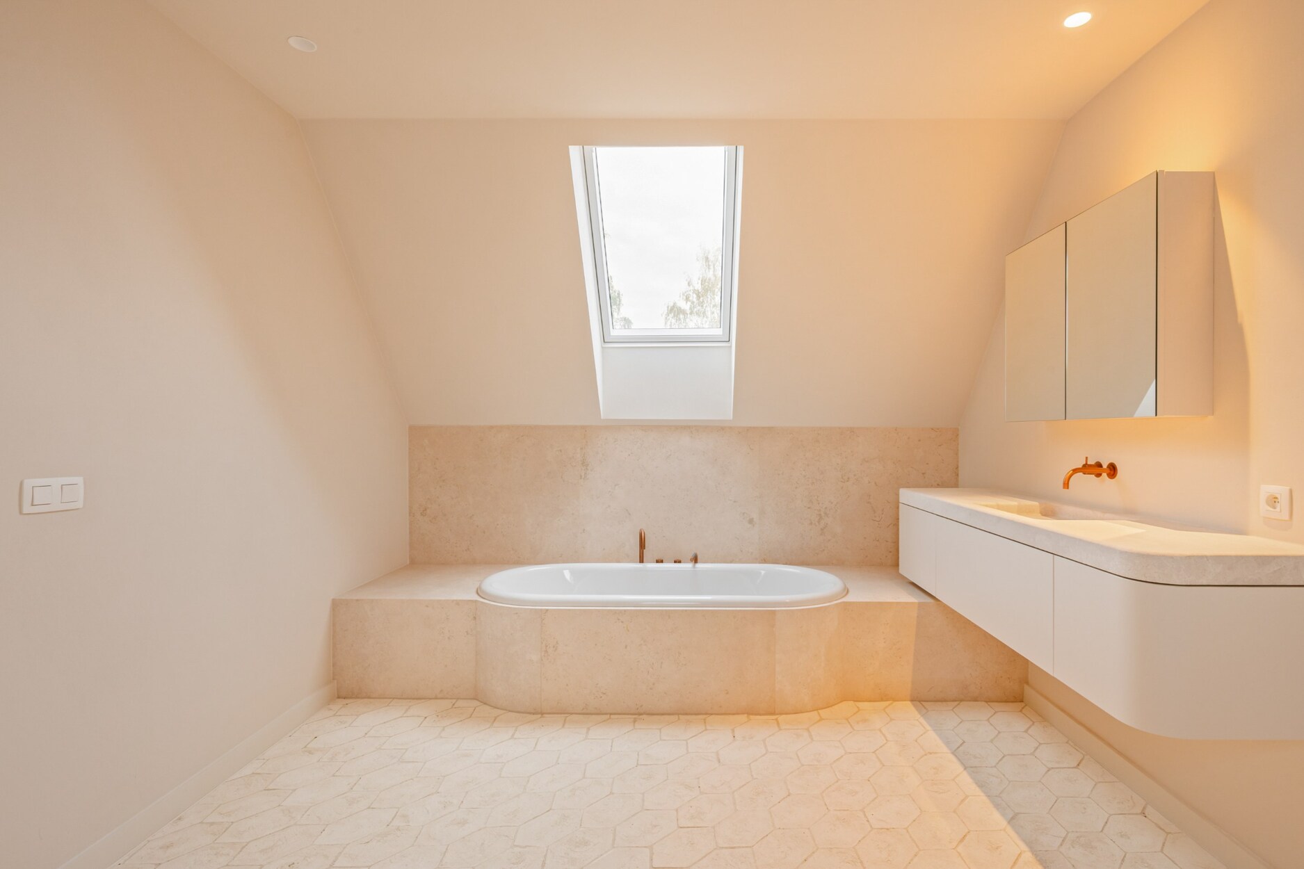 Op de eerste verdieping vind je een ruime multifunctionele hal die ideaal dienst kan doen als hobbyruimte, bureau of extra slaapkamer. Verder zijn er drie volwaardige slaapkamers, waaronder één slaapkamer met een luxe ensuite badkamer met ligbad en elegant lavabomeubel, én een tweede badkamer met douche en maatwerk lavabomeubel. De royale zolder van 32 m² biedt extra flexibiliteit.