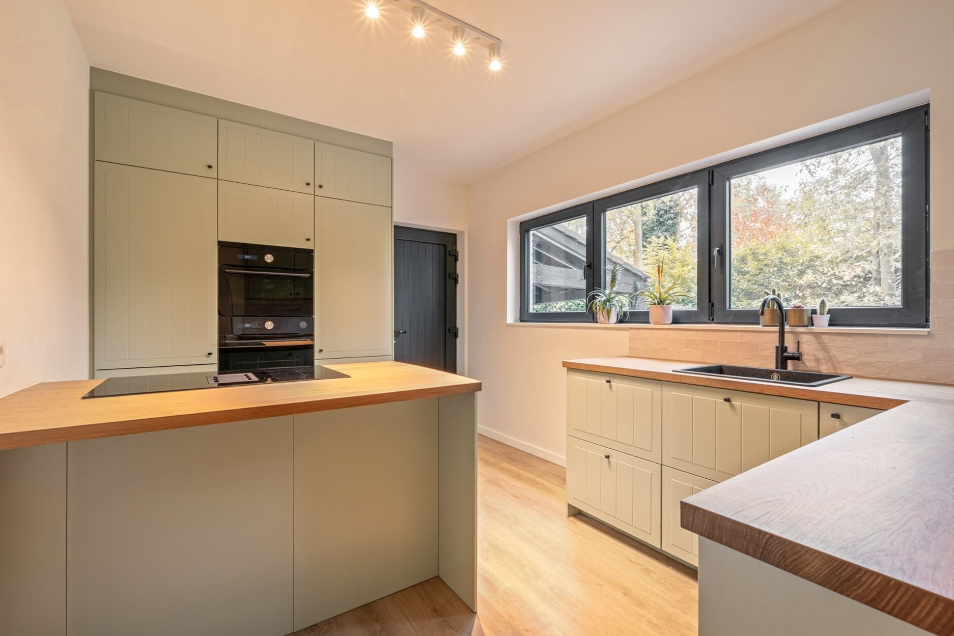 De vernieuwde keuken, uitgevoerd in zachte tinten met houten accenten, is uitgerust met kwalitatieve toestellen en biedt veel werk- en bergruimte.