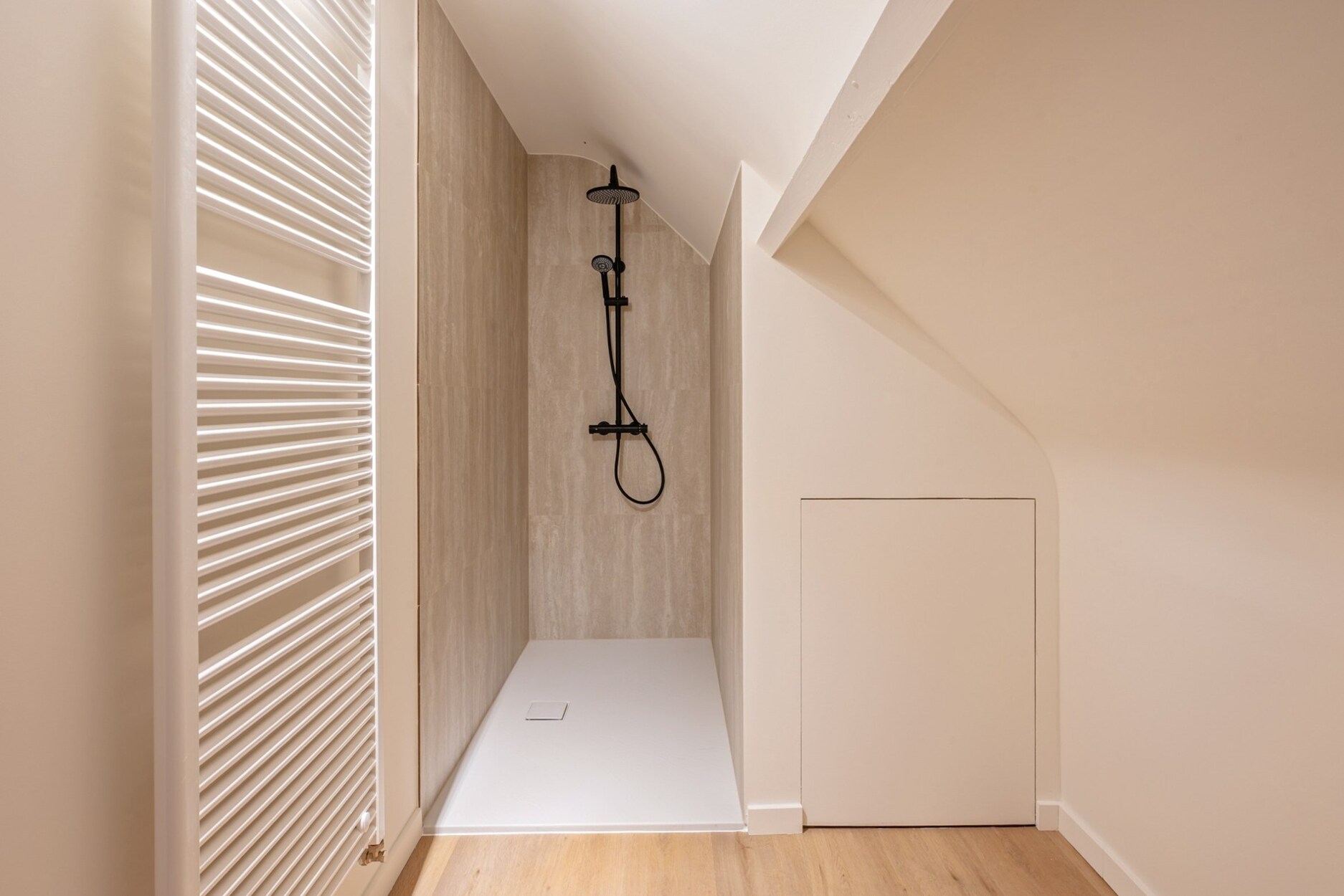 Op de verdieping bevinden zich vier slaapkamers, waaronder een ruime master met ingemaakte kasten en ensuite-badkamer. De overige kamers kunnen perfect dienen als kinder-, logeer- of werkkamer. Een tweede badkamer en een praktische douchekamer (eventueel te gebruiken als wasplaats) vervolledigen deze verdieping.