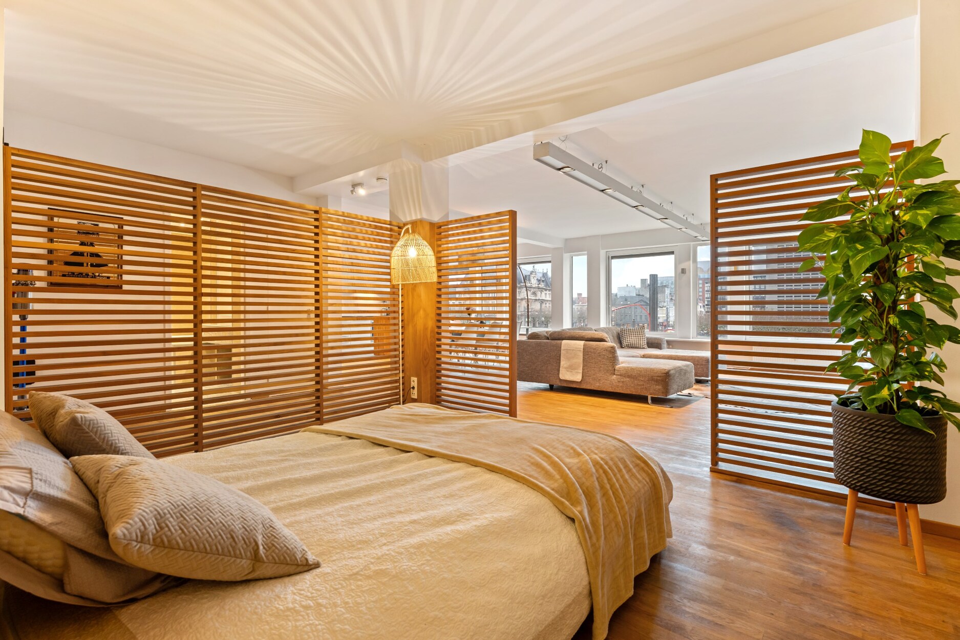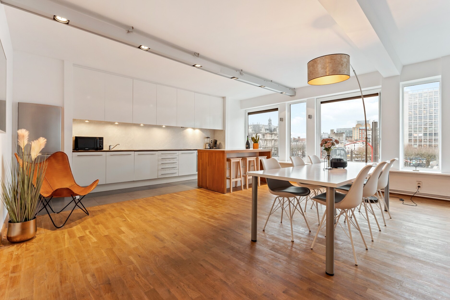 De ruime woonkamer met hoge plafonds en houten vloeren biedt veel natuurlijk licht en een open, moderne sfeer. De volledig uitgeruste keuken beschikt over een kookeiland, inductiekookplaat, oven, vaatwasser en ingebouwde koelkast. De loft-slaapkamer is discreet gescheiden en heeft een verborgen dressing.