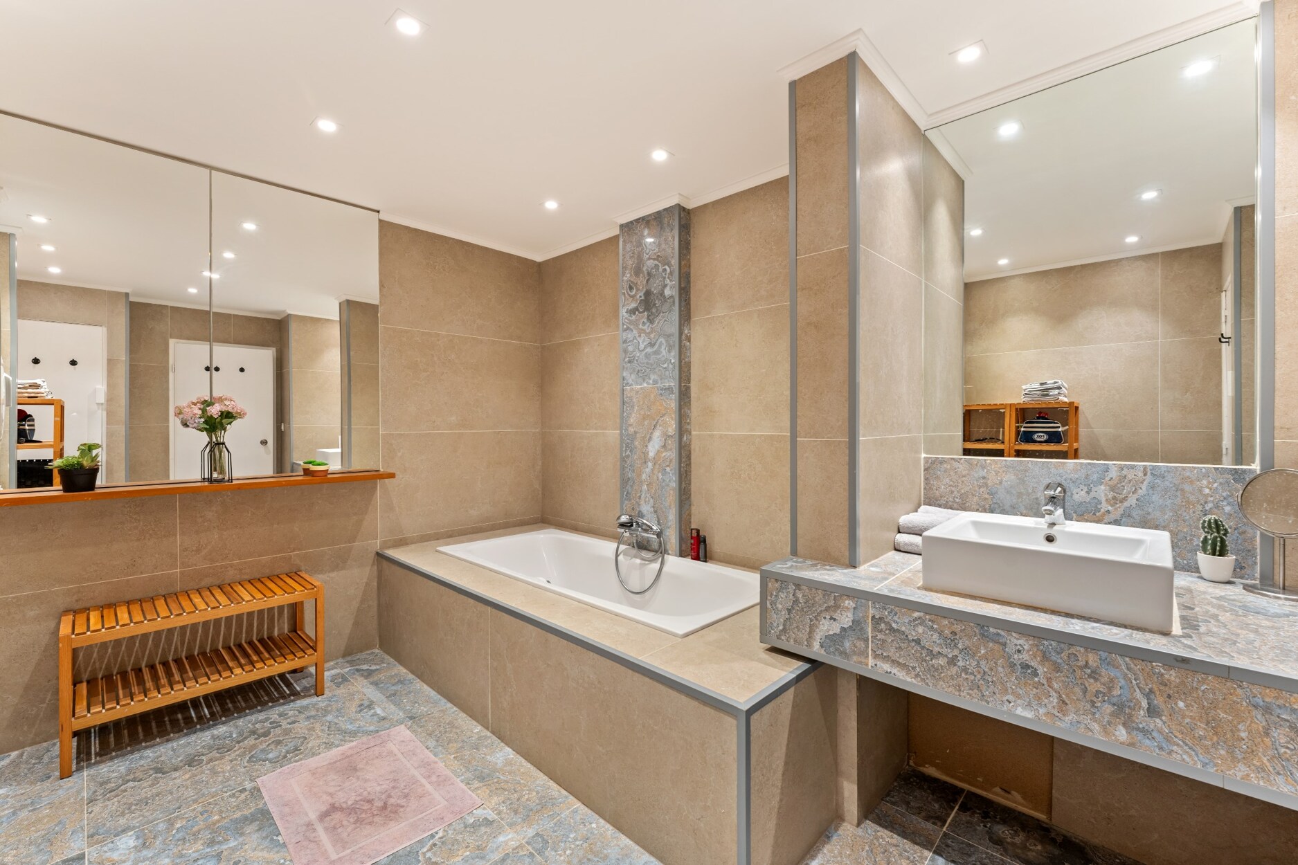De recent gerenoveerde badkamer heeft een ligbad, wastafel, toilet en ruimte voor wasmachine en droger. Het appartement is bereikbaar via een beveiligde deur en heeft dubbele beglazing voor extra comfort.