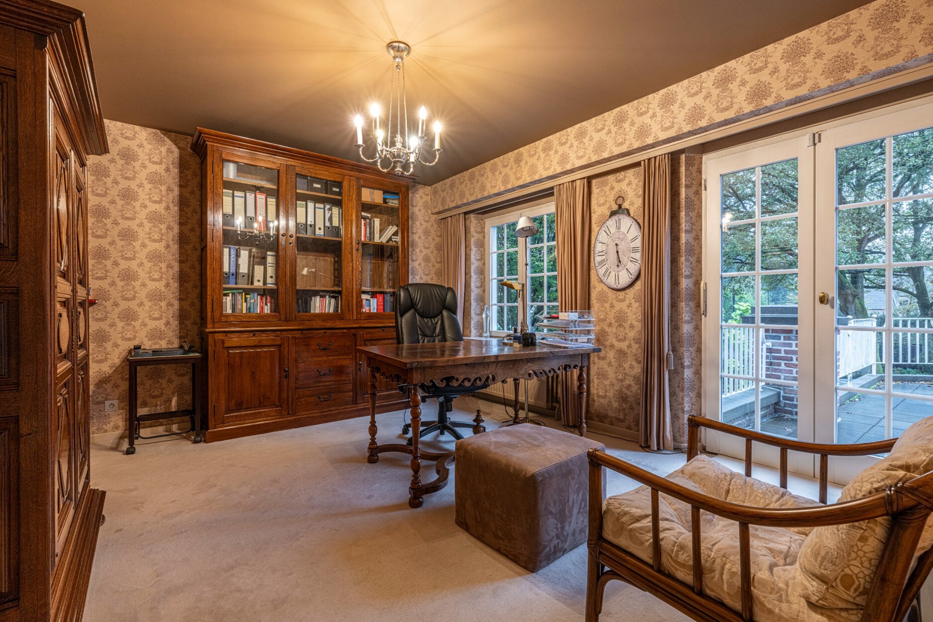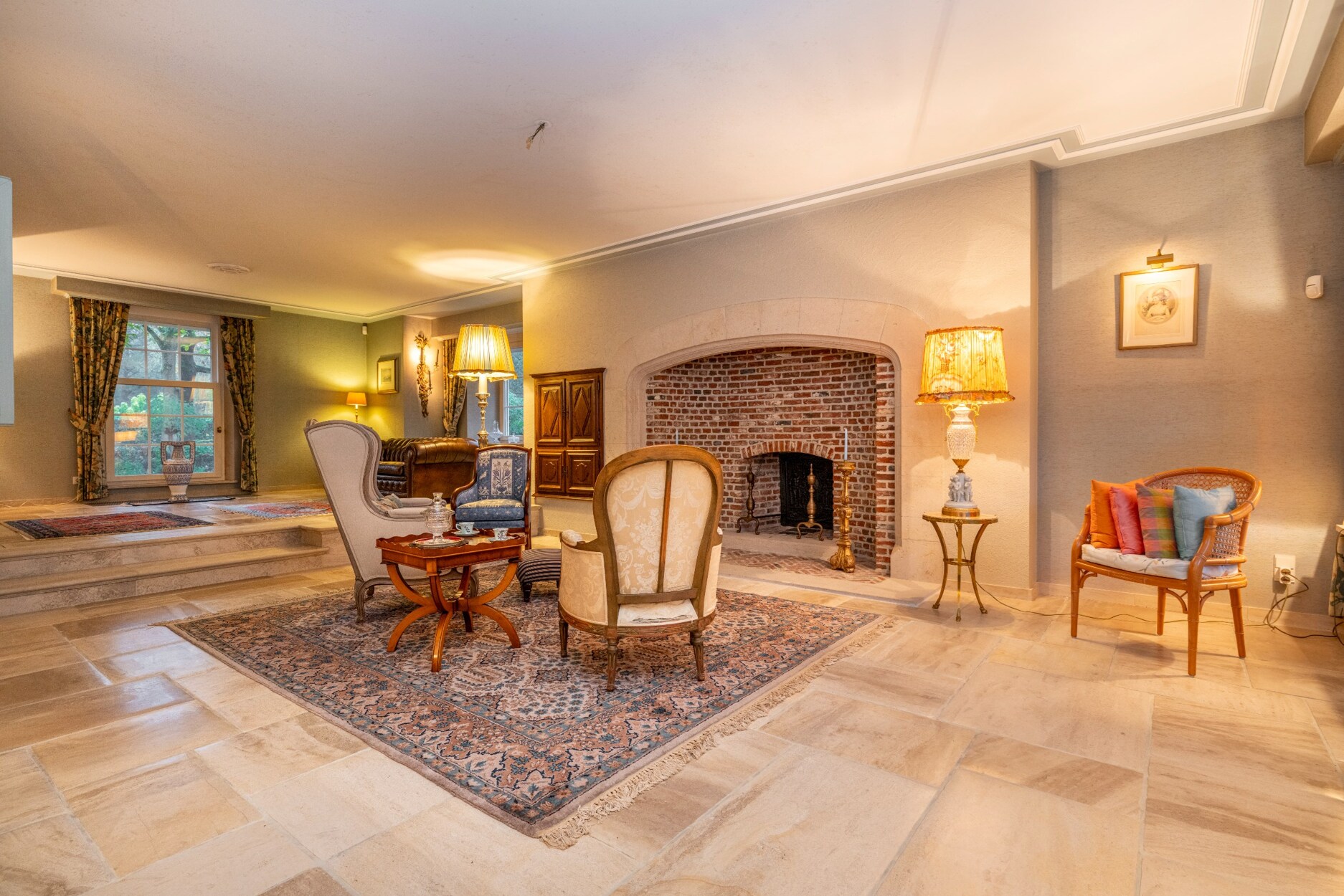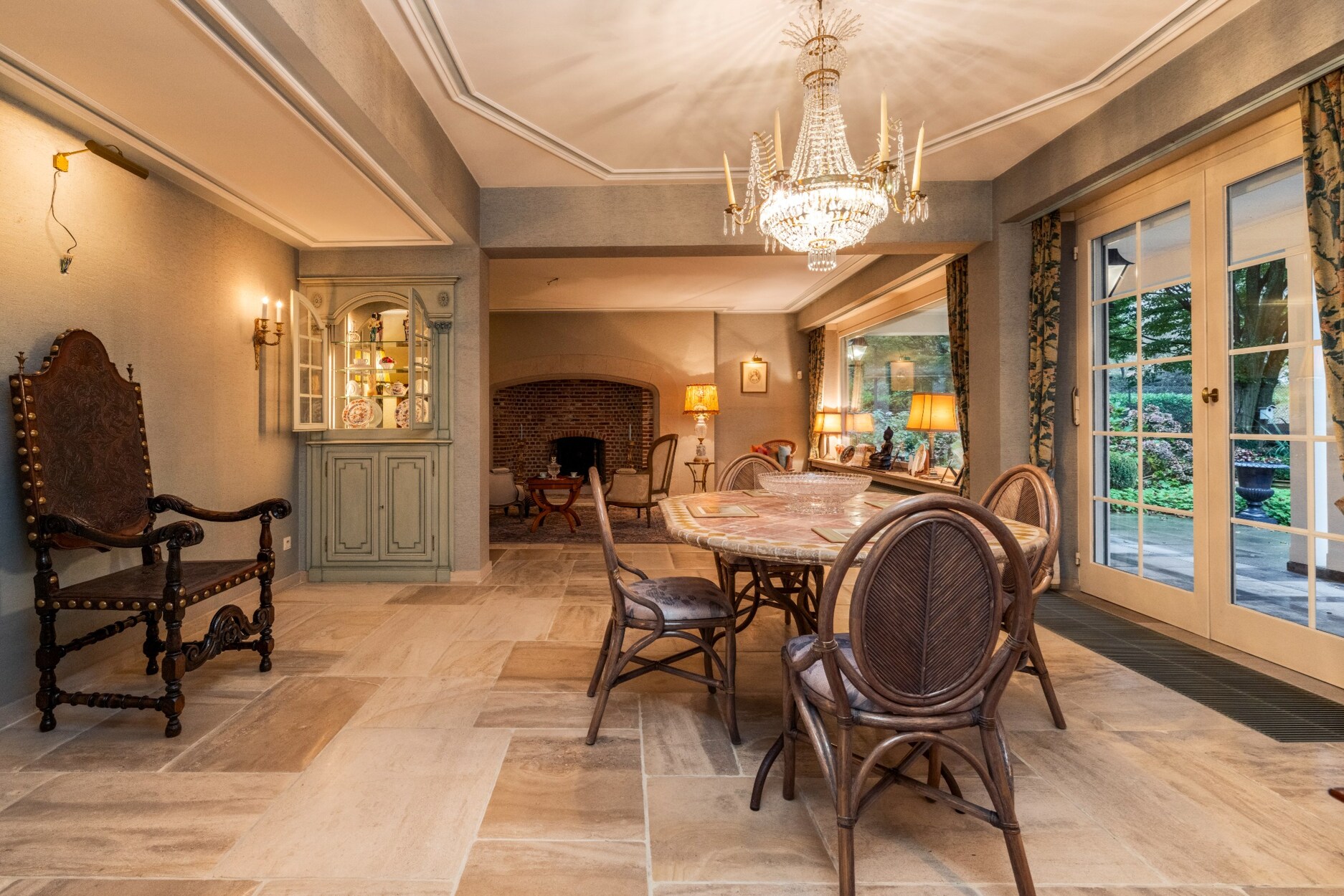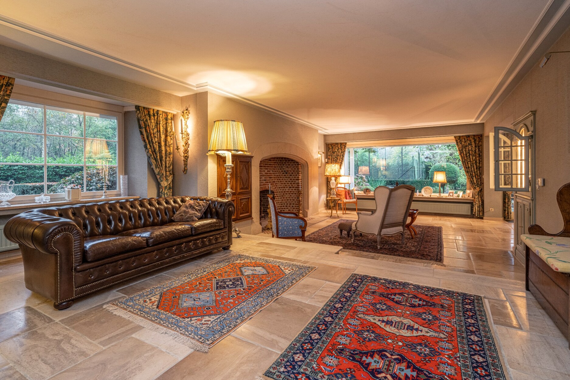 Via de statige inkomhal met zijn mooie travertinvloer en grote trappartij betreden we deze klasse villa. Aan de rechter zijde treffen het zeer ruime kantoor, centraal de keuken en aan de linker zijde de woonkamer. Deze bestaat uit 3 ruime delen waaronder een leeshoek, een TV-hoek aan de openhaard en een eethoek met toegang tot het overdekte terras, de tuinkamer en aansluitend ook de zeer ruime keuken met ontbijthoek.