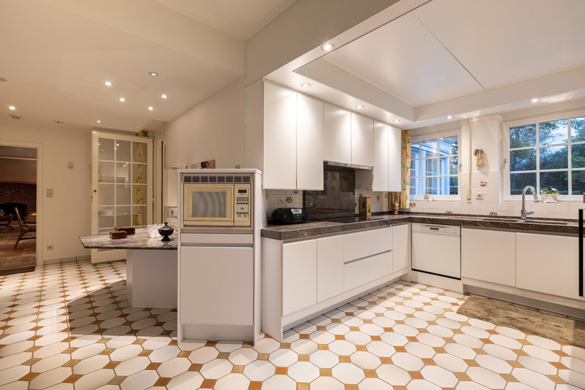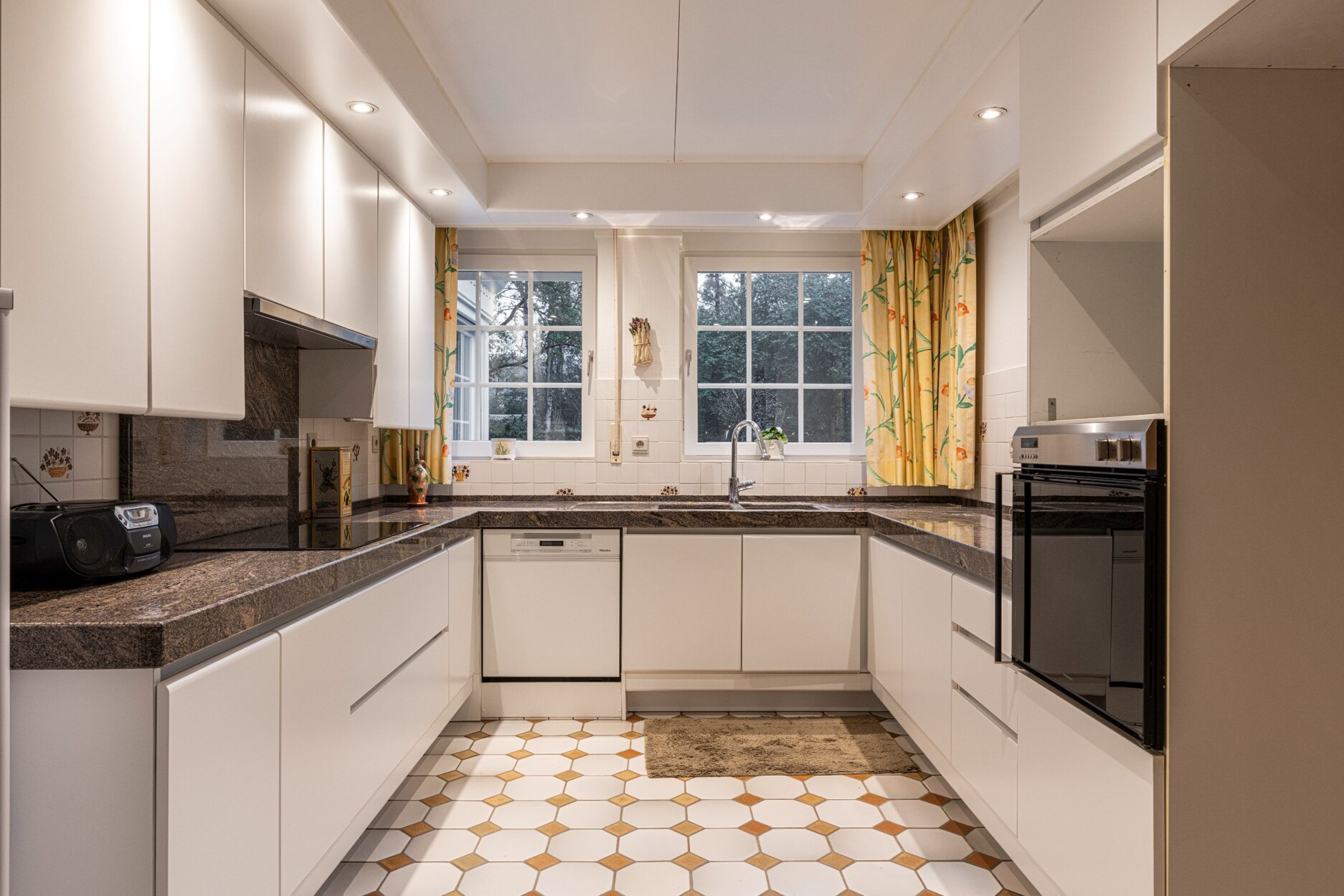 De keuken beschikt over een koele berging en brengt ons verder tot tot de wasplaats, de zeer ruime dubbele garage en de trap naar de kelderverdieping.