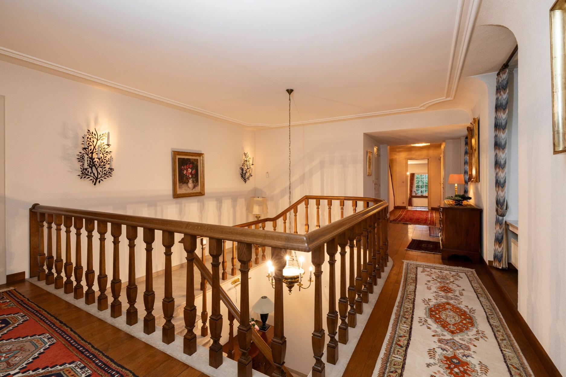 De statige trap brengt ons tot de 1e verdieping, met hier de overloop op een mooie Brabo-parket, die ons tot de verschillende slaap- en woonvertrekken brengt.