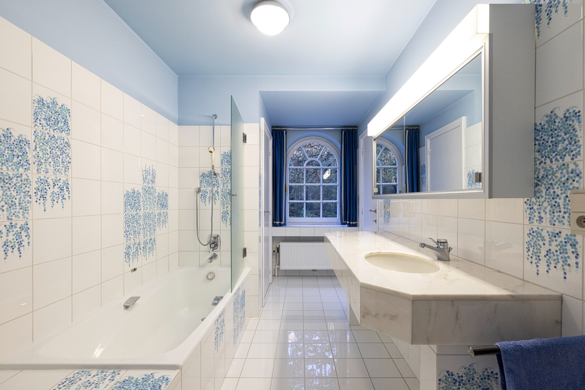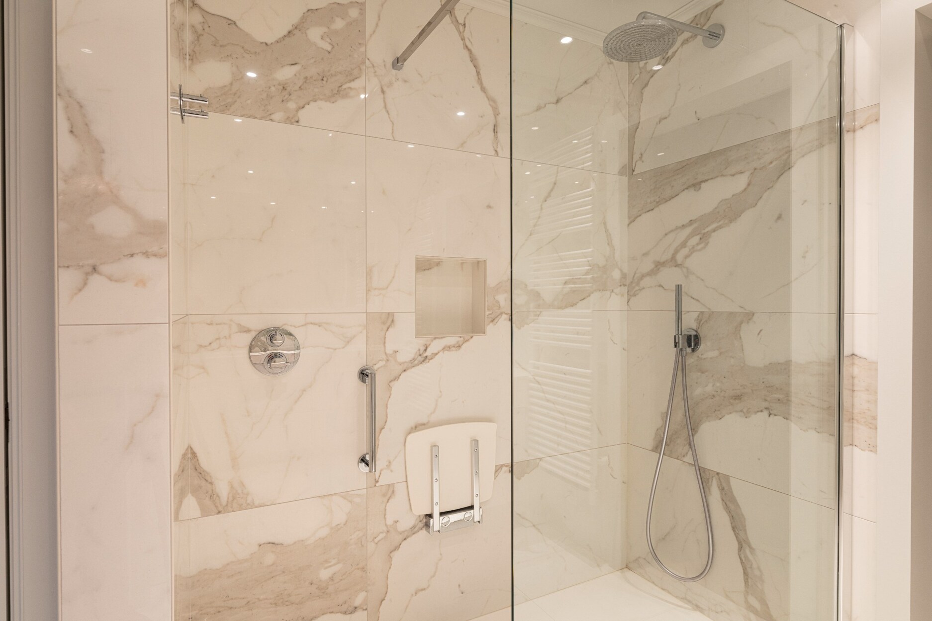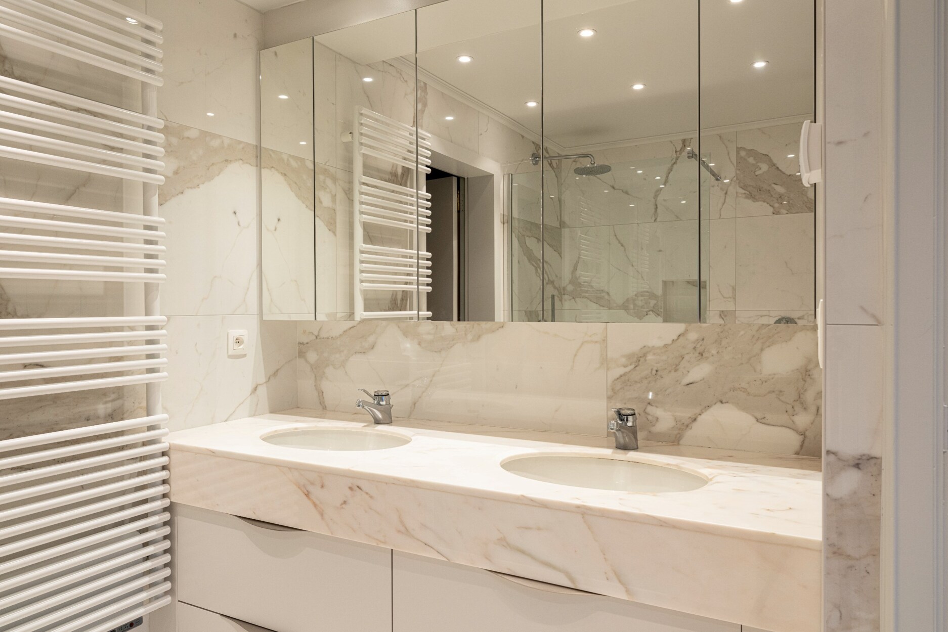 De mastersuite bestaat uit een ruime dressing, een volledig vernieuwde badkamer met dubbele wastafel, een apart toilet en een strakke inloop-regen-douche en 2 slaapkamers of extra dressing.
