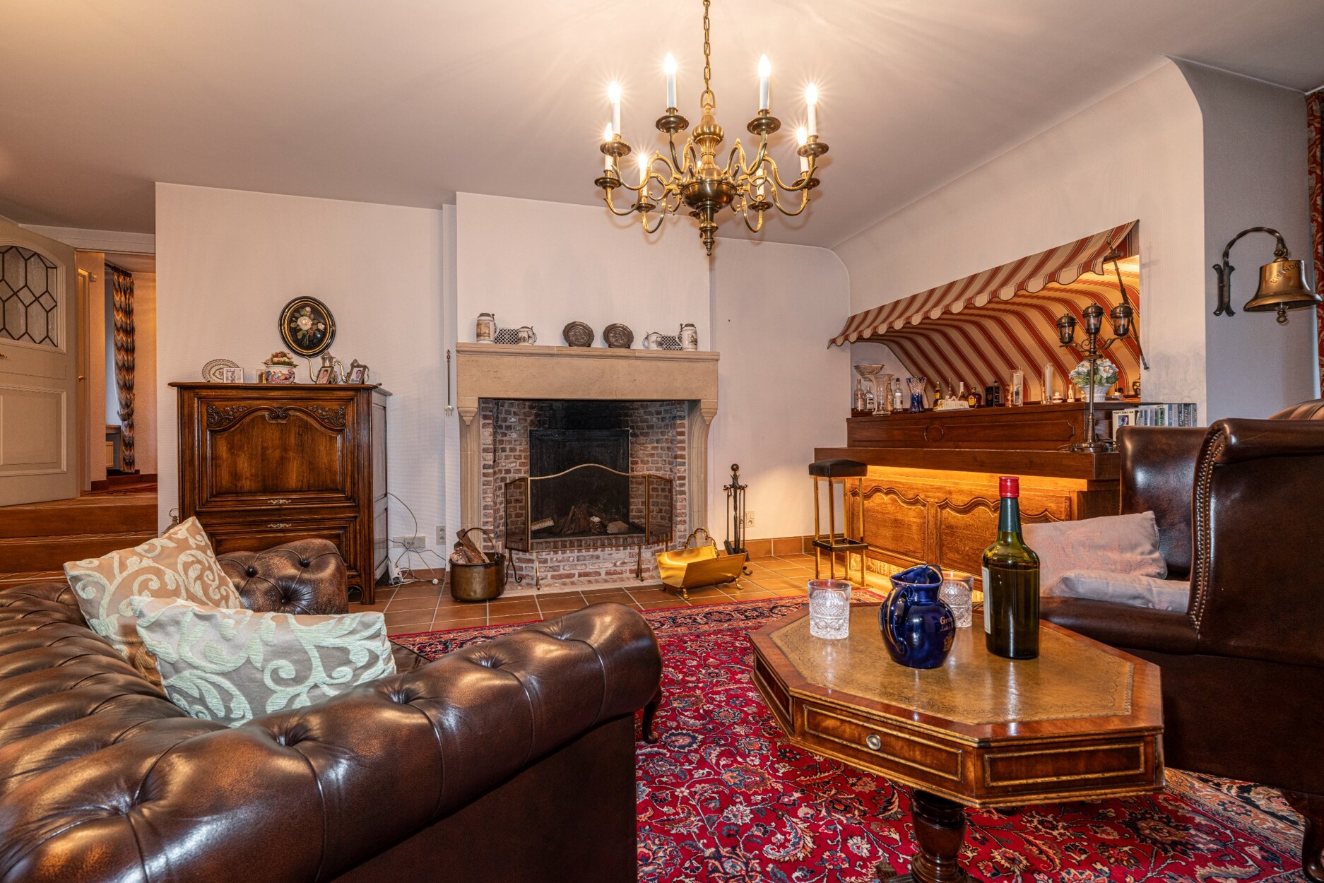 De 3e en 4e slaapkamer delen een communicerende badkamer tussenin. De 5e kamer is momenteel ingericht als extra woonkamer met mooie kasteelhaard, bar, balkon en extra bergkamer.