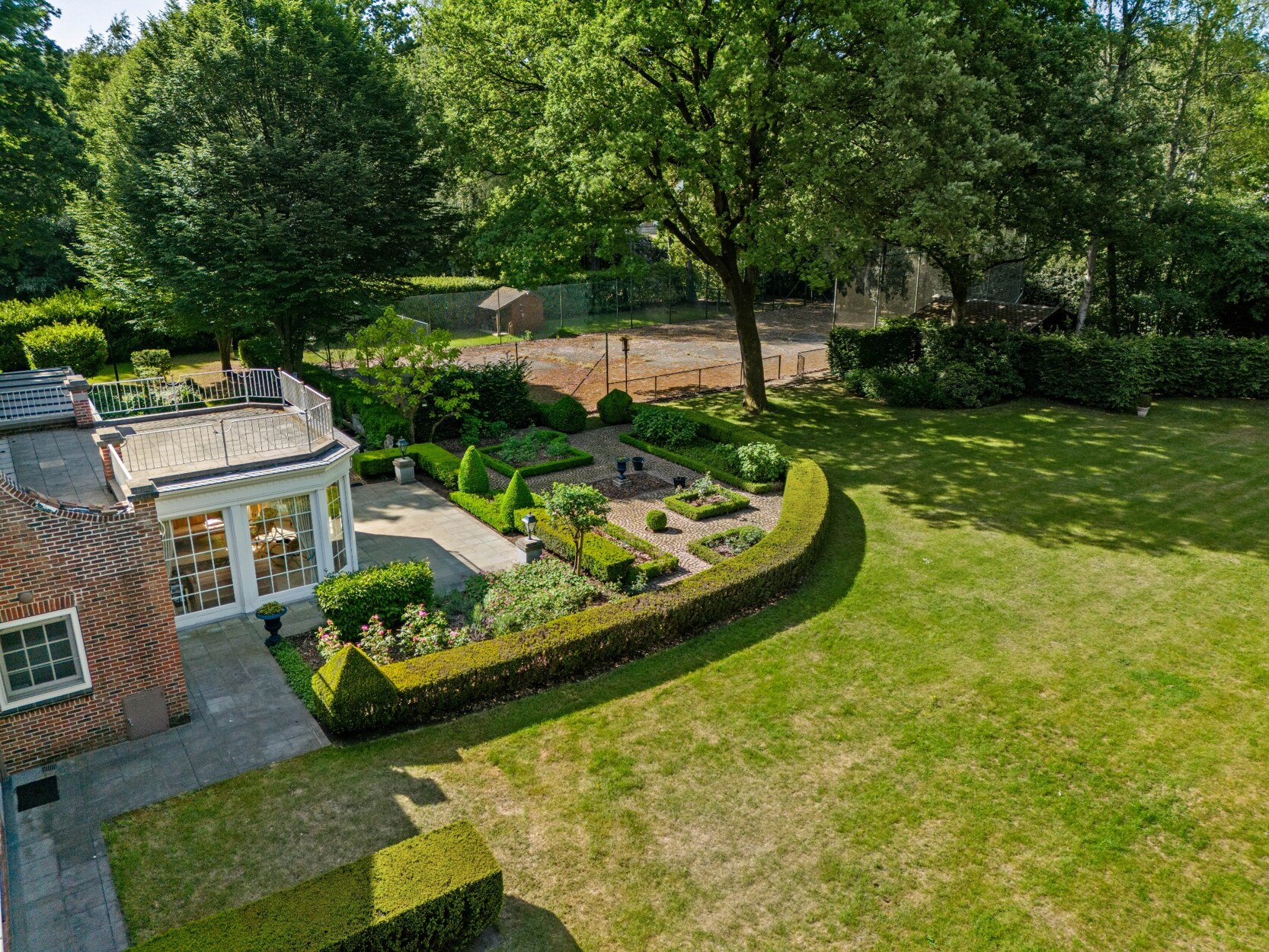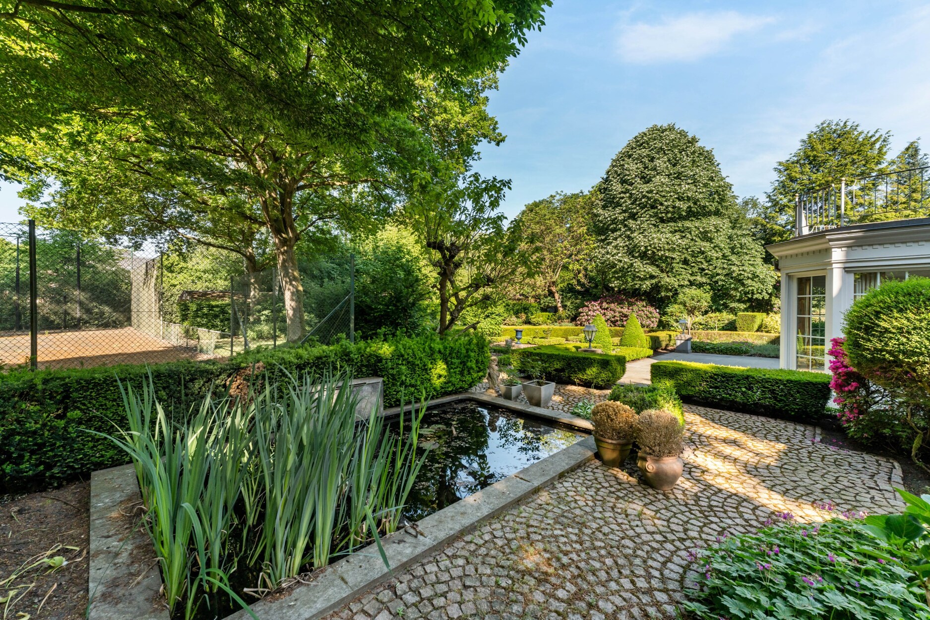 - Mooi aangelegde en zonnige tuin met oa. mooi terras, vijverpartij, tennisterrein en tuinbergingen