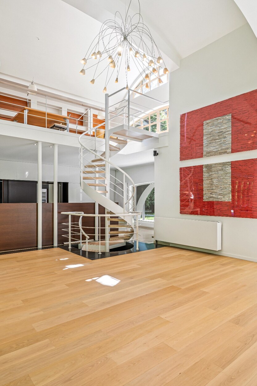 We betreden de woning via een ruime inkomhal met gastentoilet en vestiaire. Deze centrale hal geeft enerzijds uit op de riante en lichtrijke woonkamer met indrukwekkende vide. Hier vinden we verschillende zitruimtes en een eetkamer. De mezzanine wordt momenteel gebruikt als een fantastische home office met een leuk contact met de woonkamer en eigen zonnig terras.