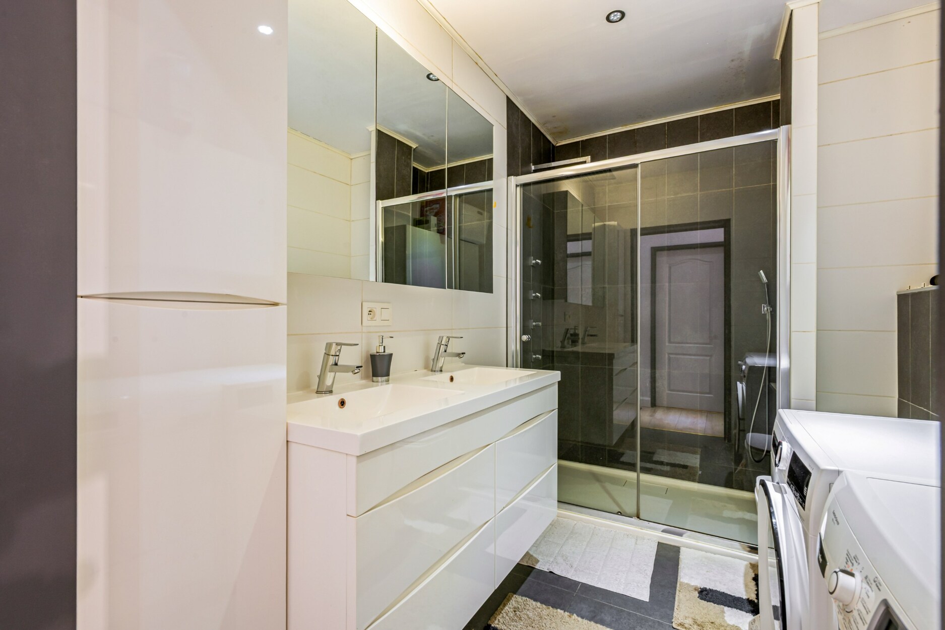 De lichtrijke leefruimte met zithoek en eethoek geniet van grote raampartijen aan de voorzijde, wat zorgt voor een open en aangename sfeer. Aansluitend vind je de recente, volledig uitgeruste keuken met natuurstenen werkblad, spatwand, voldoende kastruimte en moderne toestellen: inductiekookplaat, stoomoven, combi-oven, koelkast en ruime ingebouwde vriezer. Vanuit de keuken heb je rechtstreeks toegang tot het voorste terras.