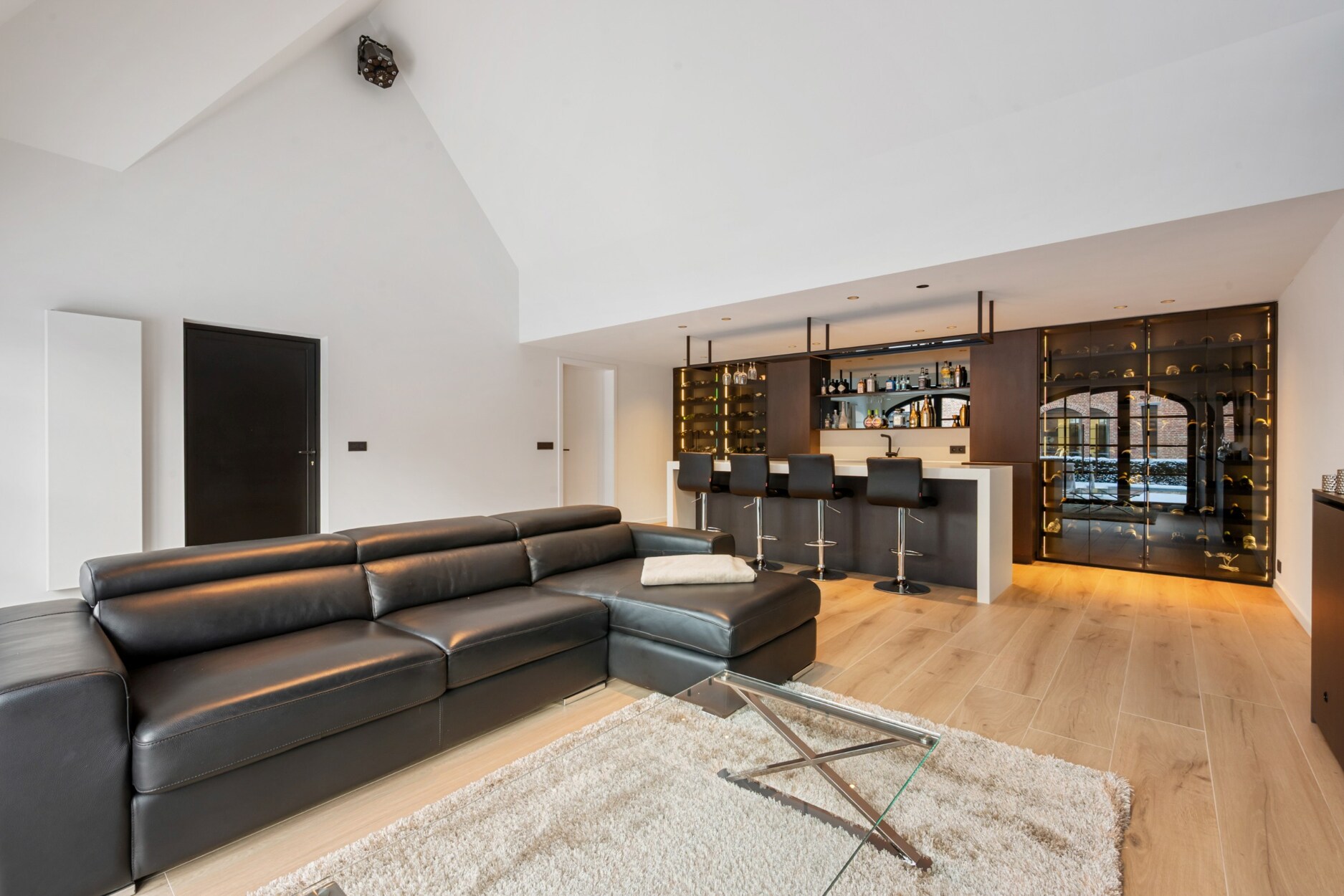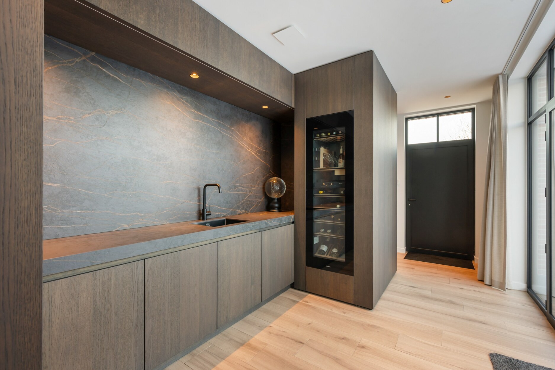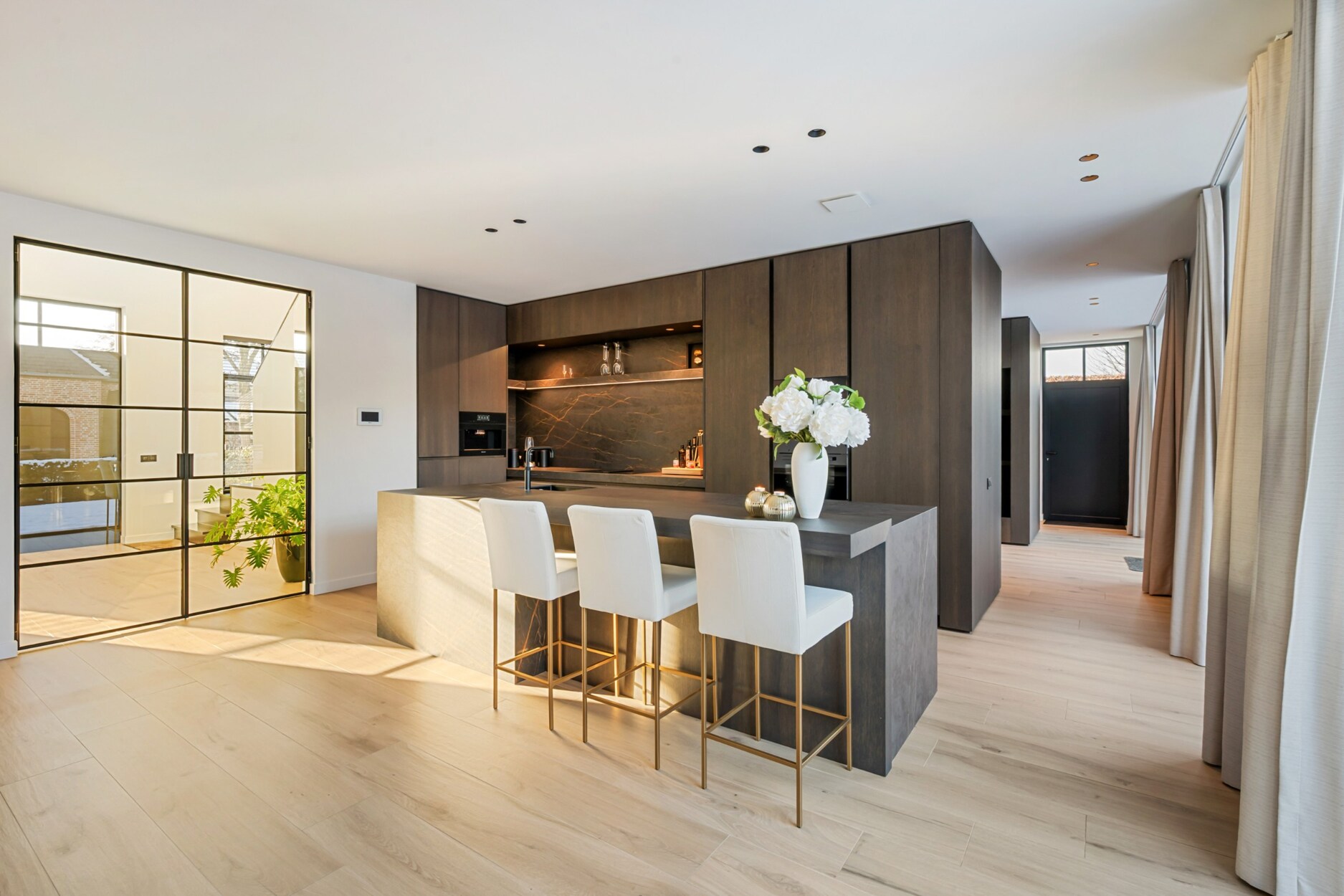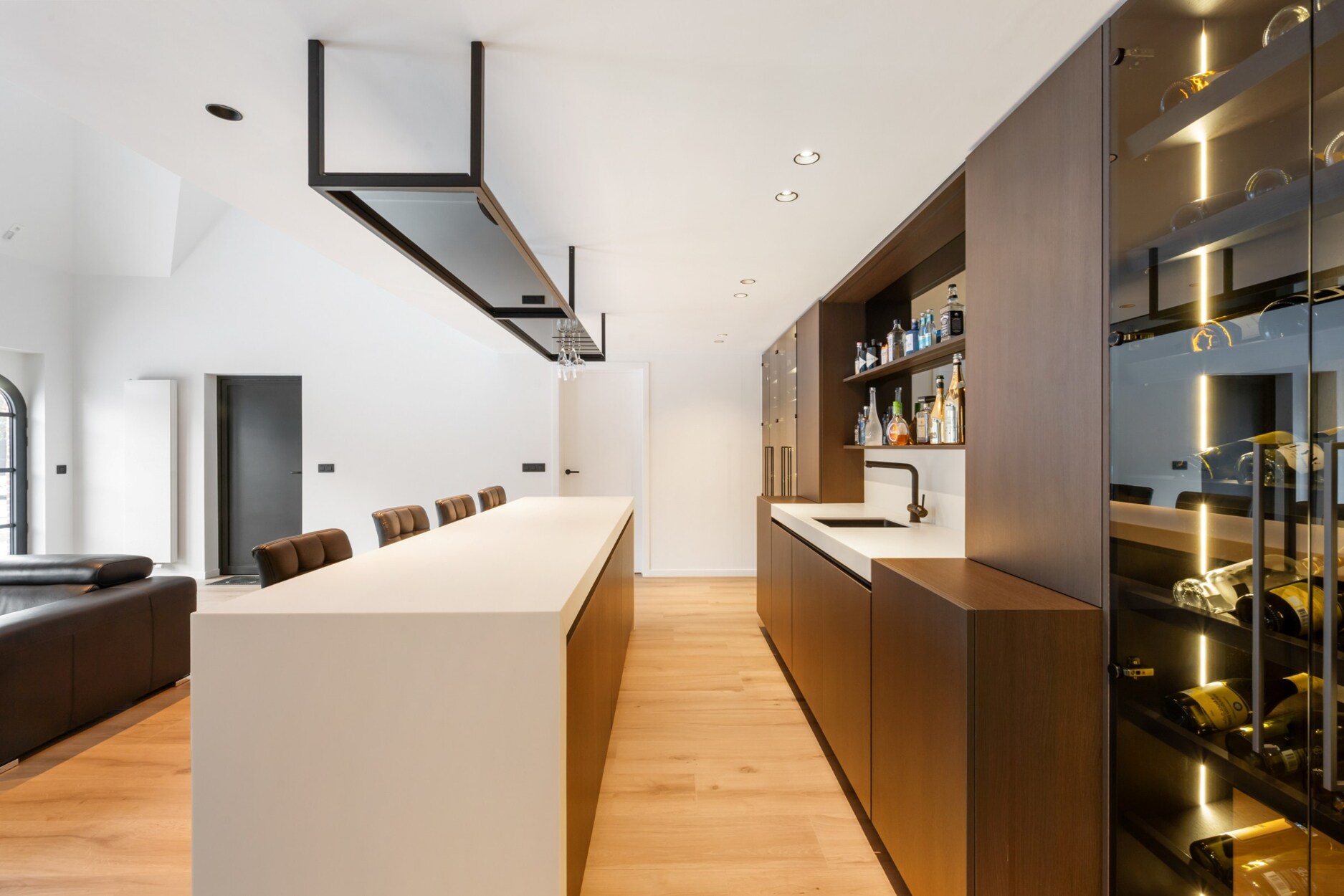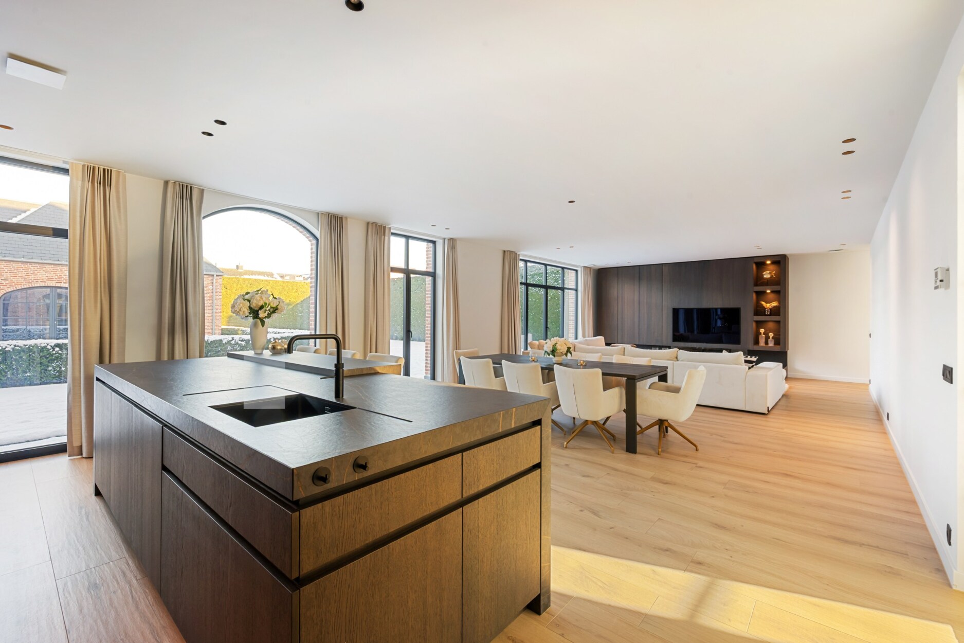 U betreedt de majestueuze inkomhal van deze villa met gastentoilet vestiaireruimte. Rechts hebt u onmiddellijk toegang tot de kantoorruimte met inbouwkasten en bureau. Via de dubbele deur in glas/staal komt u in de leefruimte met open keuken, eet- en zitruimte. De keuken is compleet en zeer luxe afgewerkt en omvat alle moderne keukenapparatuur zoals inductiekookplaat met Bora afzuiging, inbouwkoffiemachine, 2 ovens, koelkast. Overige toestellen vindt u in de aanpalende bijkeuken met oa Dry aged kast, grote wijnkast, 2 vriezers, dewelke tevens in dezelfde stijl en graad van van afwerking verkeert als de keuken.