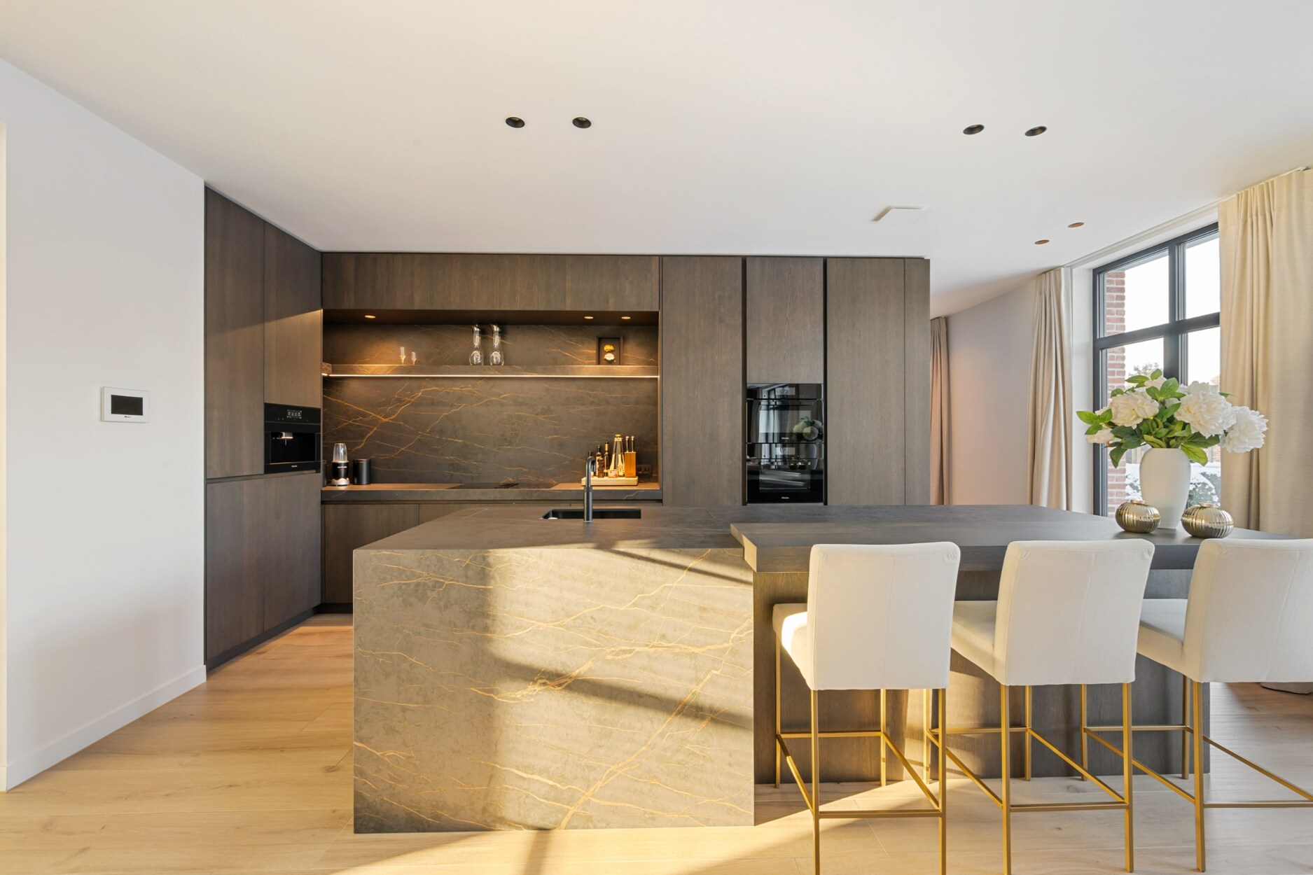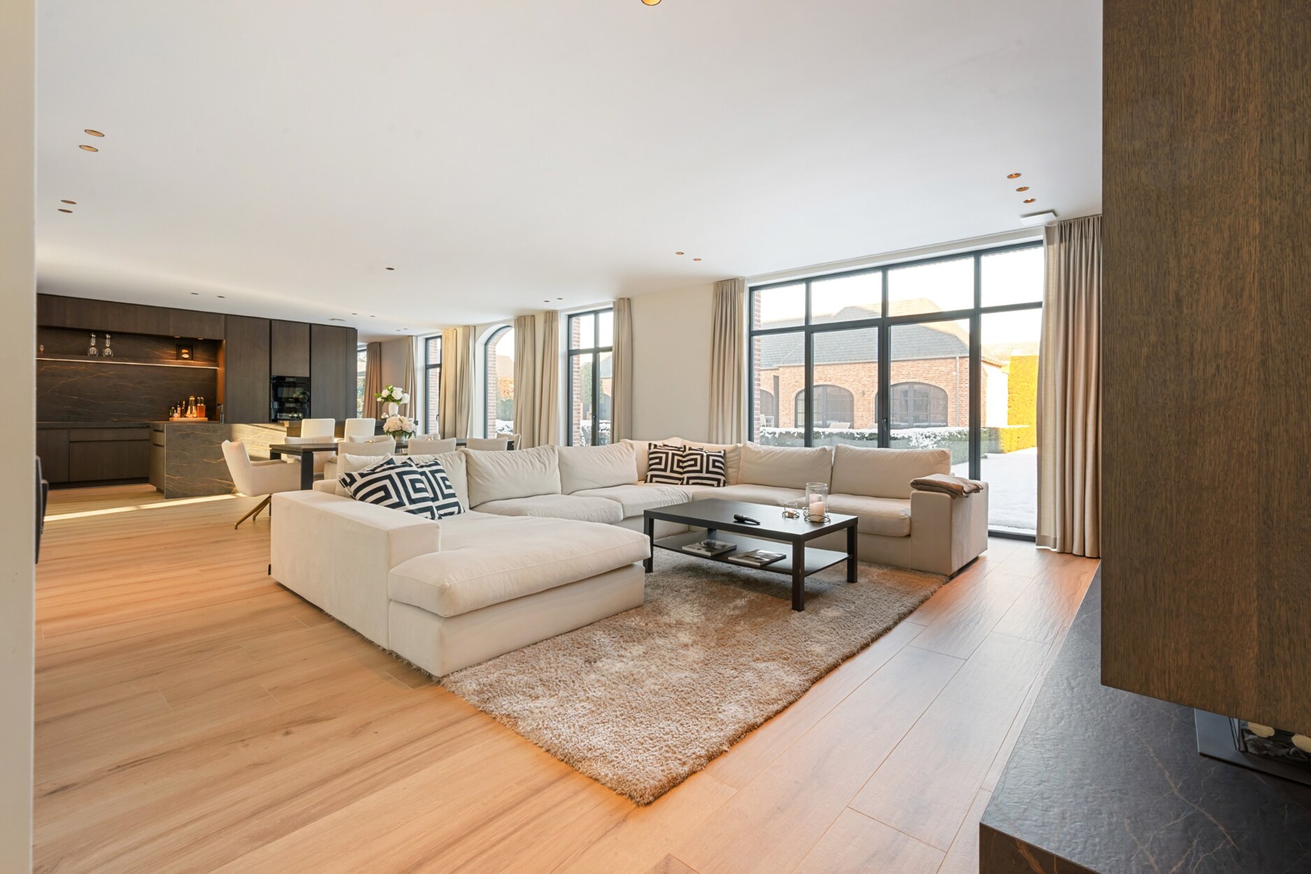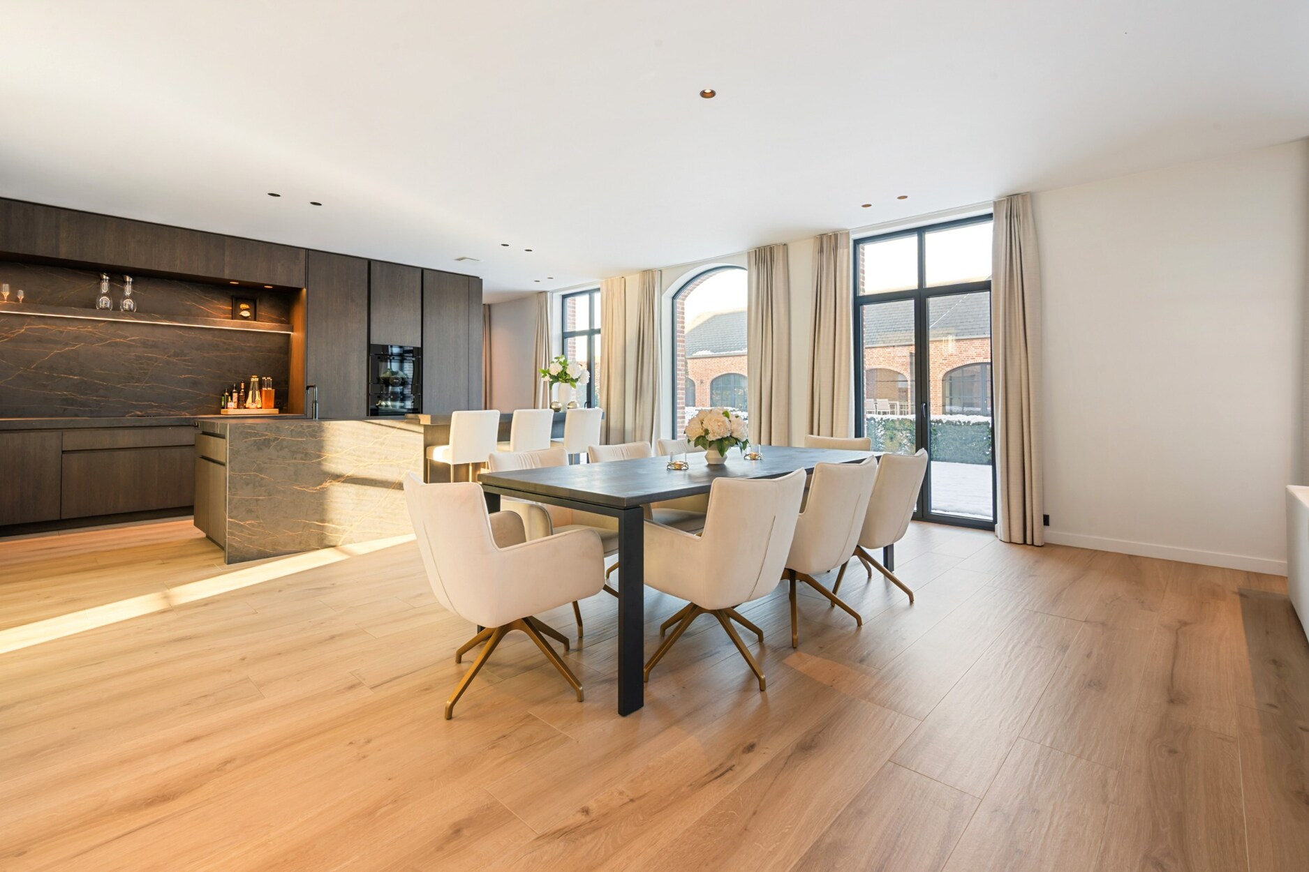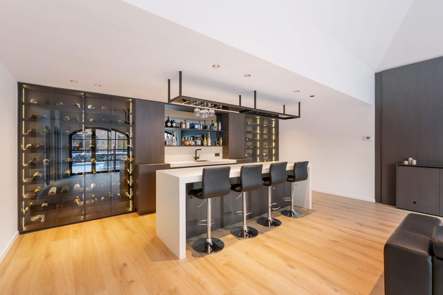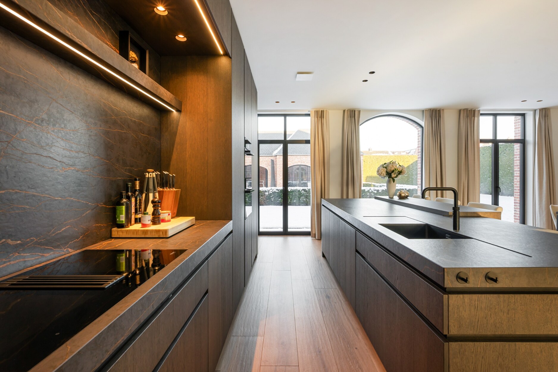 U betreedt de majestueuze inkomhal van deze villa met gastentoilet vestiaireruimte. Rechts hebt u onmiddellijk toegang tot de kantoorruimte met inbouwkasten en bureau. Via de dubbele deur in glas/staal komt u in de leefruimte met open keuken, eet- en zitruimte. De keuken is compleet en zeer luxe afgewerkt en omvat alle moderne keukenapparatuur zoals inductiekookplaat met Bora afzuiging, inbouwkoffiemachine, 2 ovens, koelkast. Overige toestellen vindt u in de aanpalende bijkeuken met oa Dry aged kast, grote wijnkast, 2 vriezers, dewelke tevens in dezelfde stijl en graad van van afwerking verkeert als de keuken.