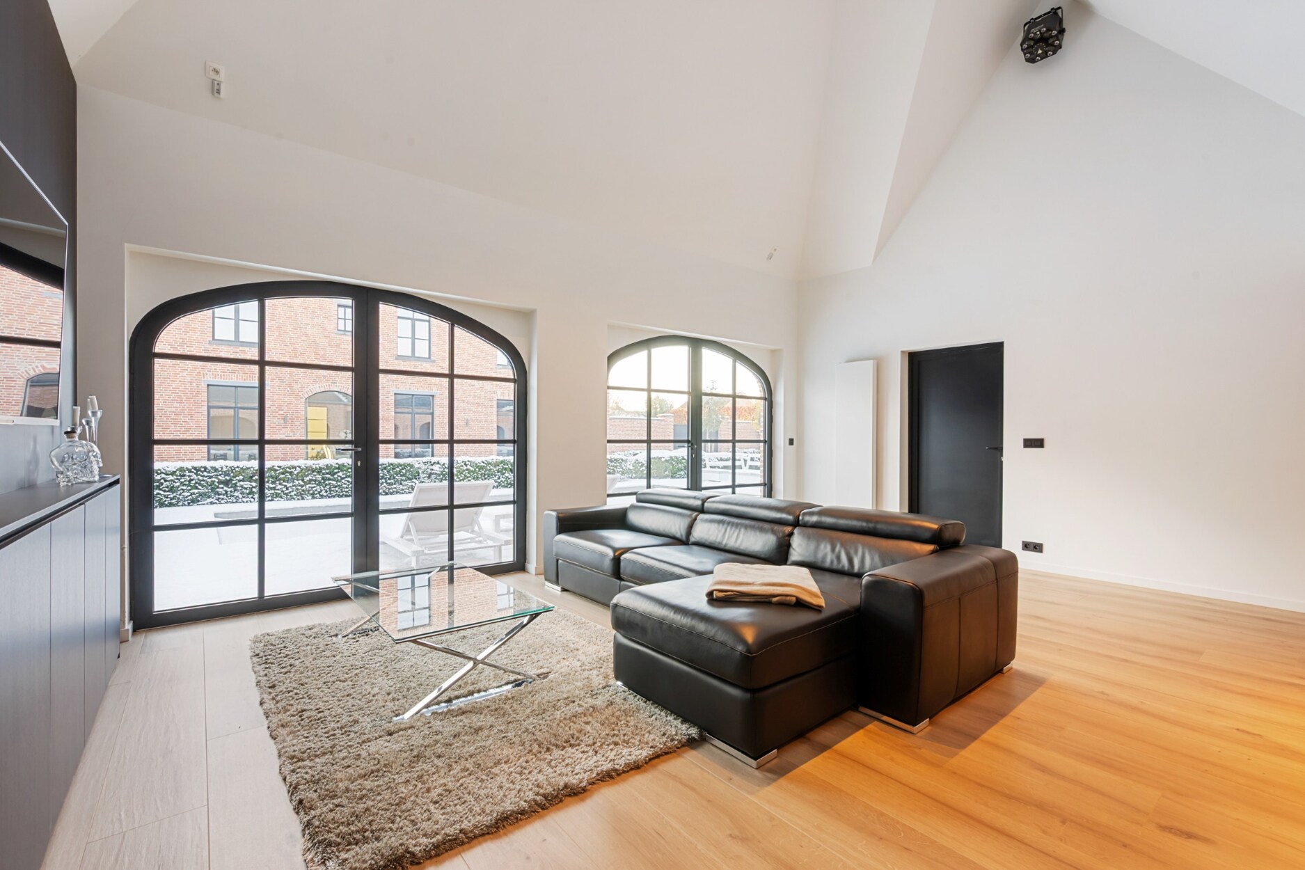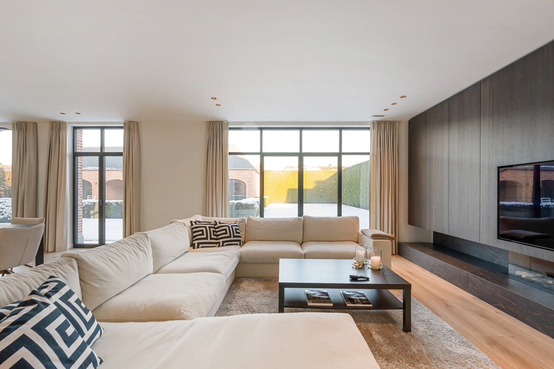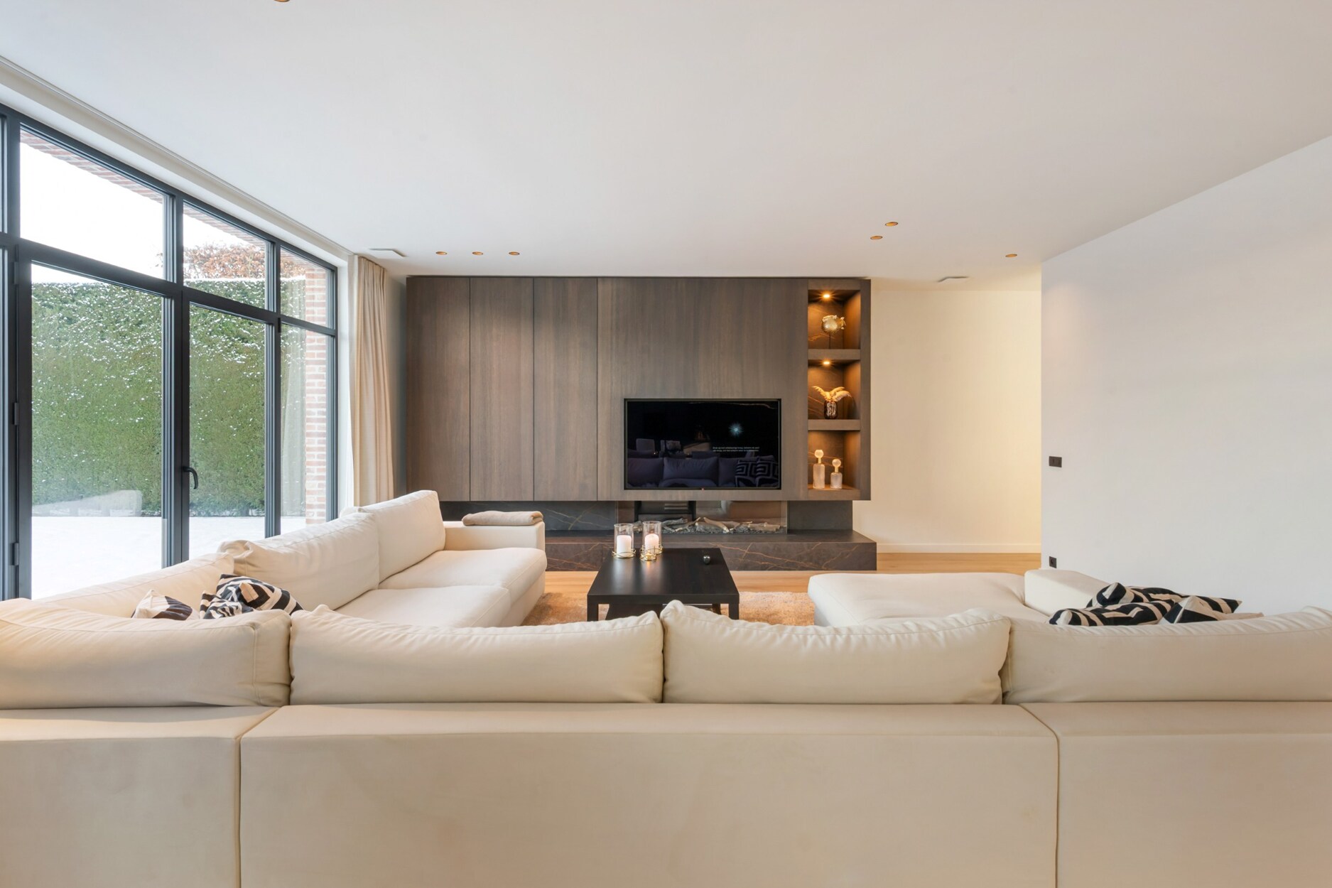 De eet- en zitruimte genieten van veel natuurlijke lichtinval dmv de grote raampartijen en bieden directe toegang tot het terras en de tuin. Sfeervolle kastenwand in eikenfineer met gashaard maakt van de zithoek een gezellige leefhoek. De speelruimte bevindt zich aanpalend de leefruimte. Ideaal voor jonge gezinnen. Verder op het gelijkvloers treft u de inpandige garage met twee automatische toegangspoorten.