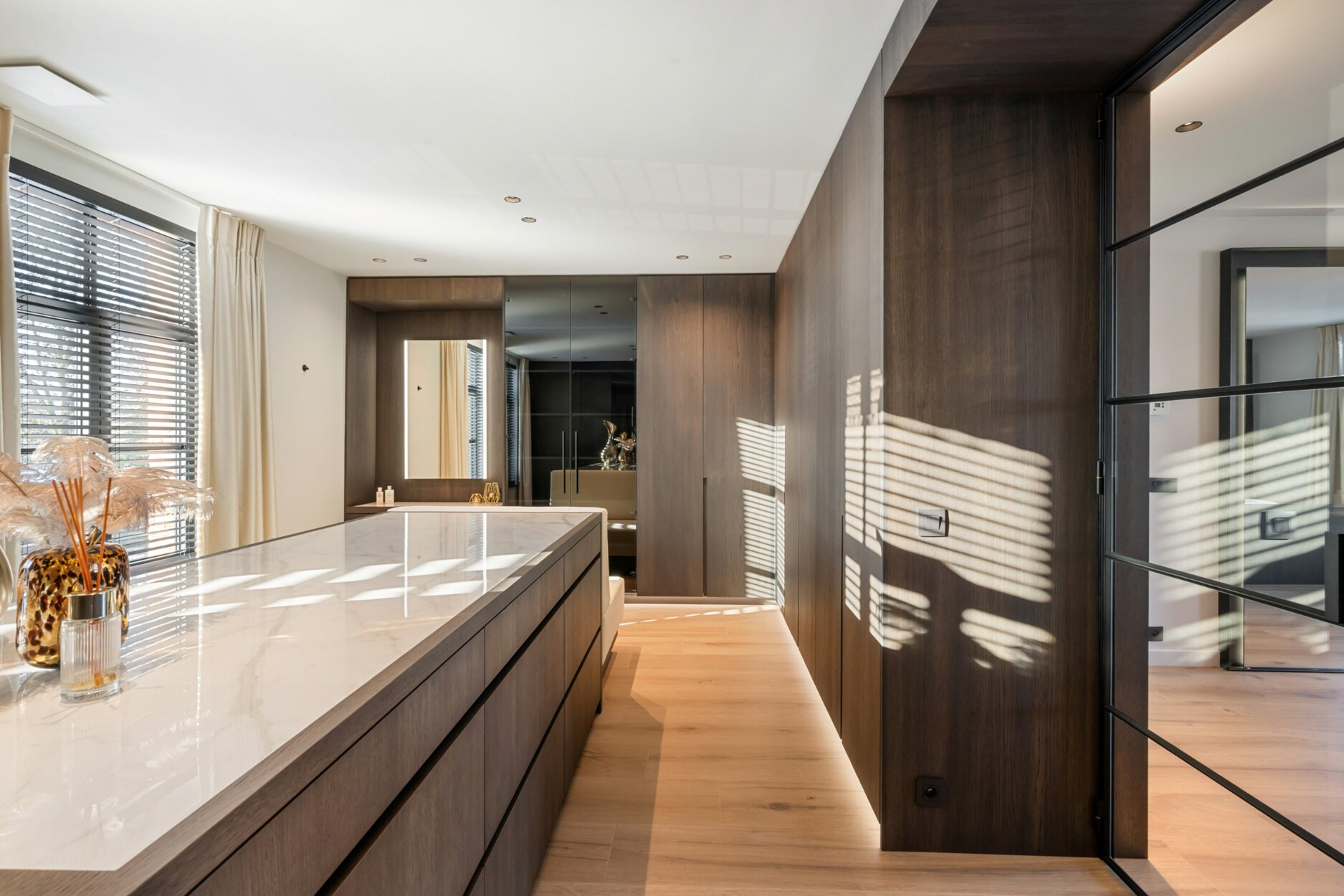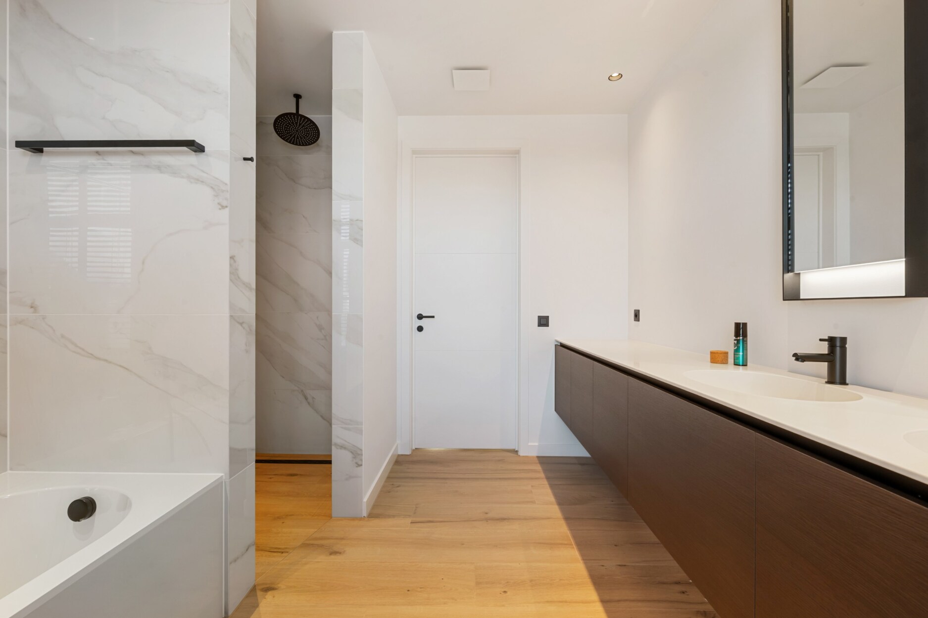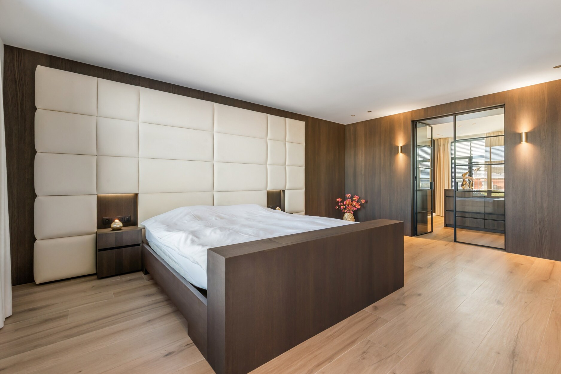 De mastersuite aan de rechterzijde van de villa is zeer ruim en omvat een masterbedroom (ca. 30 m²) met vast meubilair en inbouwtelevisie aan de achterzijde van het bed, een aanpalende luxe dressing met eiland (25 m²) en een badkamer met inloopdouche, ligbad, toilet en twee wastafels. Deze ruimten zijn allen van elkaar gescheiden door glazen deuren in staal. De gehele suite kent een ongeziene afwerkingsgraad!