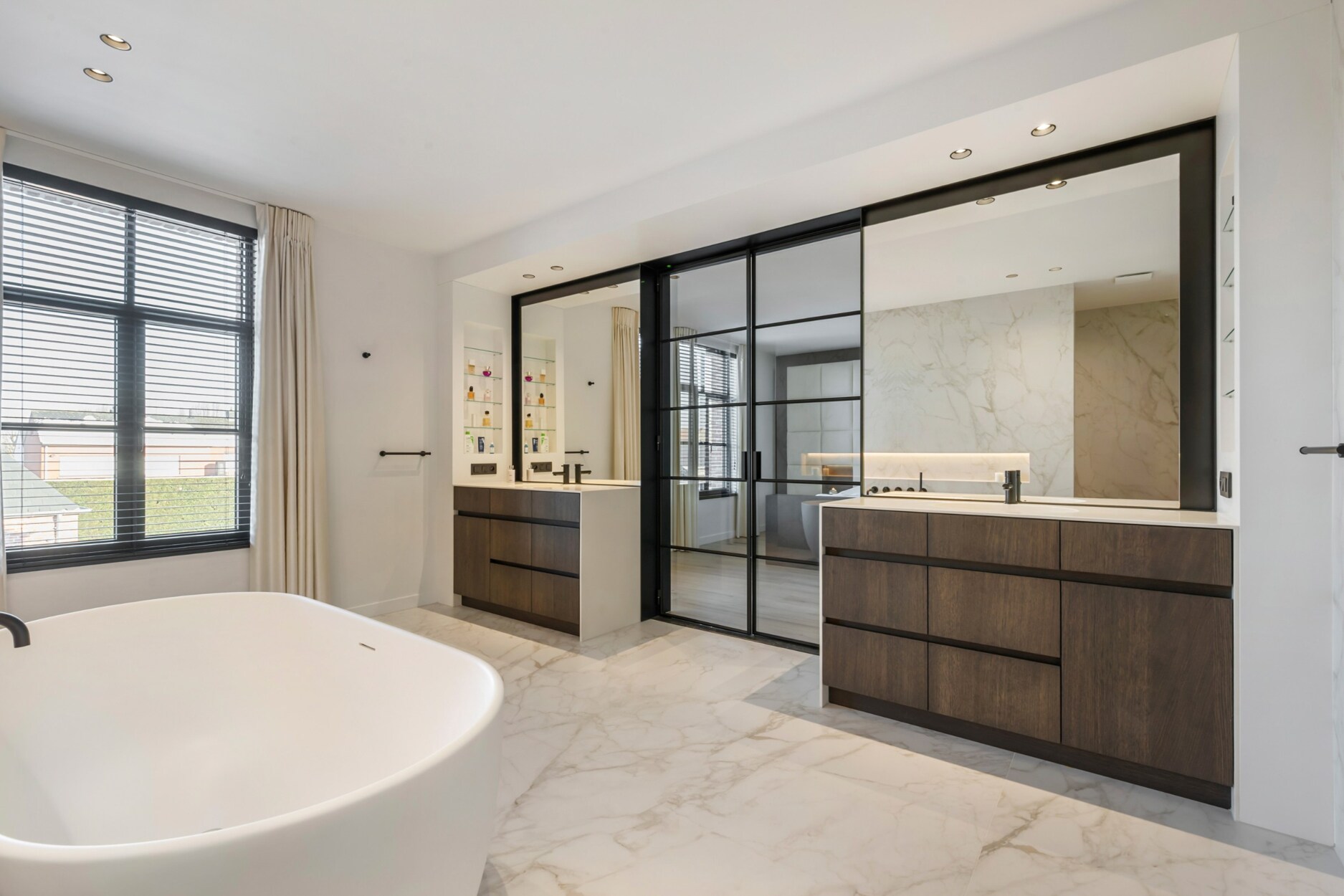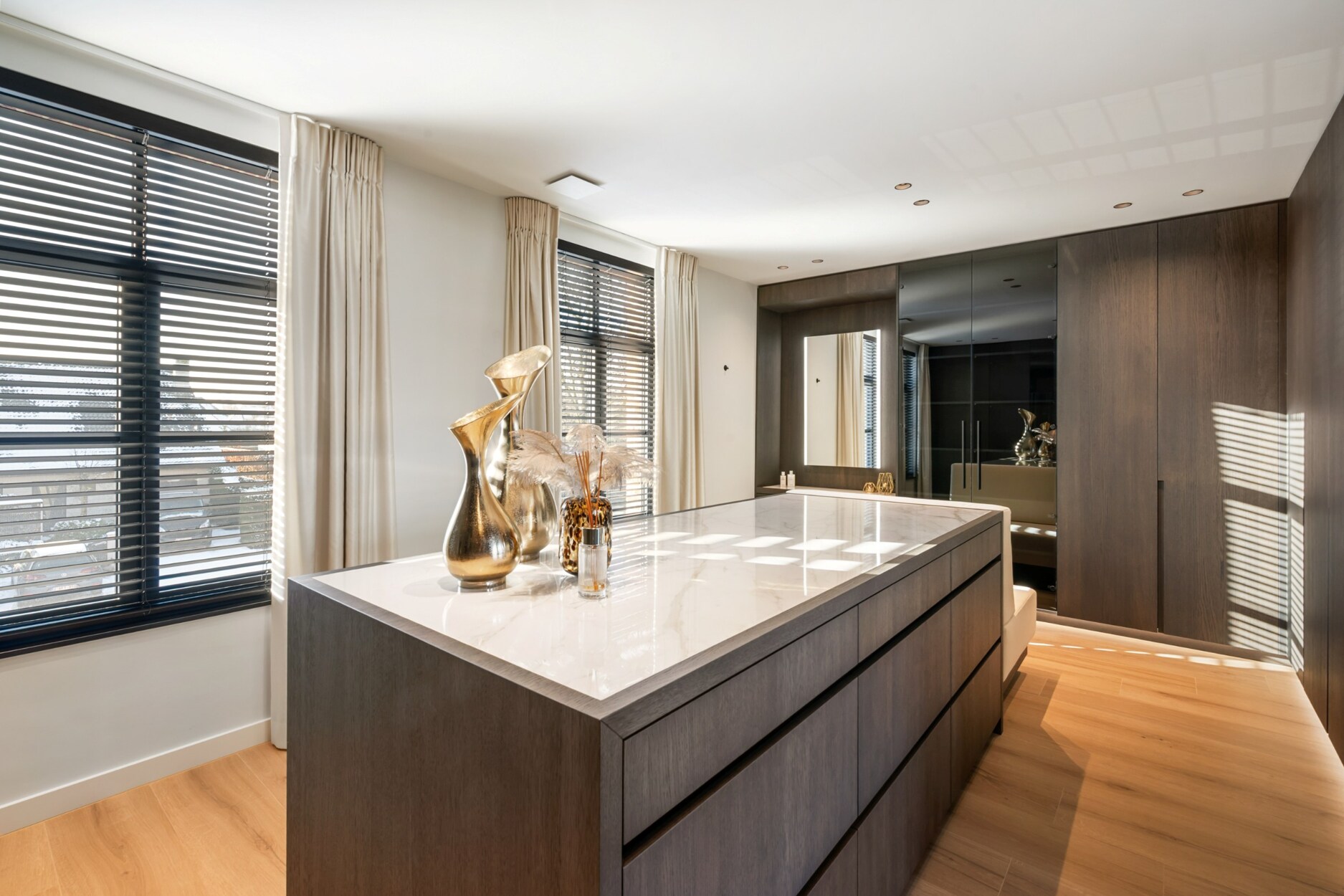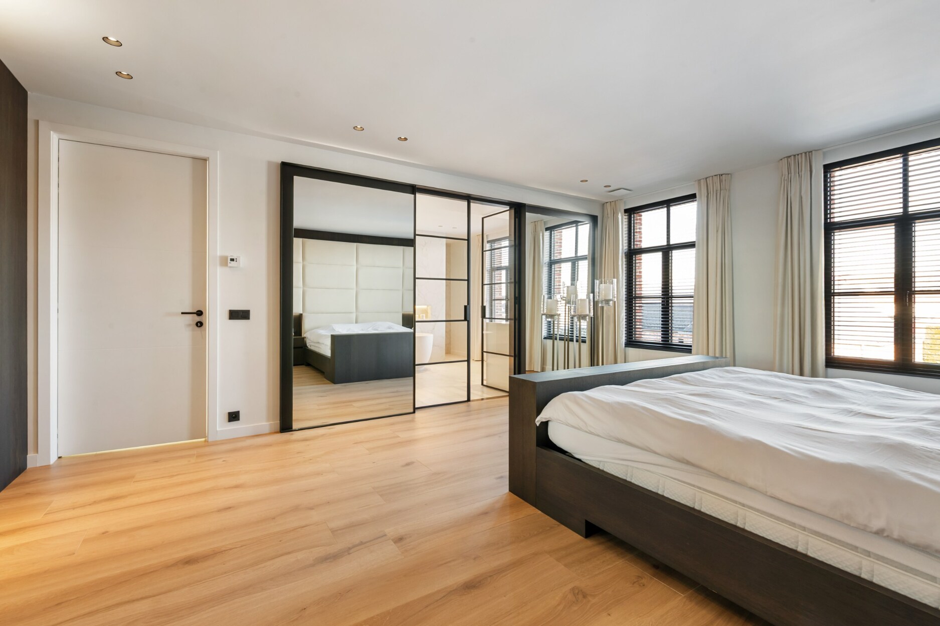 De mastersuite aan de rechterzijde van de villa is zeer ruim en omvat een masterbedroom (ca. 30 m²) met vast meubilair en inbouwtelevisie aan de achterzijde van het bed, een aanpalende luxe dressing met eiland (25 m²) en een badkamer met inloopdouche, ligbad, toilet en twee wastafels. Deze ruimten zijn allen van elkaar gescheiden door glazen deuren in staal. De gehele suite kent een ongeziene afwerkingsgraad!