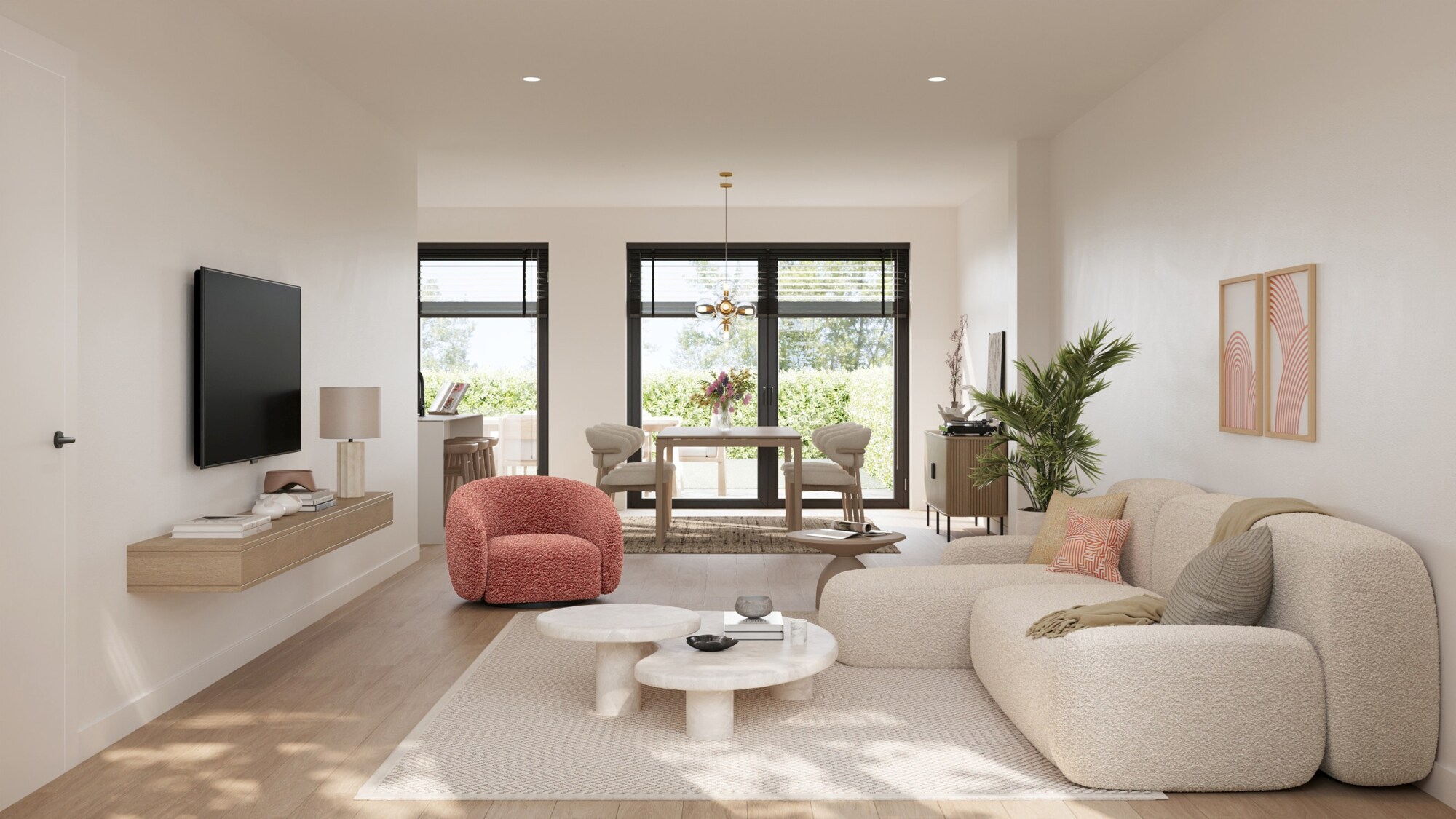 De inkomhal met gastentoilet verleent toegang de gezellige leefruimte op parket met open keuken. De keuken is compleet ingericht met alle moderne apparatuur (combi-oven, koelkast, dampkap, vaatwas, inductiekookplaat). De leefruimte heeft een mooi zicht op de tuin, dankzij grote glaspartijen. De wasplaats/bergruimte is voorzien van aansluitingen voor wasmachine en alle technische voorzieningen.