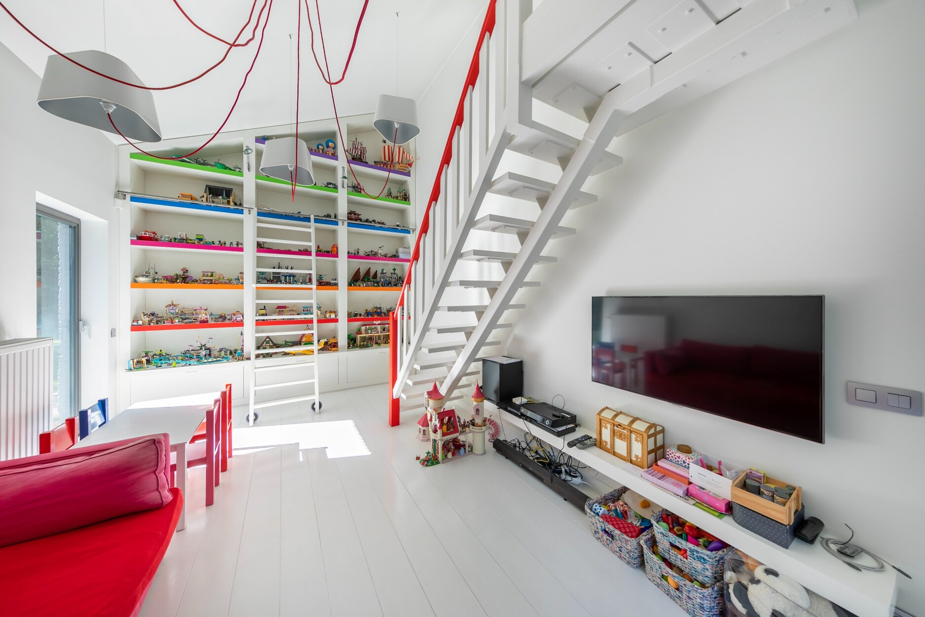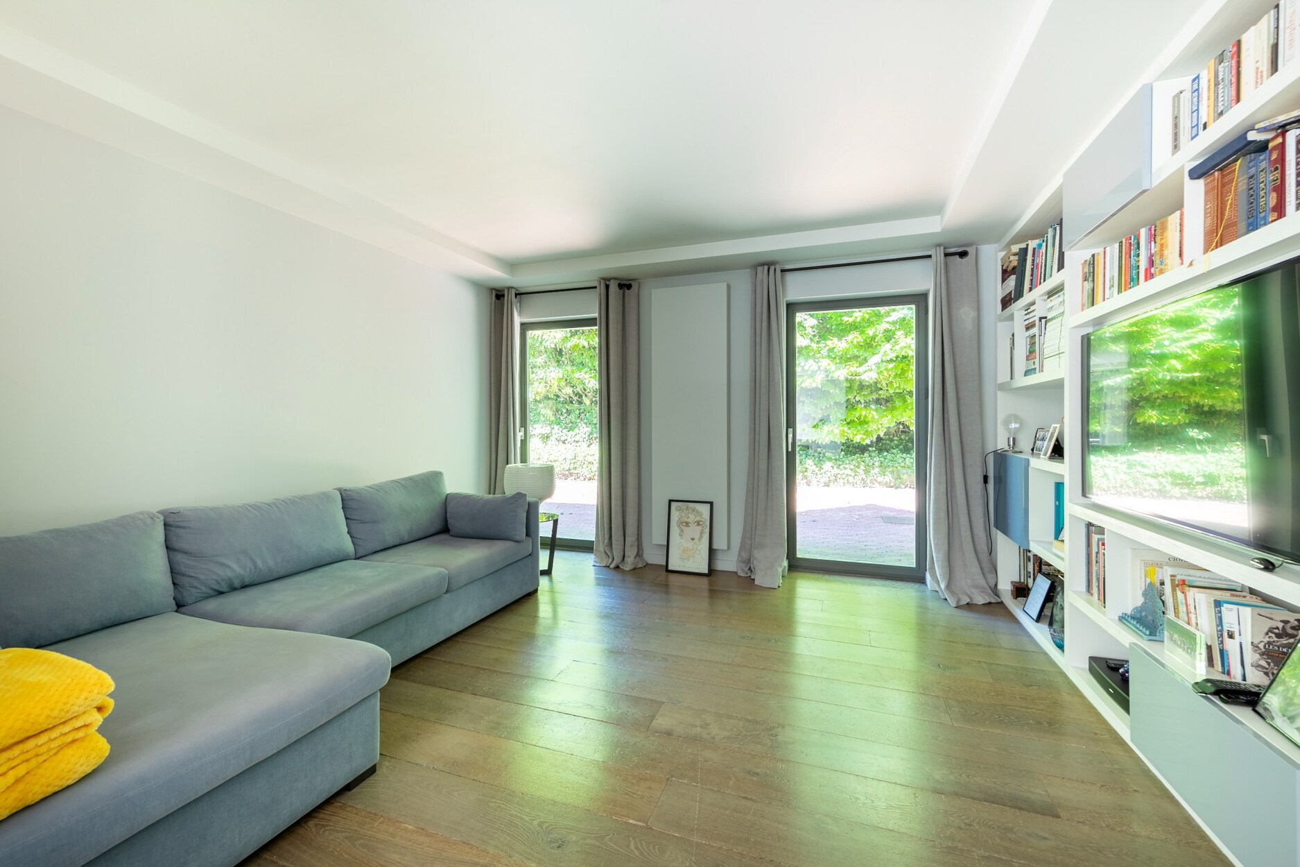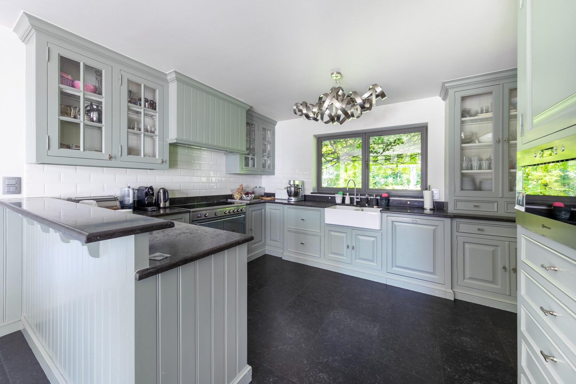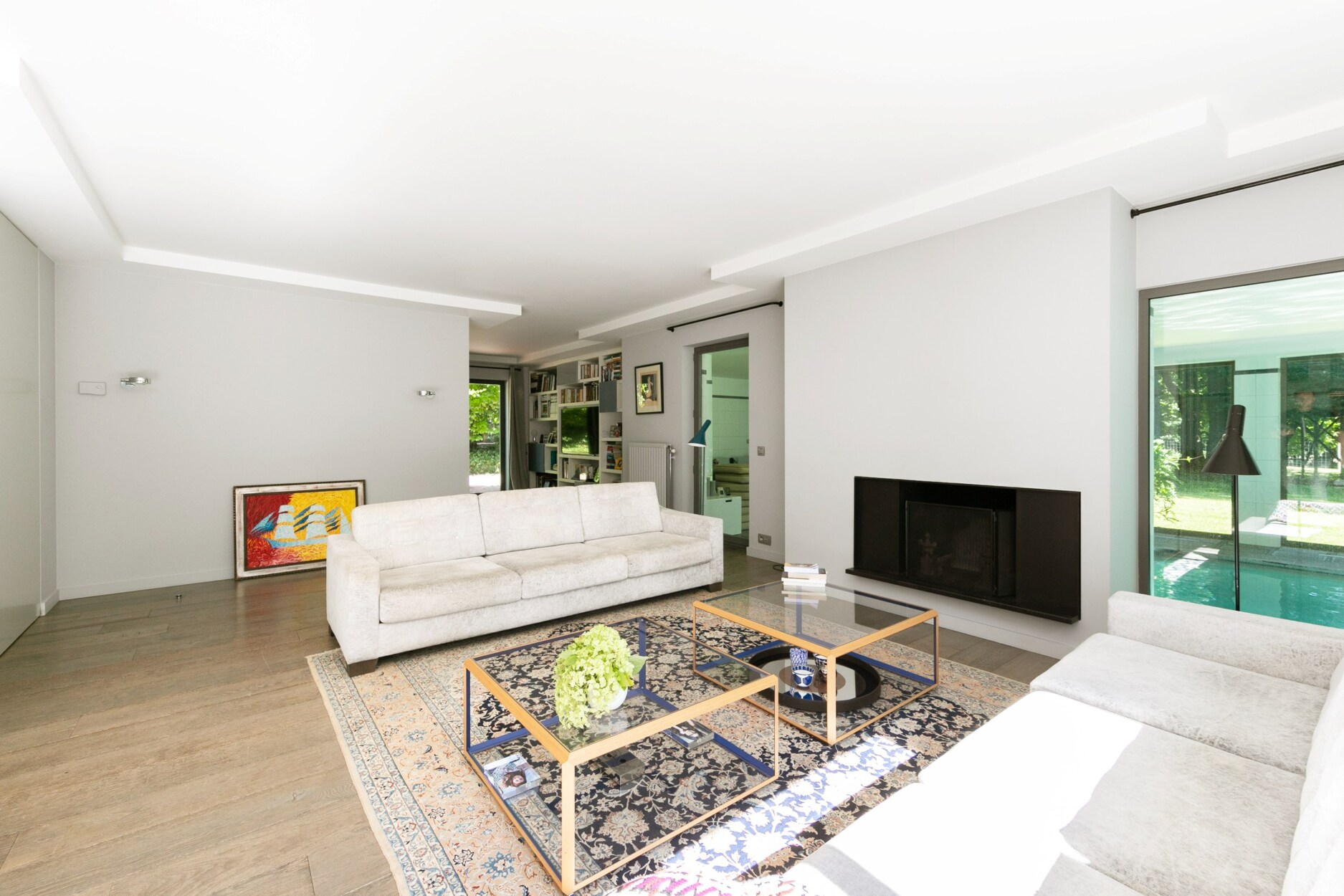 Het gelijkvloers omvat een inkomhal met vestiaire en gastentoilet, die uitgeeft op ruime leefruimten met een salon met haard, een bibliotheek-/TV-ruimte en een eetkamer. De volledig uitgeruste leefkeuken staat in verbinding met een family room of slaapkamer met mezzanine, met aparte toegang naar buiten en geschikt voor een vrij beroep. Een veranda aan de leefruimten herbergt een binnenzwembad en opent via grote schuiframen naar de tuin.