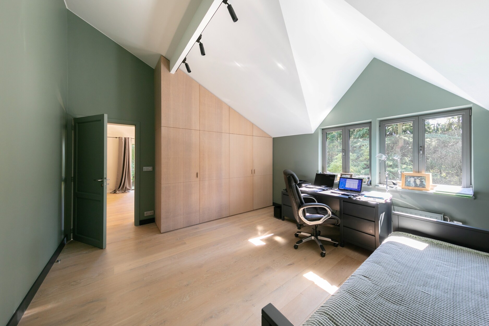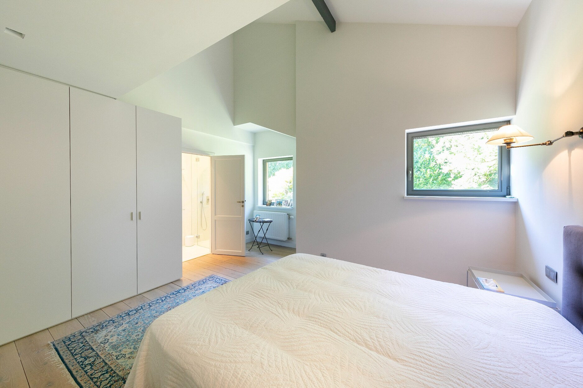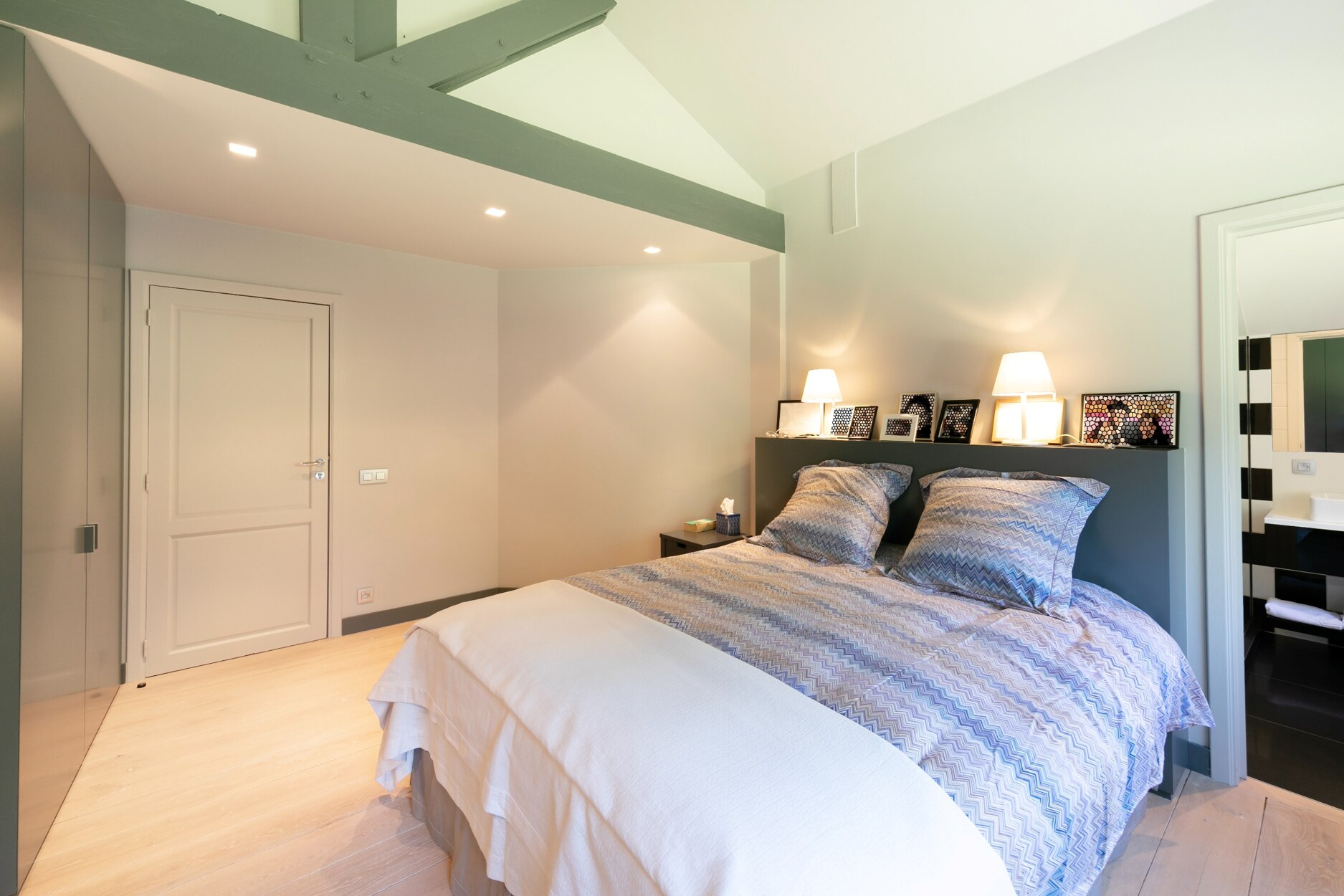 Op de verdieping bevindt zich de master suite met slaapkamer, complete badkamer met jacuzzi en inloopdouche, en een bureau/dressing. Vier bijkomende slaapkamers, vier doucheruimtes en afzonderlijke toiletten vervolledigen het geheel. Ingebouwde kasten en maatmeubilair zijn discreet geïntegreerd.