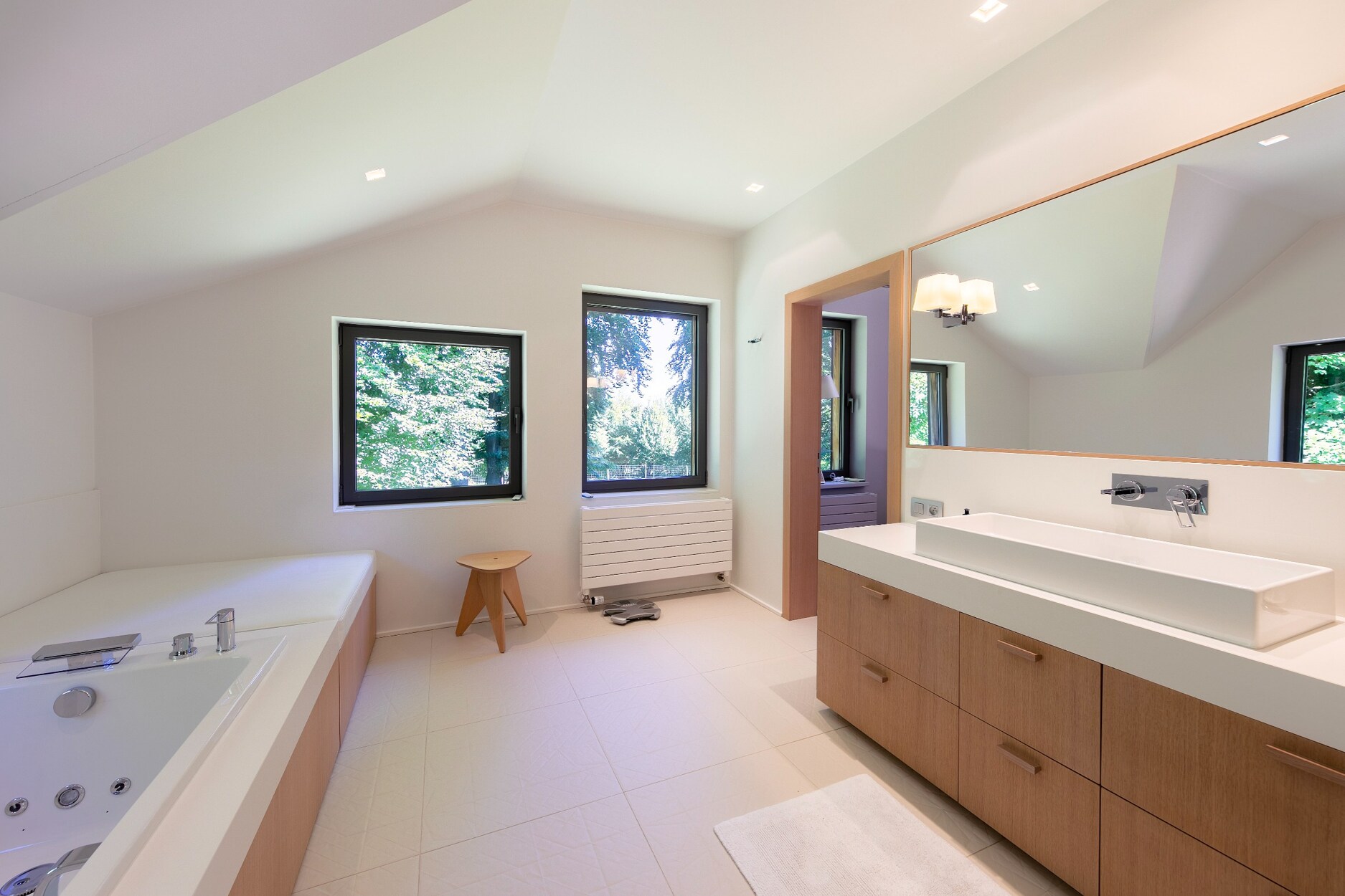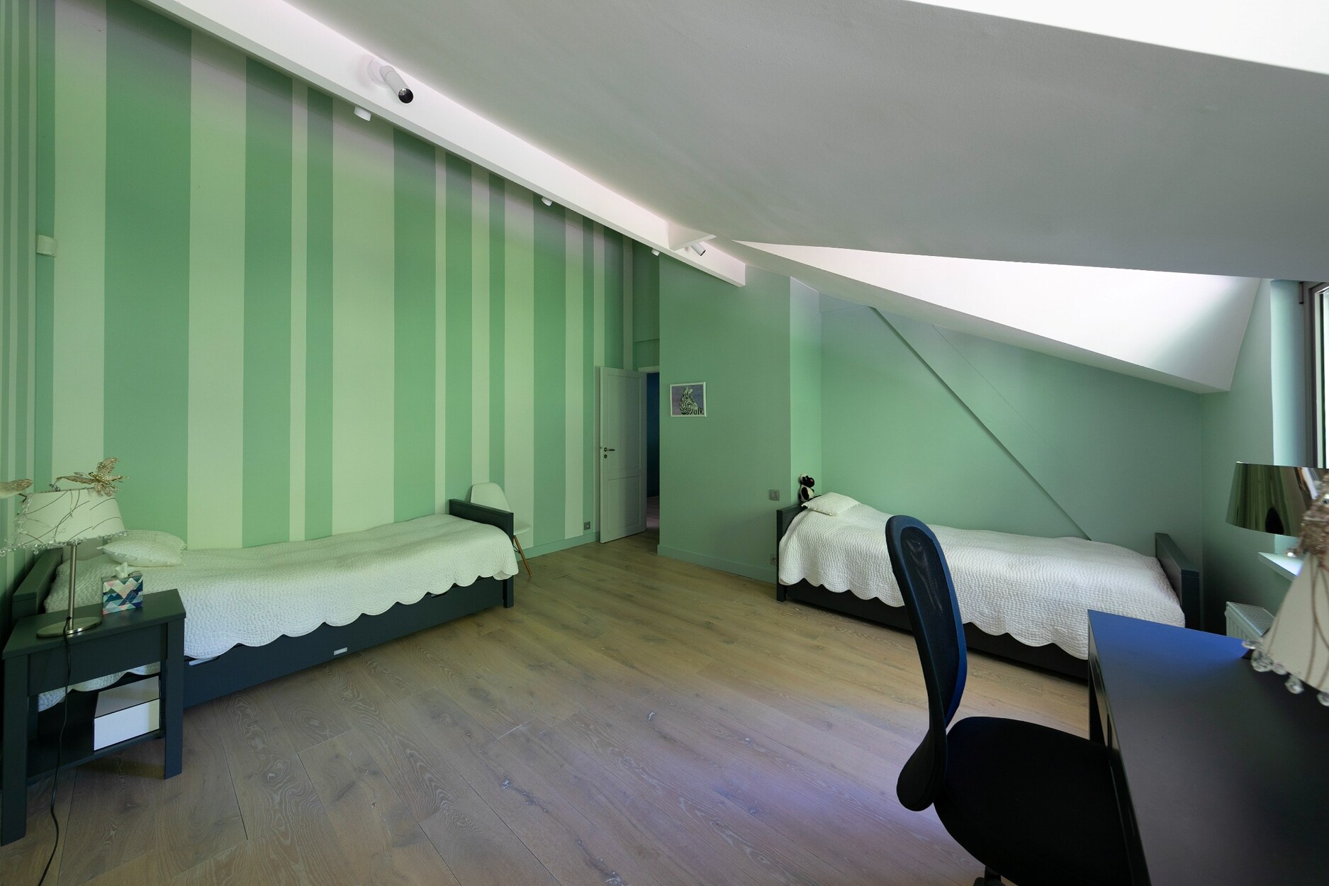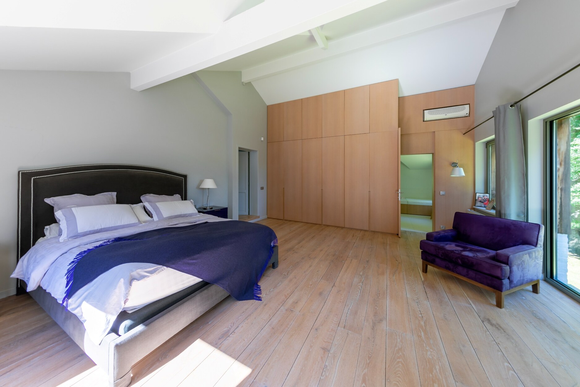 Op de verdieping bevindt zich de master suite met slaapkamer, complete badkamer met jacuzzi en inloopdouche, en een bureau/dressing. Vier bijkomende slaapkamers, vier doucheruimtes en afzonderlijke toiletten vervolledigen het geheel. Ingebouwde kasten en maatmeubilair zijn discreet geïntegreerd.