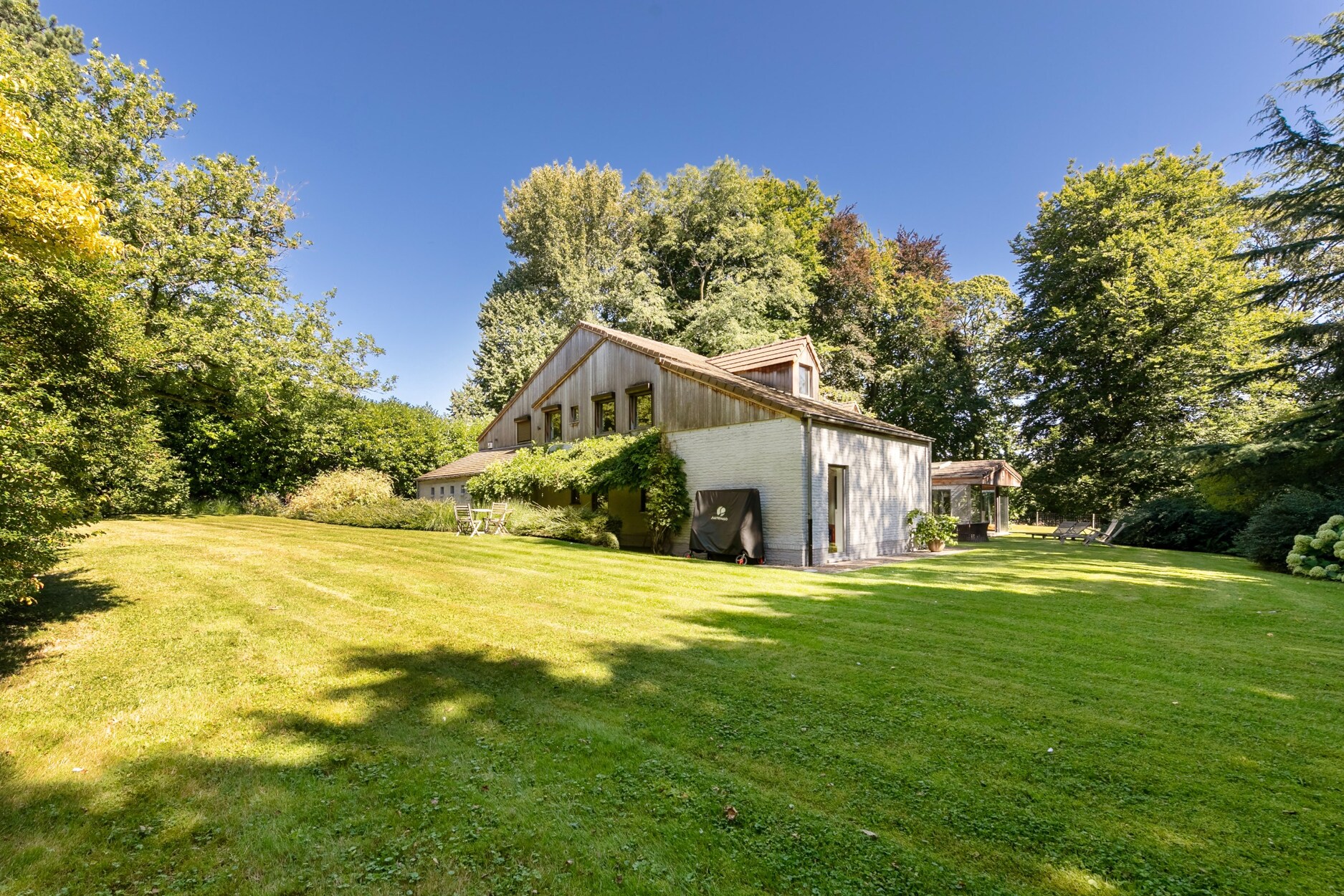 Ideaal gelegen in de gegeerde wijk van de voormalige golf van Rhode-Saint-Genèse werd deze hedendaagse villa volledig gerenoveerd in 2013 door Troisième Bureau. Ze biedt circa 570 m² bewoonbare oppervlakte (PEB), verdeeld over twee niveaus, en is ingeplant op een zuidgericht, aangelegd perceel van ongeveer 3.300 m², zonder inkijk en niet zichtbaar vanaf de straat. De woning beschikt over vijf slaapkamers, vijf badkamers, een speelkamer en een garage voor drie wagens.
