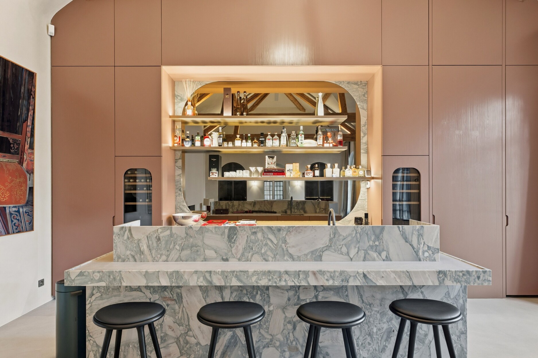 Vanuit de hoofdbouw bereikt men de indrukwekkende leisure-vleugel. De ruime bar en lounge met monumentale houten spanten, hoge plafonds en sculpturale, afgeronde natuurstenen bar doet denken aan een private members club. Maatwerkkasten, verlichte schappen en een wijnklimaatkast versterken de exclusieve uitstraling.