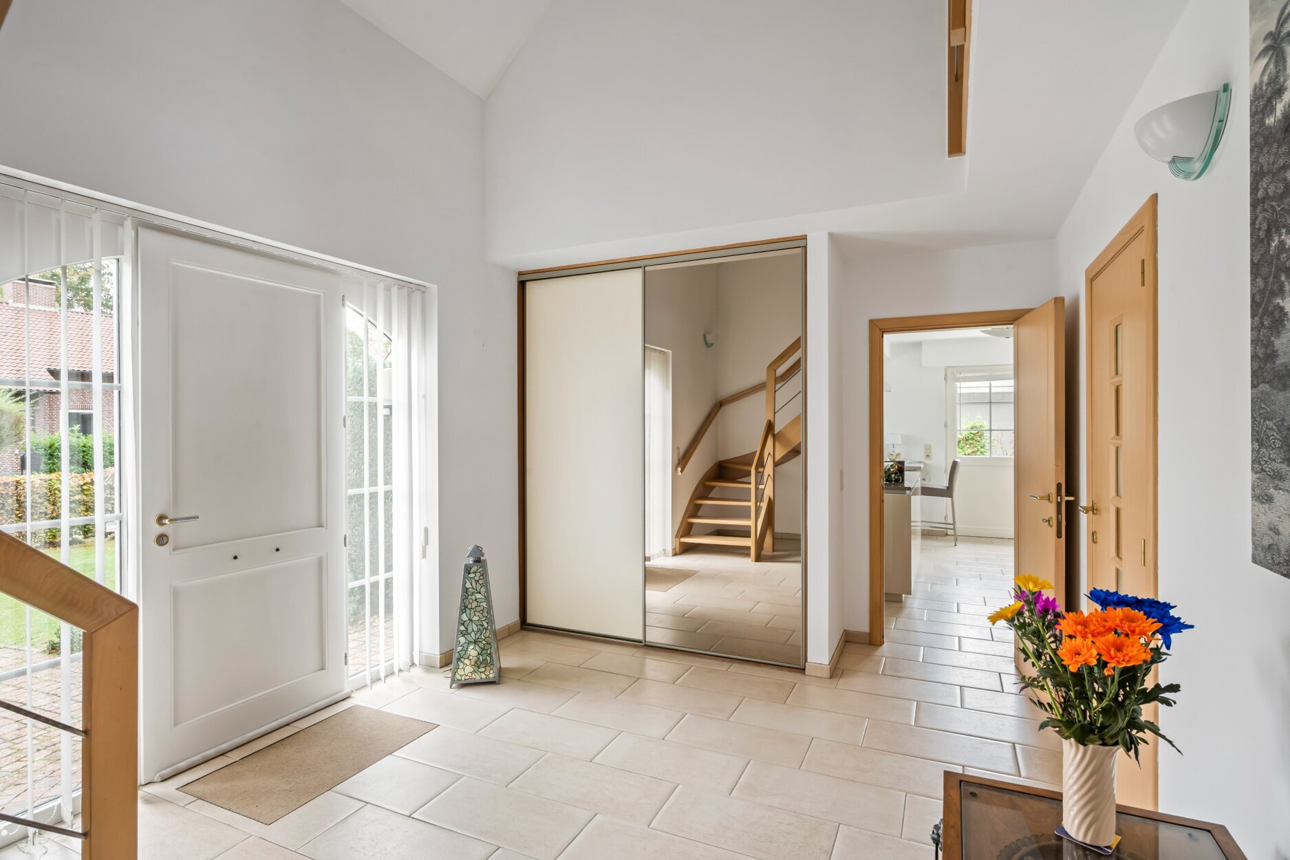 We betreden de woning via de centrale inkomhal met vestiaire en gastentoilet. Via deze ruimte heeft u enerzijds toegang tot de woonkamer met aparte zithoek met gashaard, gezellige erker en aansluitende eetkamer. Anderzijds kunnen we via deze weg de vernieuwde keuken betreden die volledig is geïnstalleerd met koelkast, vaatwasmachine, diepvriezer, inductiekookplaat, combi oven en oven. Deze geeft uit op de eetkamer. De masterbedroom met eigen badkamer is voorzien op de gelijkvloerse verdieping zodat de woning ook ideaal geschikt is voor kopers op leeftijd, mindervaliden of co-housing.