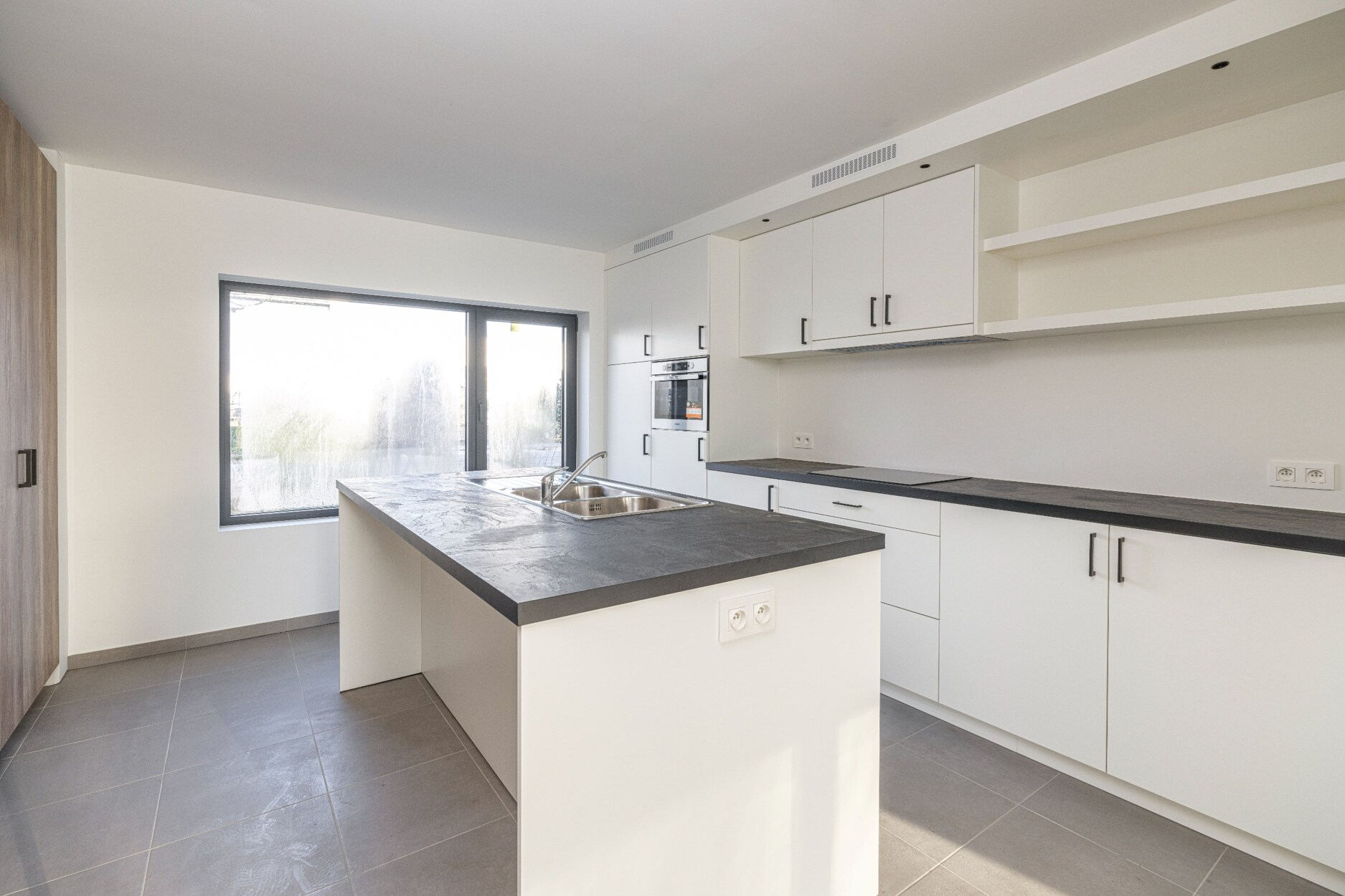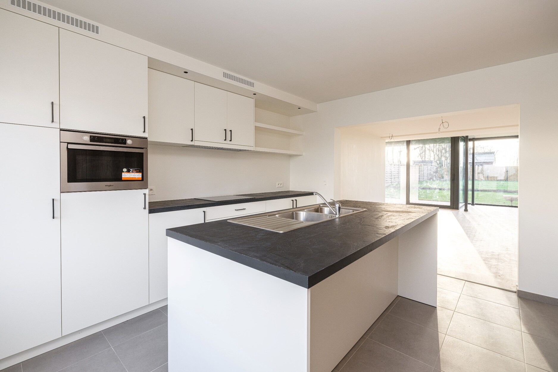 De open keuken is volledig geïnstalleerd met de nodige toestellen (koelkast, diepvriezer, vaatwasmachine, combi-oven en inductievuur) en opbergruimte. Vervolgens is er nog een berging/wasplaats, apart toilet en kelder.
