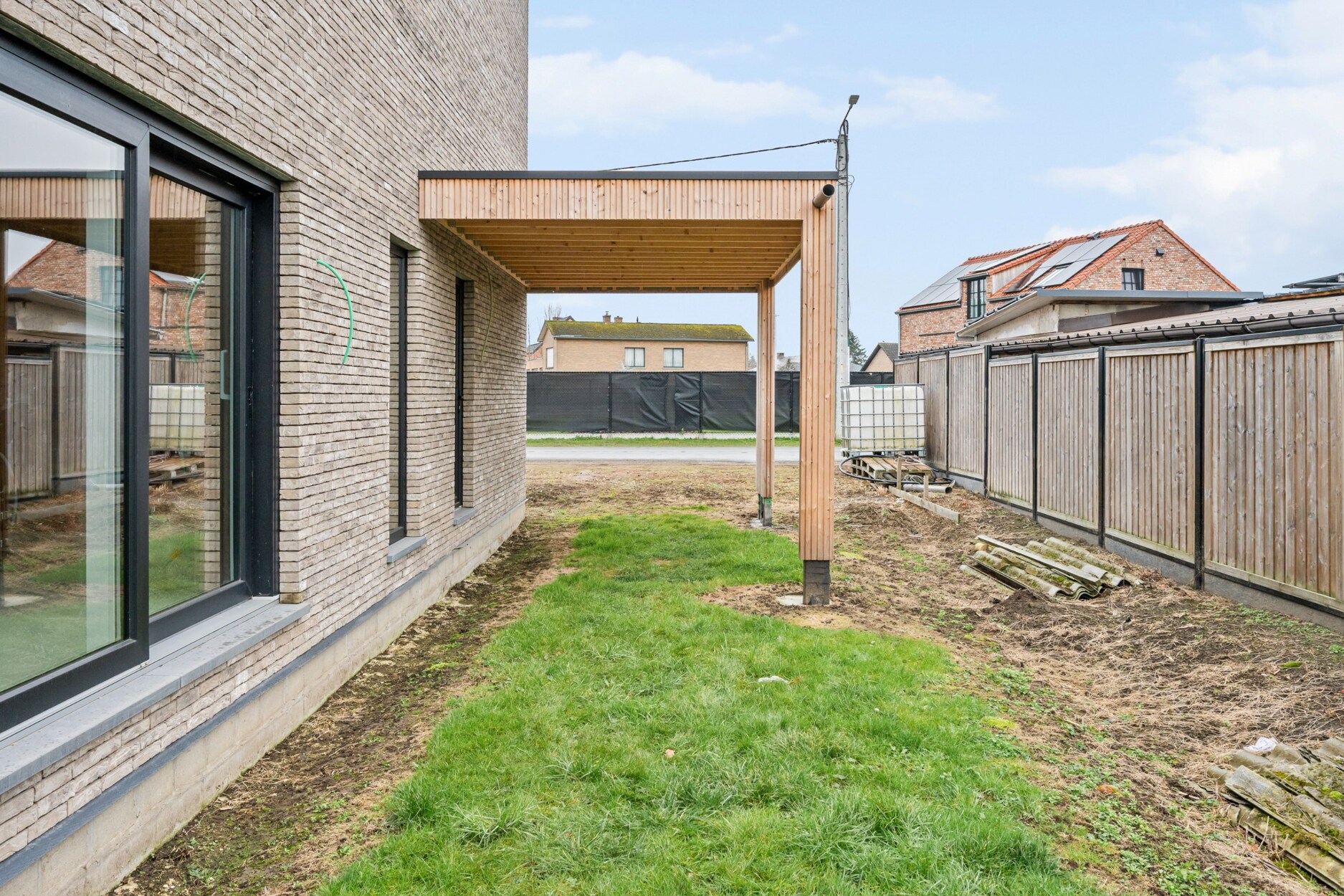 Buiten: carport naast de woning, zwarte draadafsluiting achteraan en tussen de woningen